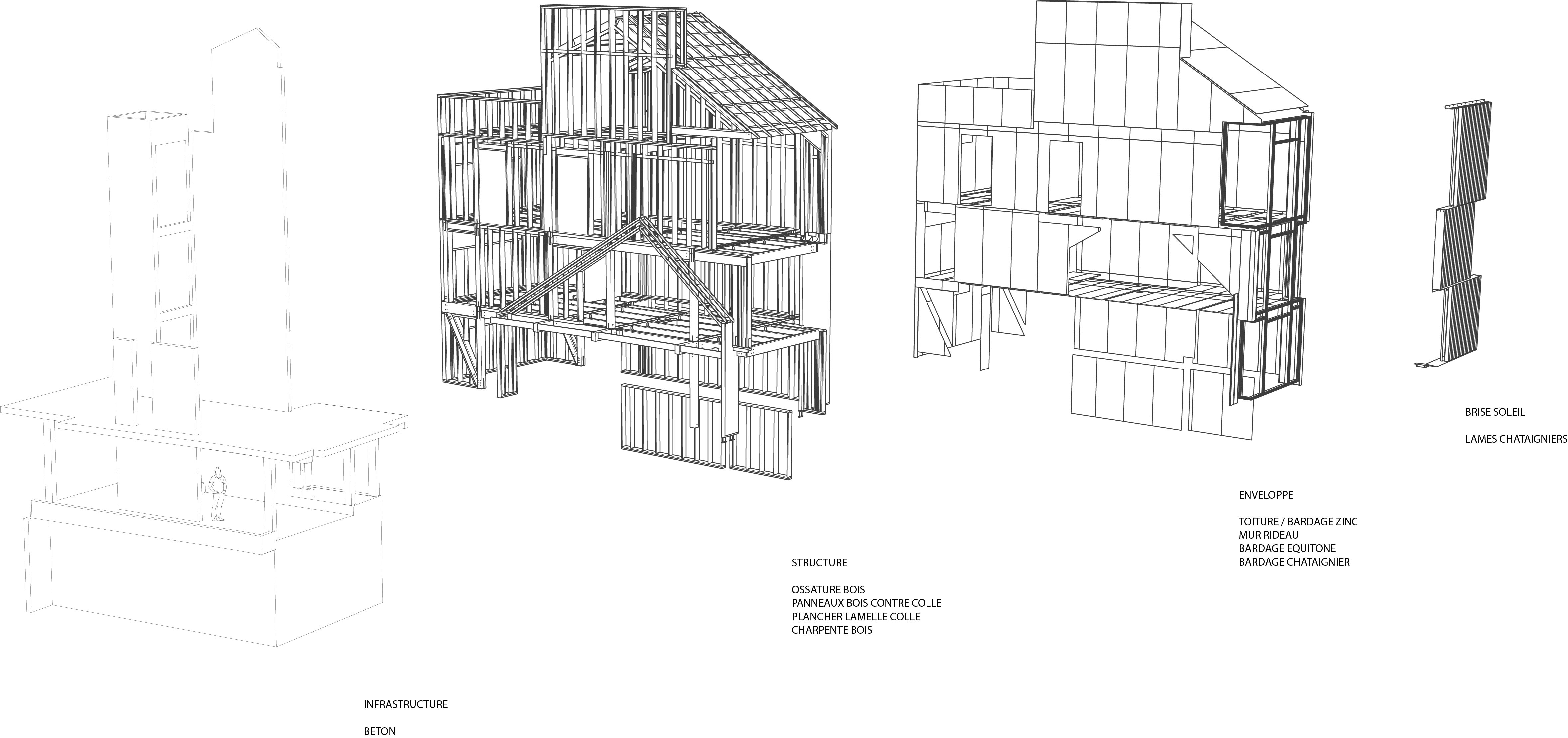 Descriptif technique : En cohérence avec l’architecture de ce quartier moyenâgeux le mode constructif choisi est la charpente traditionnelle et les murs à ossature bois sur une assise en béton, comme les planchers et le noyau vertical. Les menuiseries extérieures sont en aluminium, les façades latérales habillées d’un bardage minéral en fibre-ciment et la couverture en zinc pré-patiné à joint debout. Les façades vitrées sont filtrées sur la rue par une double peau en lames verticales de châtaignier pré-vieilli leur donnant un ton gris argenté. Une grille en serrurerie à lames verticales marque le seuil de la maison