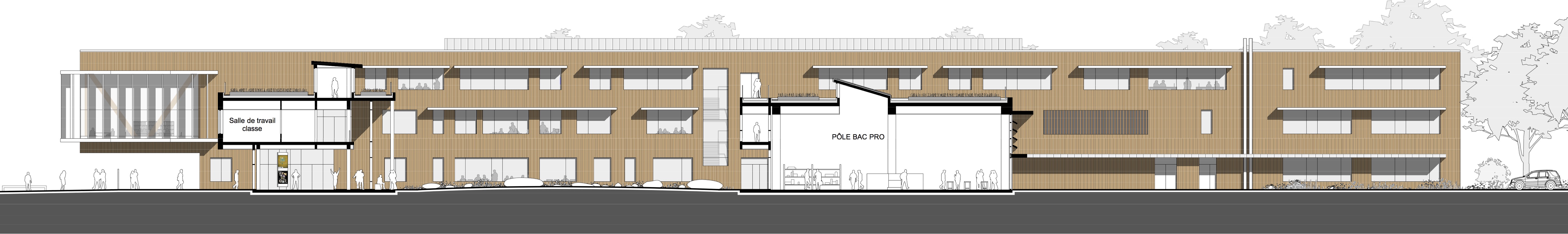 Ce lycée est conçu en dialogue avec la mer et la ville. Son architecture s’inspire de celle de trois bateaux amarrés à quai, ses façades constituées de grandes nervures en bois cintré évoquant les carènes de navires. Les trois bâtiments se déploient sur toute la largeur de la parcelle tel un trident. Le parvis est comme un port d’attache auquel s’arriment les bateaux. La toiture en zinc blanc évoque les grands-voiles. Le CDI en porte à faux de 7m, soutenu par de grandes poutres en treillis bois, s’inscrit dans un double volume qui se projette symboliquement dans l’espace public, vers la mer.