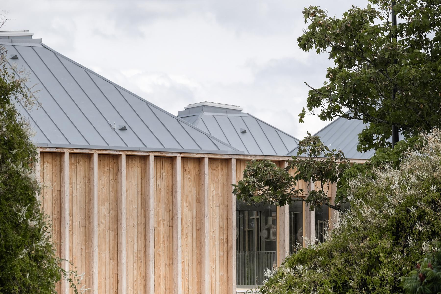 Approche environnementale : Tramée, à l'image d'une série d'arbre, la façade reflète notre volonté de donner à la ville un équipement de santé aux dimensions écologiques en résonance avec les problématiques actuelles. Le bois est omniprésent. D'une part, pour ses qualités durables et sa capacité à emprisonner une quantité importante de CO2. D'autre part, pour sa capacité culturelle à transmettre une image naturelle liée aux valeurs défendues par le projet. L'enveloppe est conçue comme un volume garant d'une climatologie contrôlée et donc du bien-être des usagers.