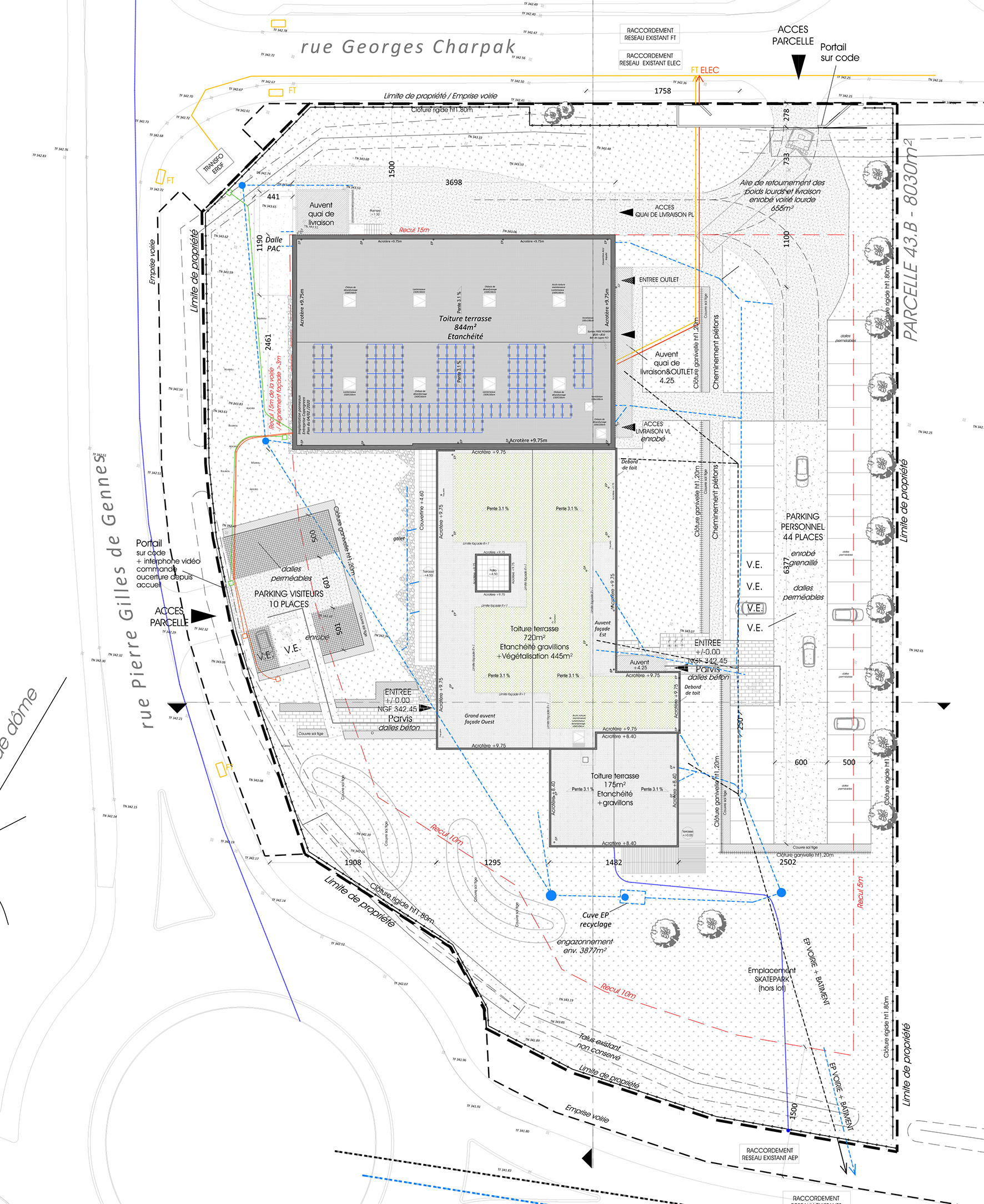 Descriptif technique : Chauffage et rafraichissement: PAC Air / Eau VMC double flux Production photovoltaïque en auto-consommation (40%) Ventilation naturelle possible avec la mise en place d'ouvrant sen soufflet sur chaque menuiseries extérieure. Brise soleil sur l'ensemble des Mext pour le contrôle d'apport de lumière naturelle suivant l'exposition Parking extérieurs en Evergreen pour la perméabilité à l'eau Récupération des eaux pluviales pour l'arrosage des espaces verts