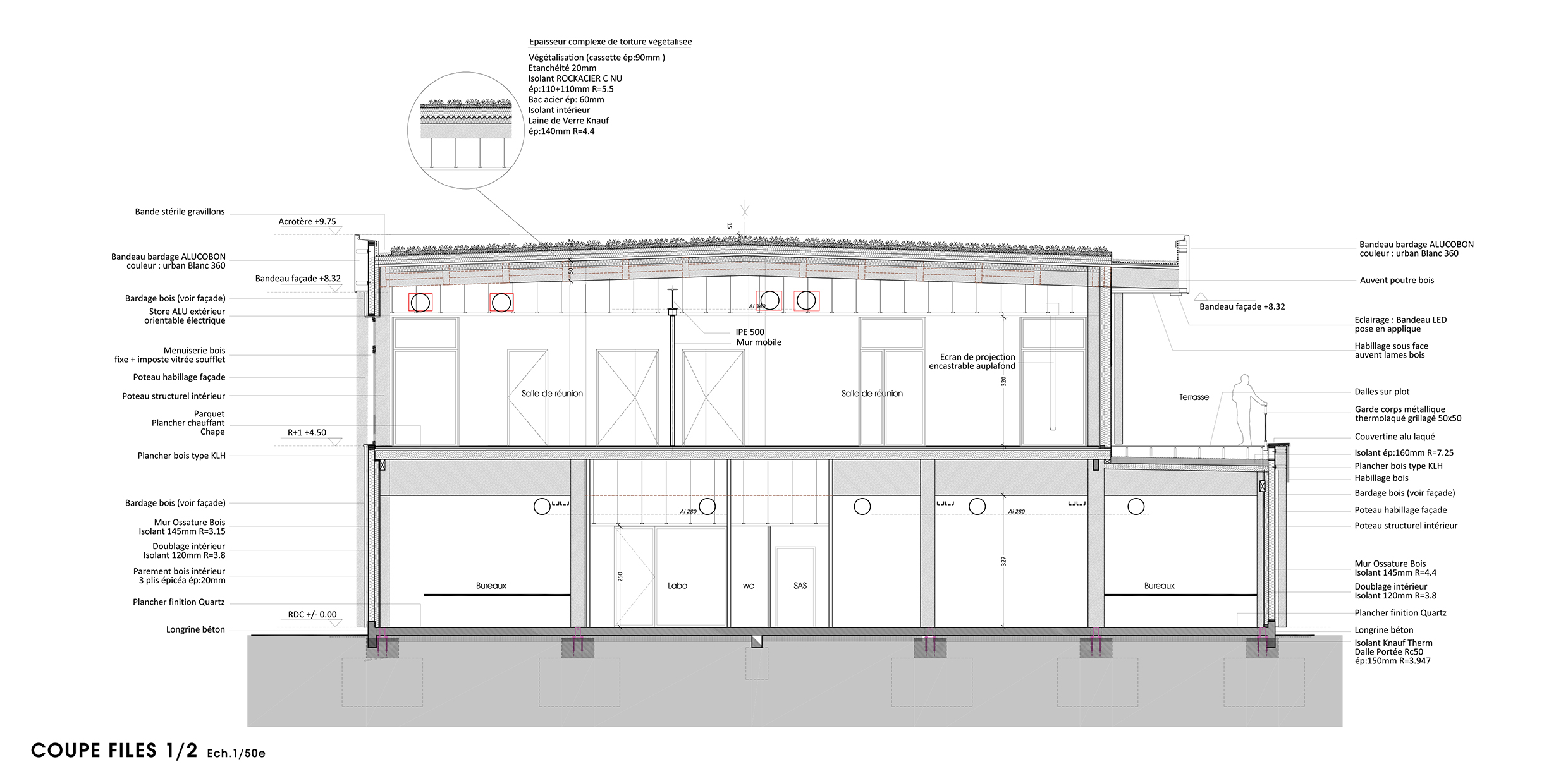 Approche environnementale : Utilisation d'un maximum de bois dans la construction: - pour la structure et le clos couvert (bureaux et entrepôt), y compris les planchers - sol R+1 : parquet contre collé chêne français - doublages intérieurs: panneaux en hêtre - isolation en laine de bois Espaces de stationnements perméables Récupération des eaux pluviales pour arrosage extérieur Production photovoltaïque en auto consommation