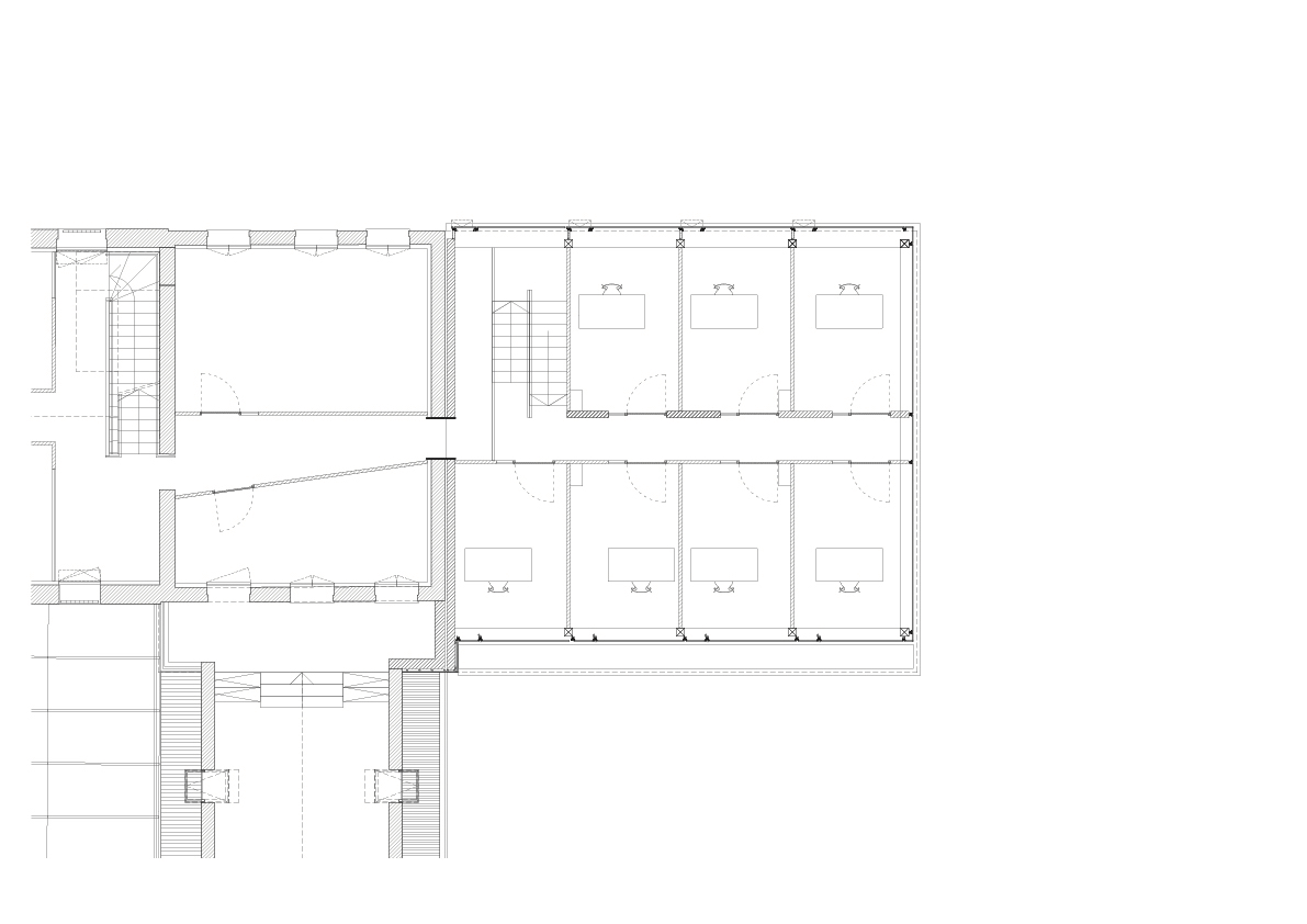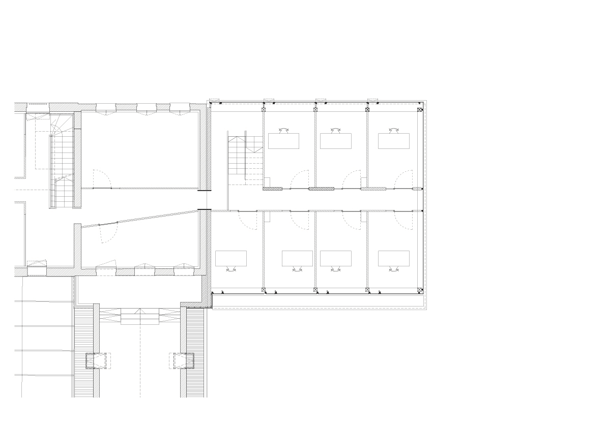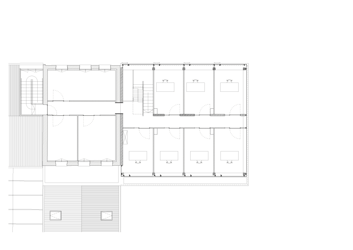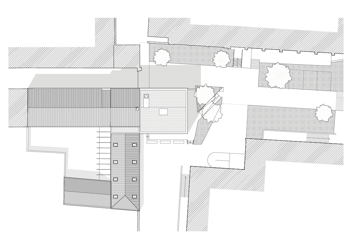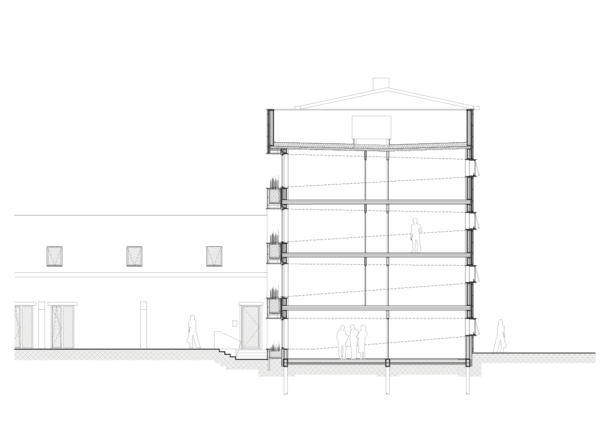 L’immeuble Sainte-Philomène se situe au cœur du campus de l’Université Catholique de Lille, au croisement de flux qui mènent vers différents pôles d'enseignement. Dans un contexte dense, l'extension de l'immeuble administratif revêt une posture délibérément urbaine en se positionnant à la proue du complexe bâti et dans la perspective d'un axe de circulation. Les quatre niveaux du projets marquent des strates par l'alternance de bandeaux de bois et de vitrages dont la géométrie et le positionnement dans l'épaisseur de la façade évoluent en fonction des contextes et de la course du soleil.