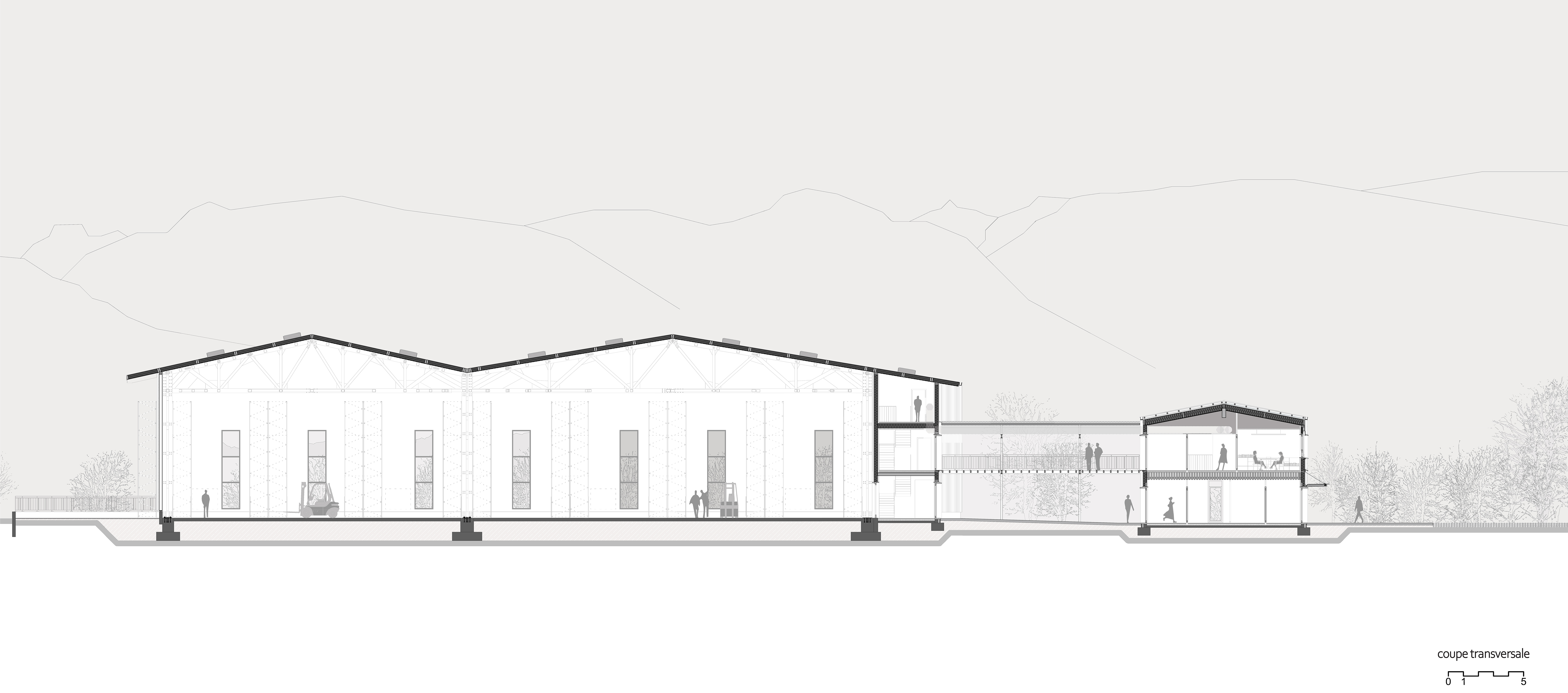 Approche environnementale : L’entrepôt se veut le plus sobre écologiquement et confortable possible, notamment en période estivale. L’ensemble a été traité avec soin en termes d’isolation et d’étanchéité à l’air, sans faire de compromis sur sa pérennité et sa fonctionnalité, sa facilité d’entretien et son évolutivité. De plus, pour limiter la surchauffe d’été un système de ventilation naturelle automatisé a été mis en place. En bout de chaque allée, de grandes fenêtres cadrent des vues sur l’espace naturel avoisinant, complétant ainsi les lanterneaux qui permettent une autonomie en lumière naturelle pour le personnel.