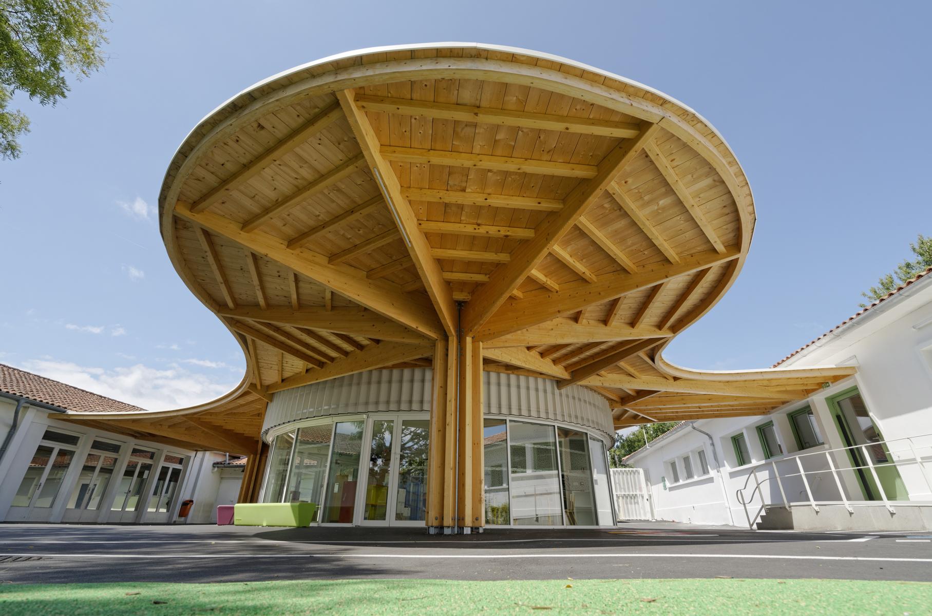 La réalisation consiste en la création d’une connexion entre les entités du groupe scolaire reliant l’ensemble des bâtiments, anciens et nouveaux. Ce nouveau lien s’exprime en un auvent bois qui s’élargit pour former des espaces couverts de préau en maternelle puis en élémentaire. Un nouvel accueil périscolaire est implanté dans la cour maternelle comme un grand carrousel autour duquel se déploient 2 fleurs-préaux, il se prolonge en cour élémentaire pour donner une extension au préau fermé ;il se poursuit enfin pour donner accès aux nouvelles classes élémentaires et à la restauration scolaire