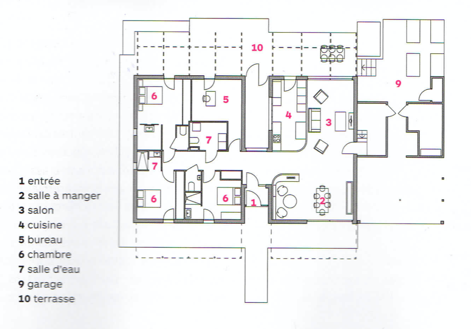 Approche environnementale : La construction est en ossature bois jusqu'à la dalle bois du RDC qui flotte au-dessus du terrain. Un moucharabieh sépare les espaces dédiés à l'intimité (chambres, salle de bain) et les espaces de partage (cuisine-salon). Une serre se situe entre les deux volumes en bois. De grands toits débordant portent ombre sur les larges vitres. Le confort d'été est complété par un miroir d'eau qui renvoie la lumière du Nord et rafraîchit ce coté de l'habitation. Le jardin de plantes autant champêtres qu'exotiques fait le lien avec la campagne alentour.