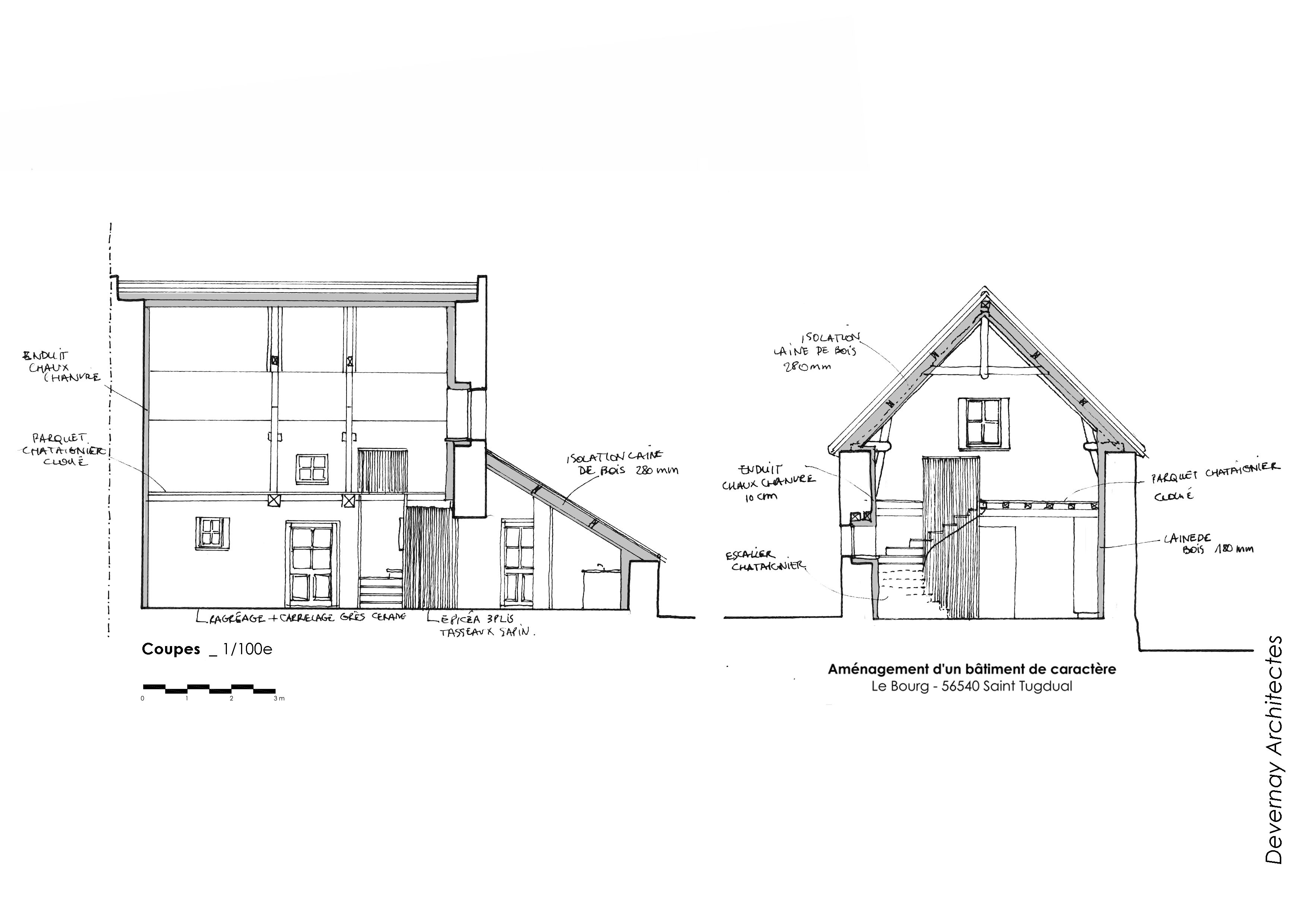Approche environnementale : Améliorer la performance énergétique de cet habitat du XVIIIème avec des isolants bio-sourcés (laine de bois, chanvre) et privilégier l’usage de bois local avec du châtaignier pour l’escalier, épicéa 3 plis pour les cloisons & portes, chêne pour le parquet.