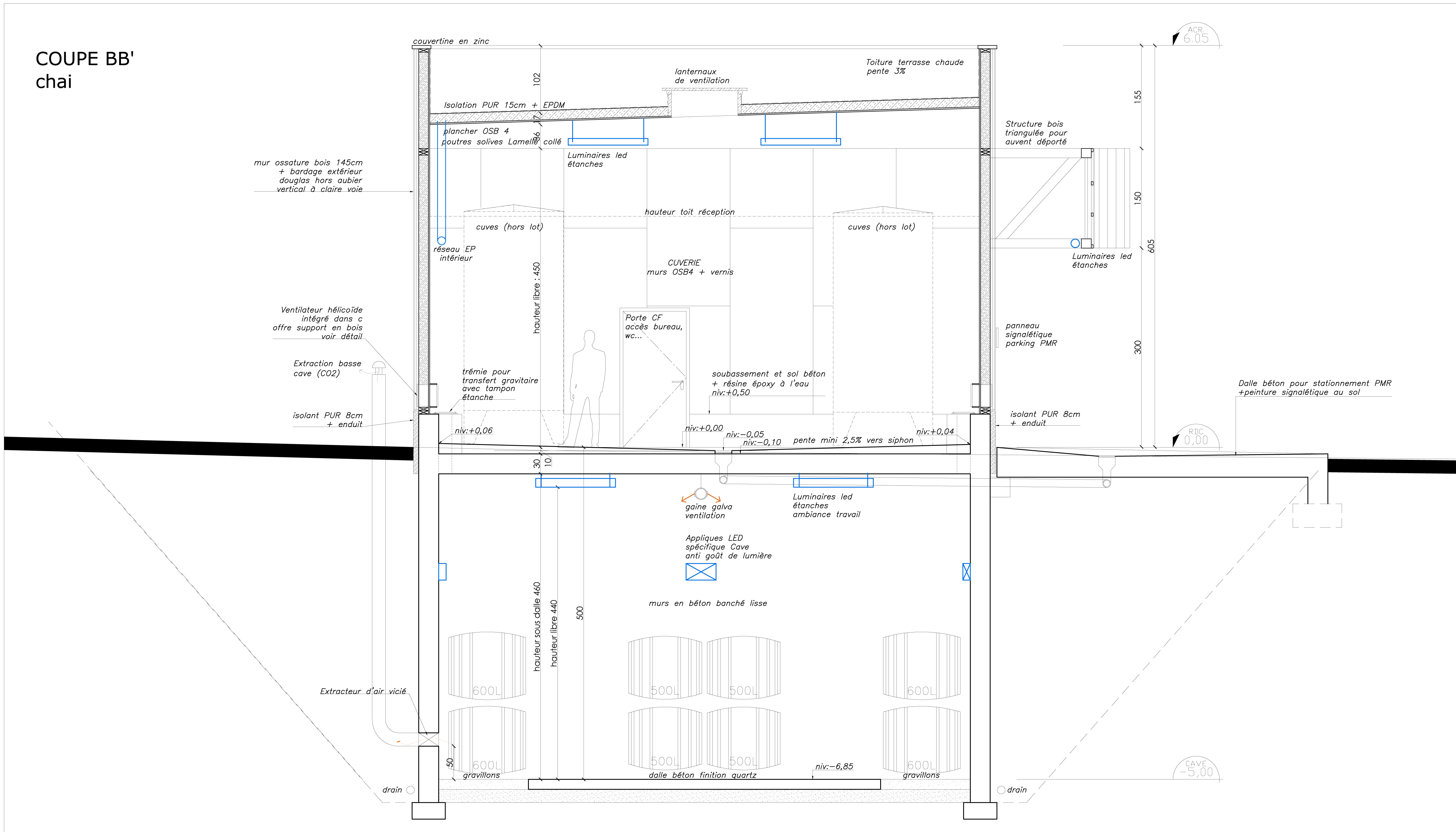 Descriptif technique : Le bâtiment est construit sur deux niveaux : Au sous-sol une cave enterrée de maturation et de stockage profite de l’inertie thermique,de l’humidité et la fraicheur naturelle du sol. Cette cave est ventilée et rafraîchie par un puits canadien. Au rez-de-chaussée une superstructure en ossature bois abrite le hangar, la cuverie, les locaux du personnel et l’accueil du public. Malgré les ventilateurs de façade permettant un bon brassage de l’air, le maître d’ouvrage a souhaité l’installation d’une climatisation.afin de maintenir les températures constantes pendant la période de vinification.