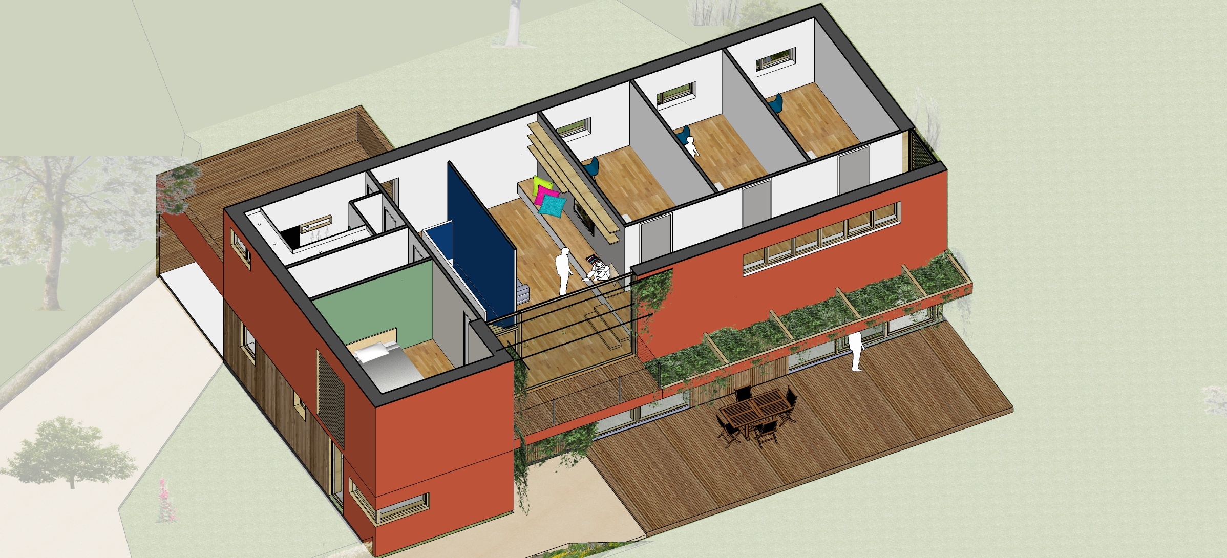 Cette maison de 250m², située au nord de l’Yonne, fait partie d’une ferme, dont elle est la résidence principale. Longère moderne, sa forme compacte et allongée orientée plein sud, ses larges baies vitrées, son poêle à bois, sa ventilation à récupération de chaleur, sa structure bois et son isolation en paille et laine de chanvre lui assureront une autonomie énergétique totale. La partie jour est de plain-pied avec la prairie, les chambres à l’étage bénéficient d’un balcon faisant un brise soleil pour le rez-de-chaussée. Un bureau ouvre sa fenêtre allongée vers la ferme.