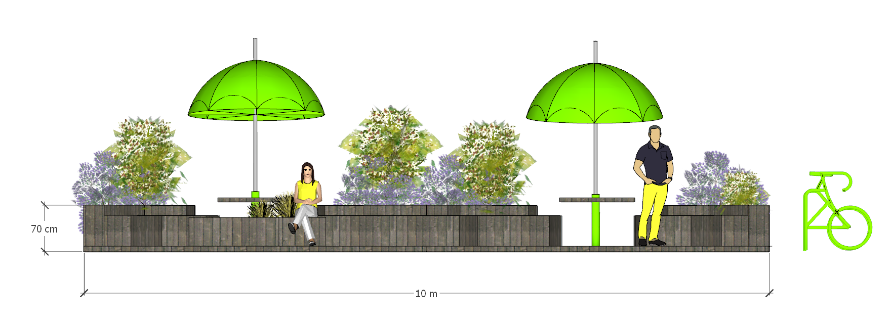 Avant, 2 voitures pouvaient stationner. Désormais, ce sont 4 vélos que l'on peut garer. Les habitants et les passants peuvent profiter de la terrasse à l'ombre des parasols pour se détendre, lire, travailler à table, sentir les fleurs – produites à quelques kilomètres d'ici…. Et même : jouer aux dames et aux échecs !