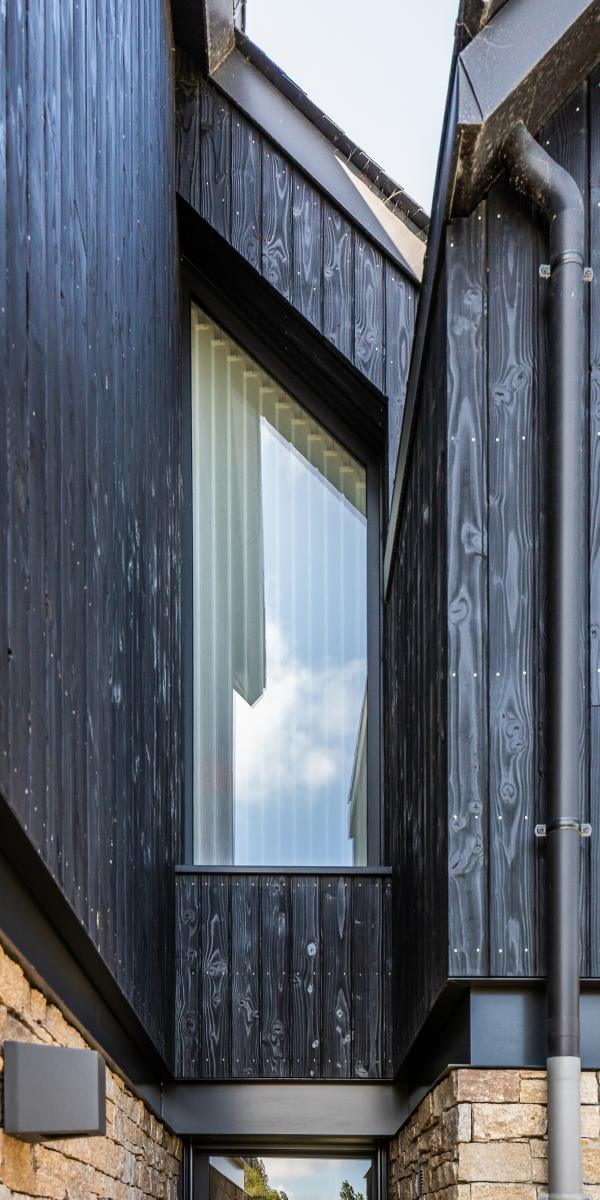Un volume noir en bois brûlé et au profil traditionnel, se pose sur un socle en maçonnerie de pierre. Une grande casquettes brise soleil en lames de métal noir sépare les 2 niveaux et prolonge la dynamique des volumes décalés sur la longueur de la parcelle. Les éléments de clôture du jardin (murets en pierre et claustras métal) jaillissent des lignes de construction de la maison et délimitent simplement les espaces privé et publics. Étirée sur la longueur du terrain, la maison et les terrasses s'ouvrent largement au Sud.