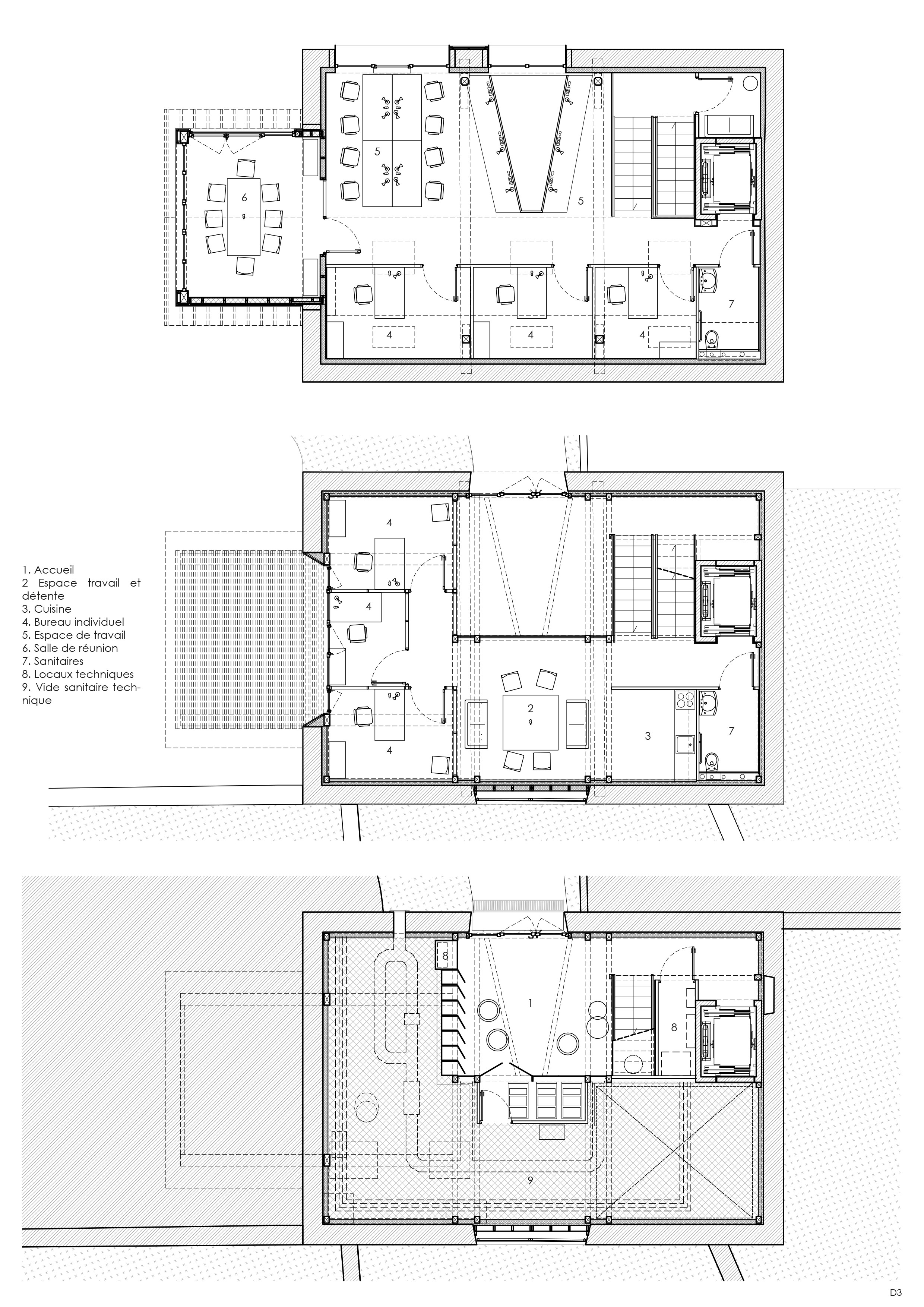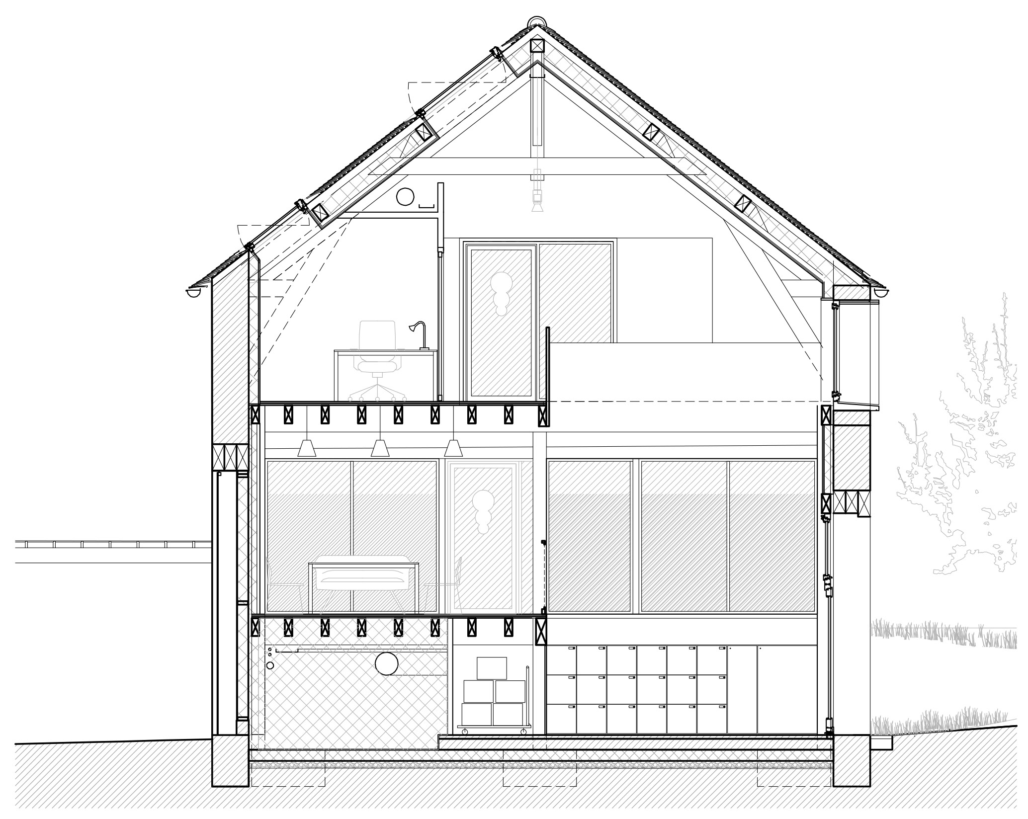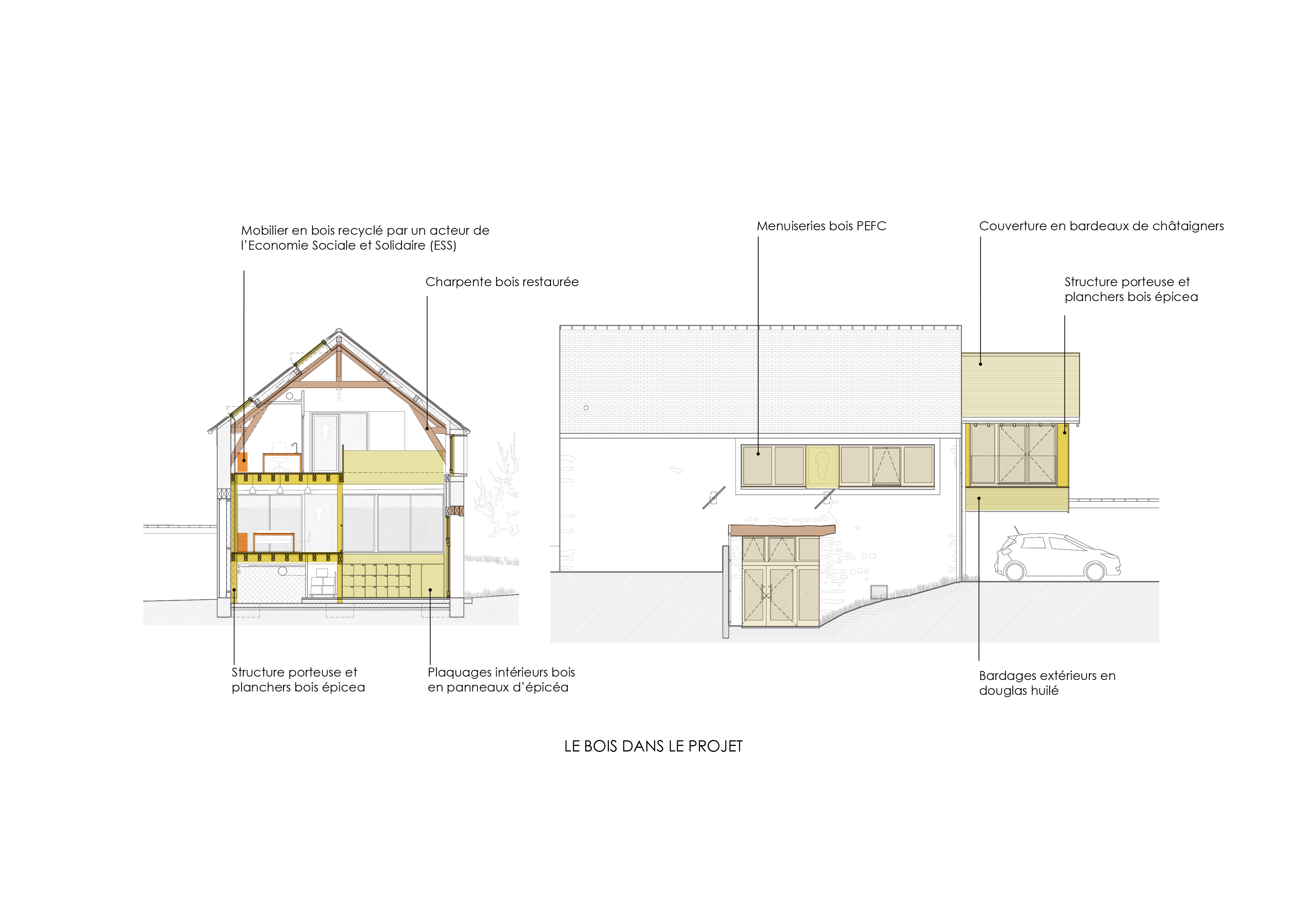 Descriptif technique : L'usage des matériaux biosourcés et le réemploi des structures existantes sont fondateurs dès la conception et le projet a bénéficié du programme Réflexe bois-biosourcé de la région IDF. Sont mis en œuvre : une charpente en épicea, poteaux BMR et poutres BLC, plancher OSB-Fermacell, des menuiseries bois PEFC, une couverture en bardeaux de châtaigner, des bardages extérieurs douglas huilé, une isolation intérieure en béton de chanvre projeté (12cm) et laine végétale (chanvre, lin, coton 20cm), des doublages en panneaux d’épicea, un revêtement de sol à base de lin, des meubles en bois recyclé. PEFC (Gestion forestière durable) FSC (Gestion forestière responsable) Marquage CE