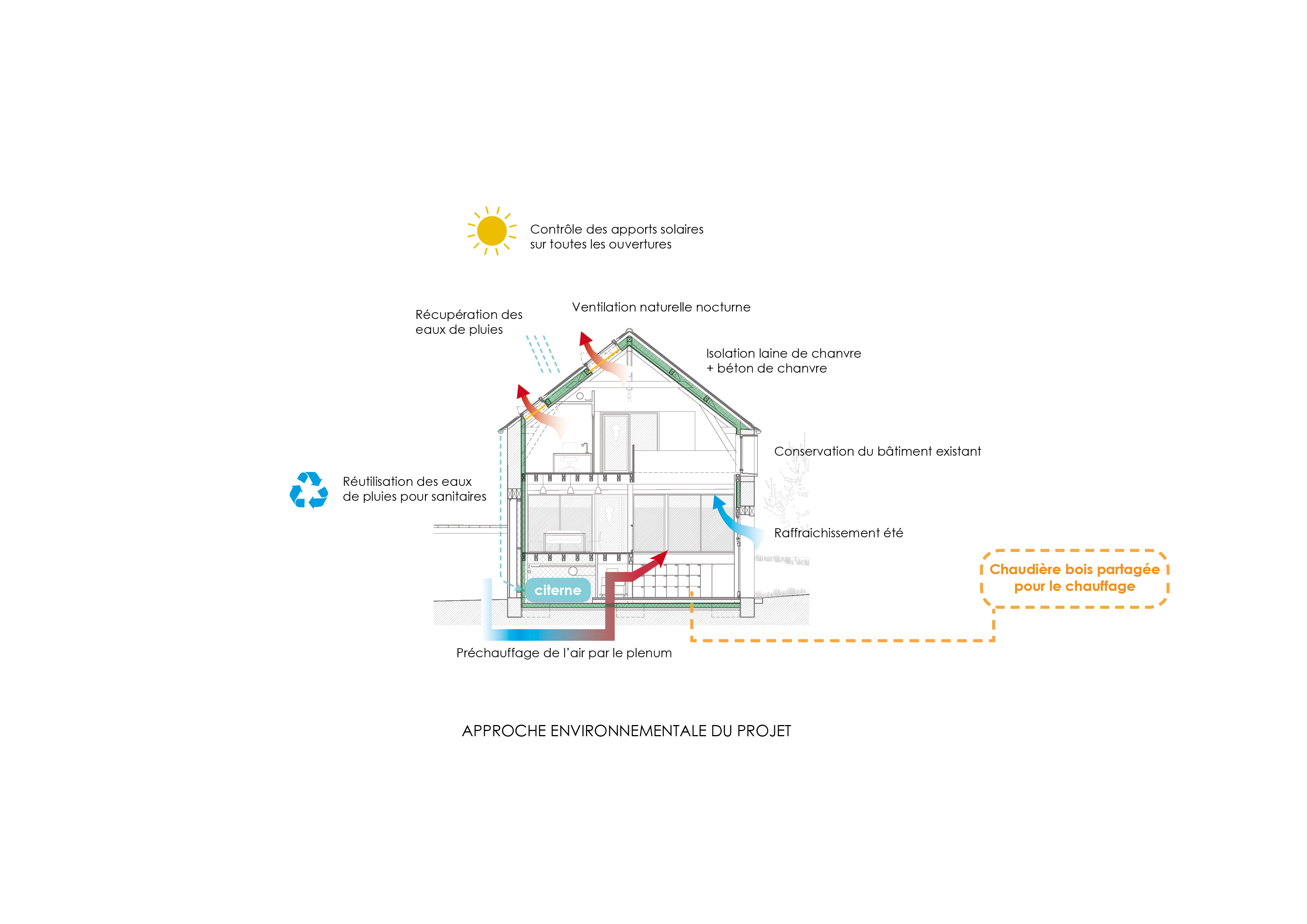 Approche environnementale : Le projet croise techniques modernes et savoir-faire traditionnels et ces choix participent à la limitation de l’empreinte écologique, au confort thermique et aux qualités des ambiances intérieures. Béton de chanvre sur maçonneries anciennes, charpente existante conservée, ossature neuve conçue pour s'insérer dans l'existant, ventilation naturelle, préchauffage de l'air neuf, récupération des EP pour les usages sanitaires, mobilier en bois recyclé par un acteur de l'ESS et bornes de rechargement de véhicules électriques font du projet une vitrine de l'approche environnementale du PNRGF.