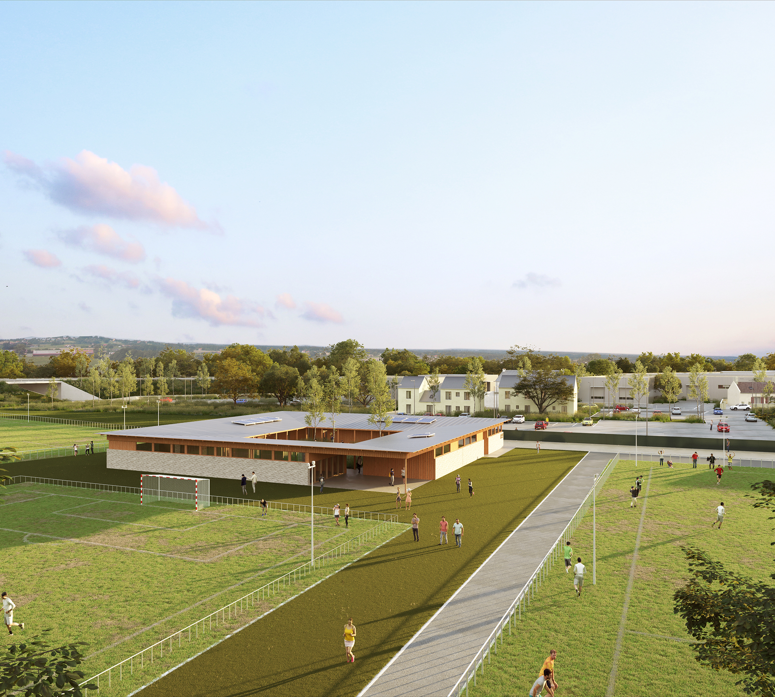 Le bâtiment prend place sur un socle carré, situé à équidistance du terrain d’honneur et du terrain d’entrainement. Le programme est divisé en quatre bâtiments rectangulaires qui s’articulent autour d’un patio ouvert. Une toiture à simple pente vient relier les quatre entités qui peuvent fonctionner de façon autonome. Cette disposition permet aux vestiaires d’être protégés des vues directes depuis les terrains de football tout en offrant un espace plus intime pour les manifestations du club-house. Ce dernier s’ouvre sur une terrasse couverte, d’où les supporters peuvent observer les matchs.