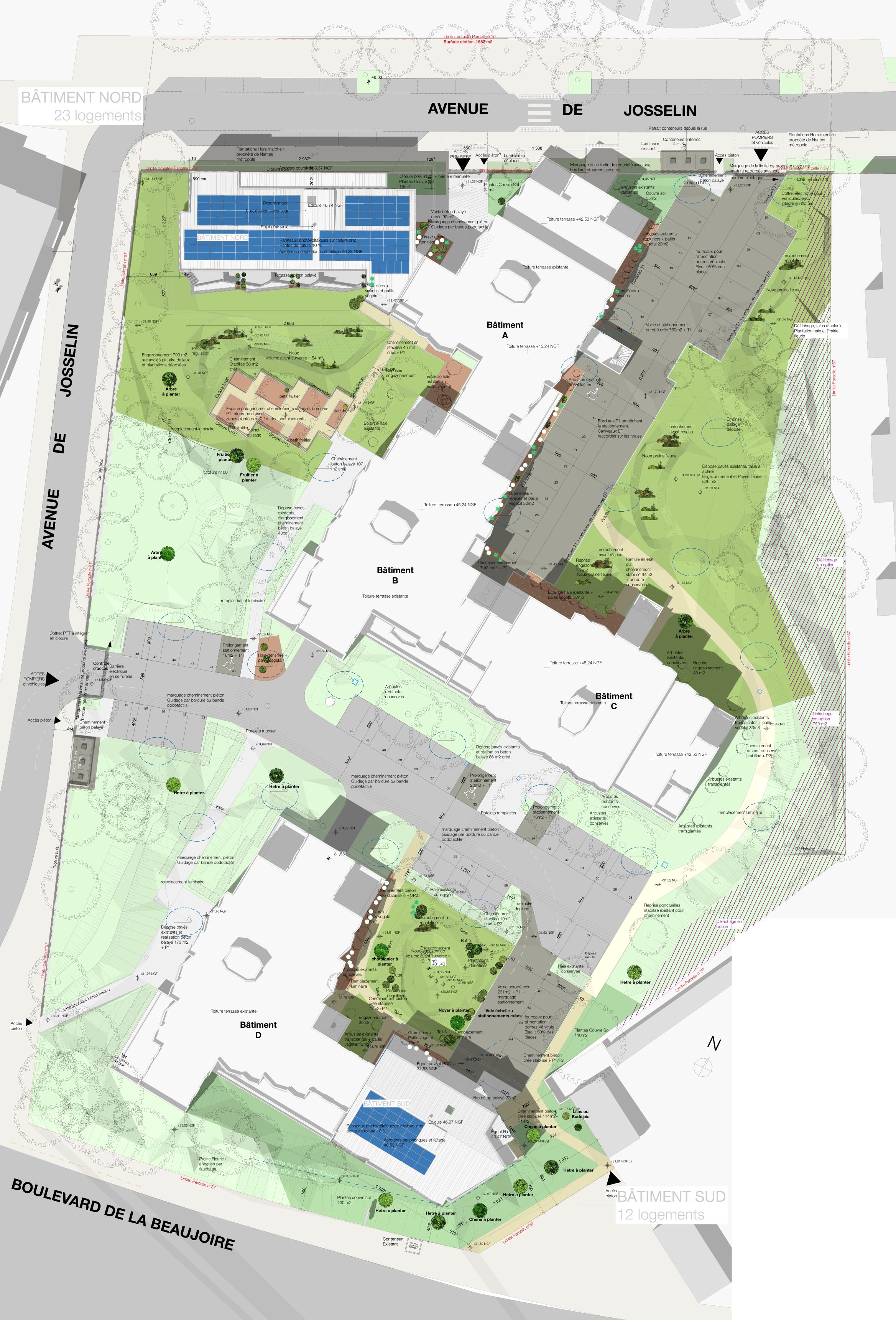 Le projet consiste en la construction de 2 immeubles. En concertation avec Nantes Métropole, une réflexion a été engagée pour densifier le tissu de la ville. Le projet a été conçu en harmonie avec l’existant. Sa façade Sud se caractérise par le rythme des balcons, dont la géométrie dialogue avec celle des façades des autres immeubles. L’ensemble des logements bénéficient de vues dégagées, sans masquer celles de ceux existants. Un jeu de pare-vues et de garde-corps en tassautage bois font vibrer la façade et propose un spectacle d’ombres et de lumière.
