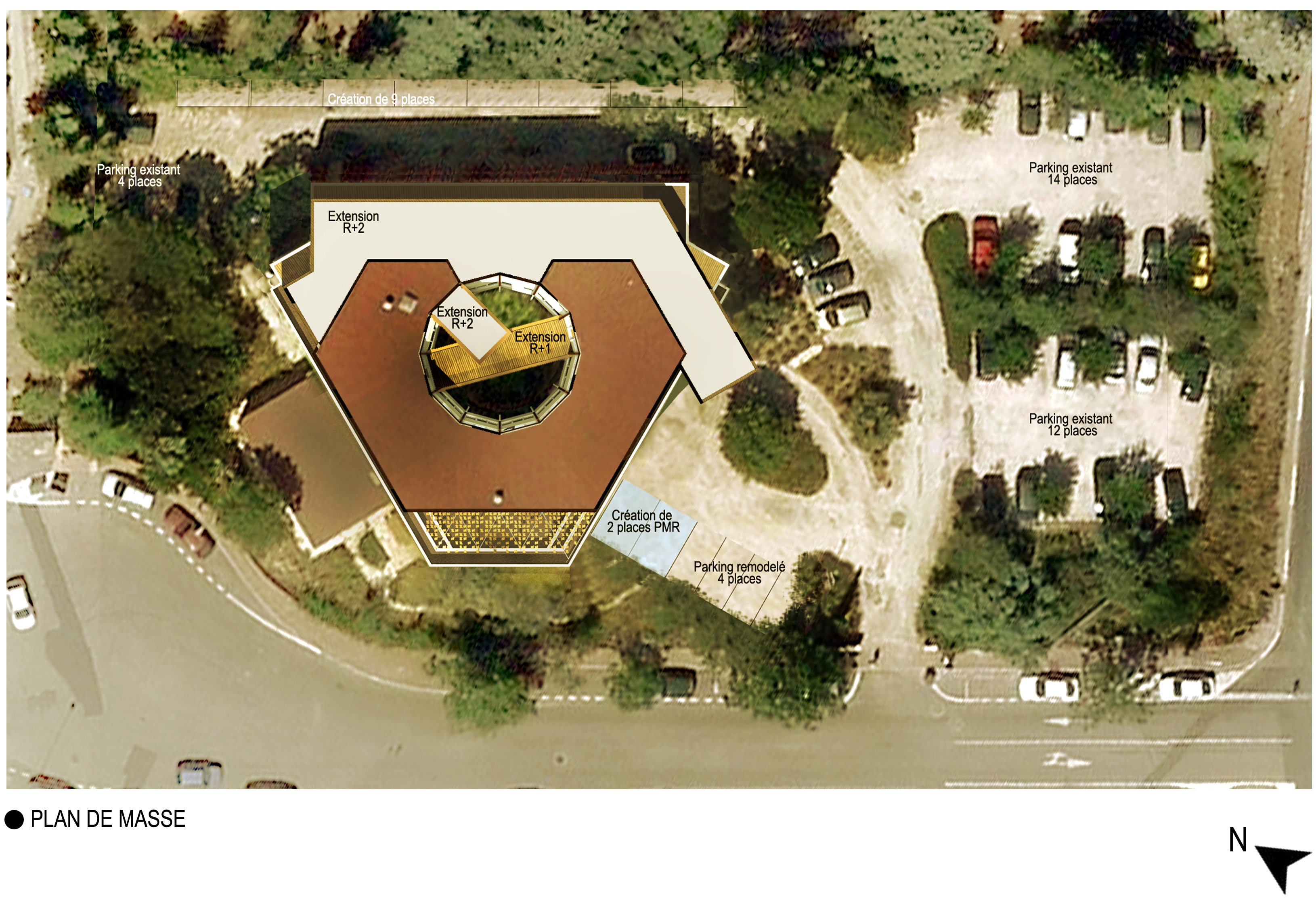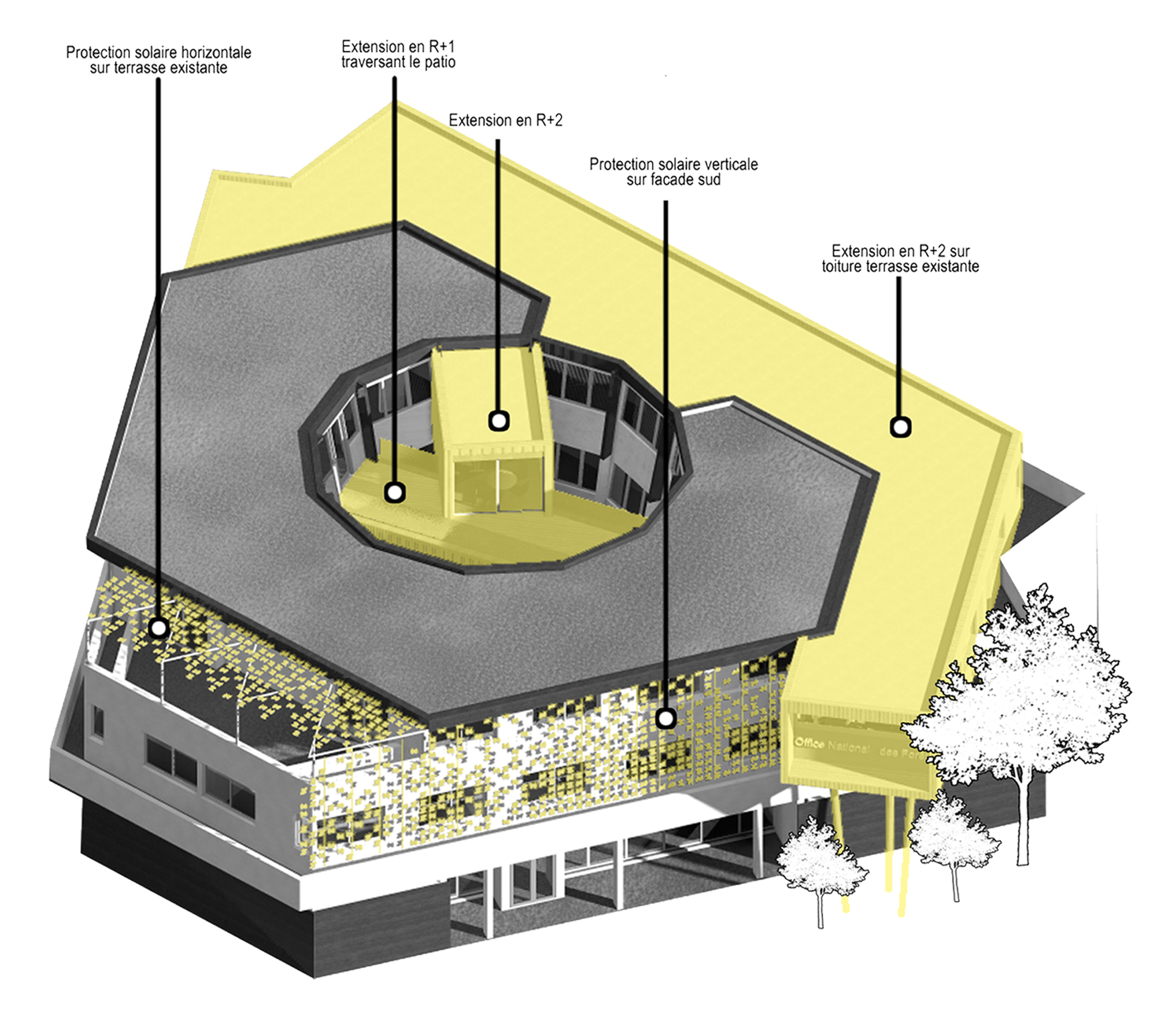 Le projet consiste à l'extension en surélévation d'un bâtiment de bureaux destinés à l'agence territoriale d'Occitanie de l'Office Nationale des Forêts (ONF) située à Montpellier. Cette opération doit regrouper les agents de Montpellier et de Toulouse suite à la fusion des régions. Notre proposition consiste à exploiter au mieux le potentiel du bâtiment existant datant des années 80 qui possède une partie en toit terrasse que nous avons investit pour créer une surélévation en connexion avec le R+2 existant pour la création de 11 bureaux supplémentaires, et 3 bureaux créés en passerelle dans le patio existant, réalisés en modules préfabriqués.