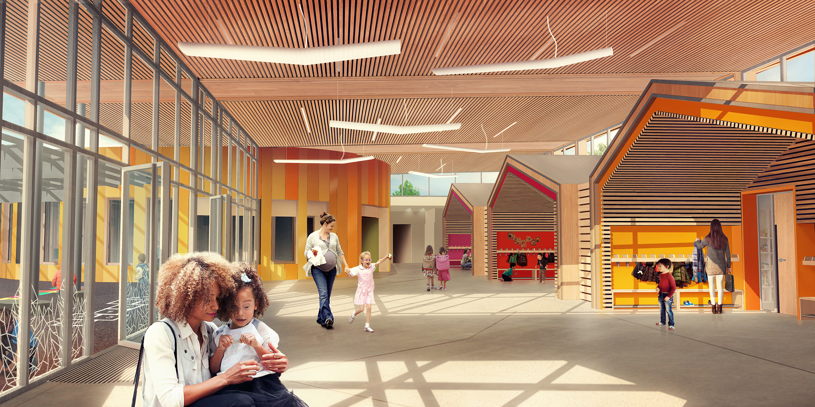 Afin de proposer une école durable et agréable pour les enfants, nous avons situé les entrées du bâtiment (maternelle et accueil de loisirs sans hébergement) le long d'un cheminement piéton. Passé l'entrée dans le site, l'établissement se laisse découvrir dans son intégralité avec un auvent qui accompagne le cheminement jusqu'à l'entrée sous un préau. Le grand hall abrite une rue intérieure qui dessert les différentes salles de classes représentées par des « cabanes » aux couleurs différentes et identifiables facilement par les enfants. Au centre du bâtiment, la salle de motricité fait la jonction entre l'école et l'accueil de loisirs, il offre un volume coloré, aux tons chauds et aux formes simples à l'image de l'ensemble du bâtiment.