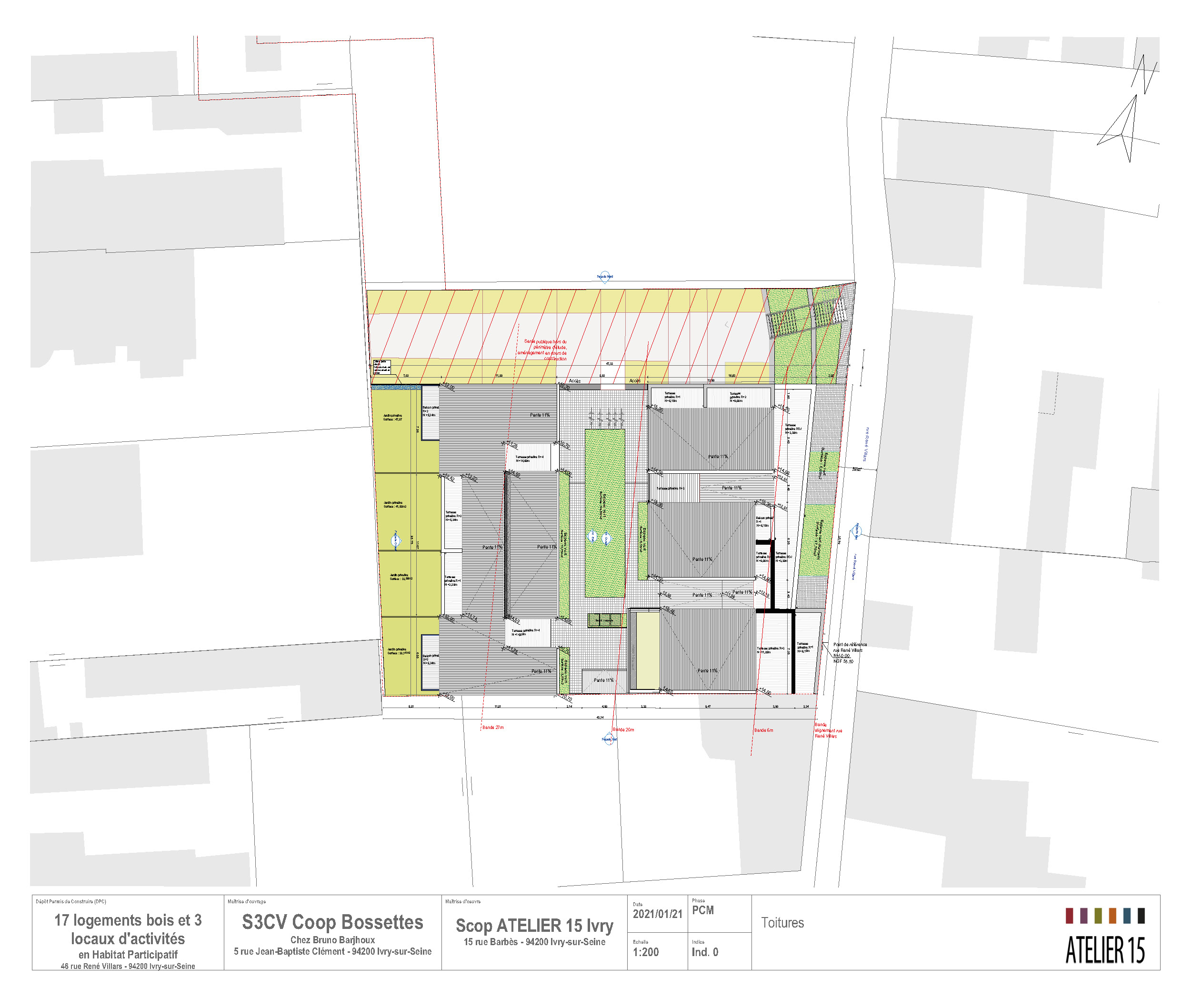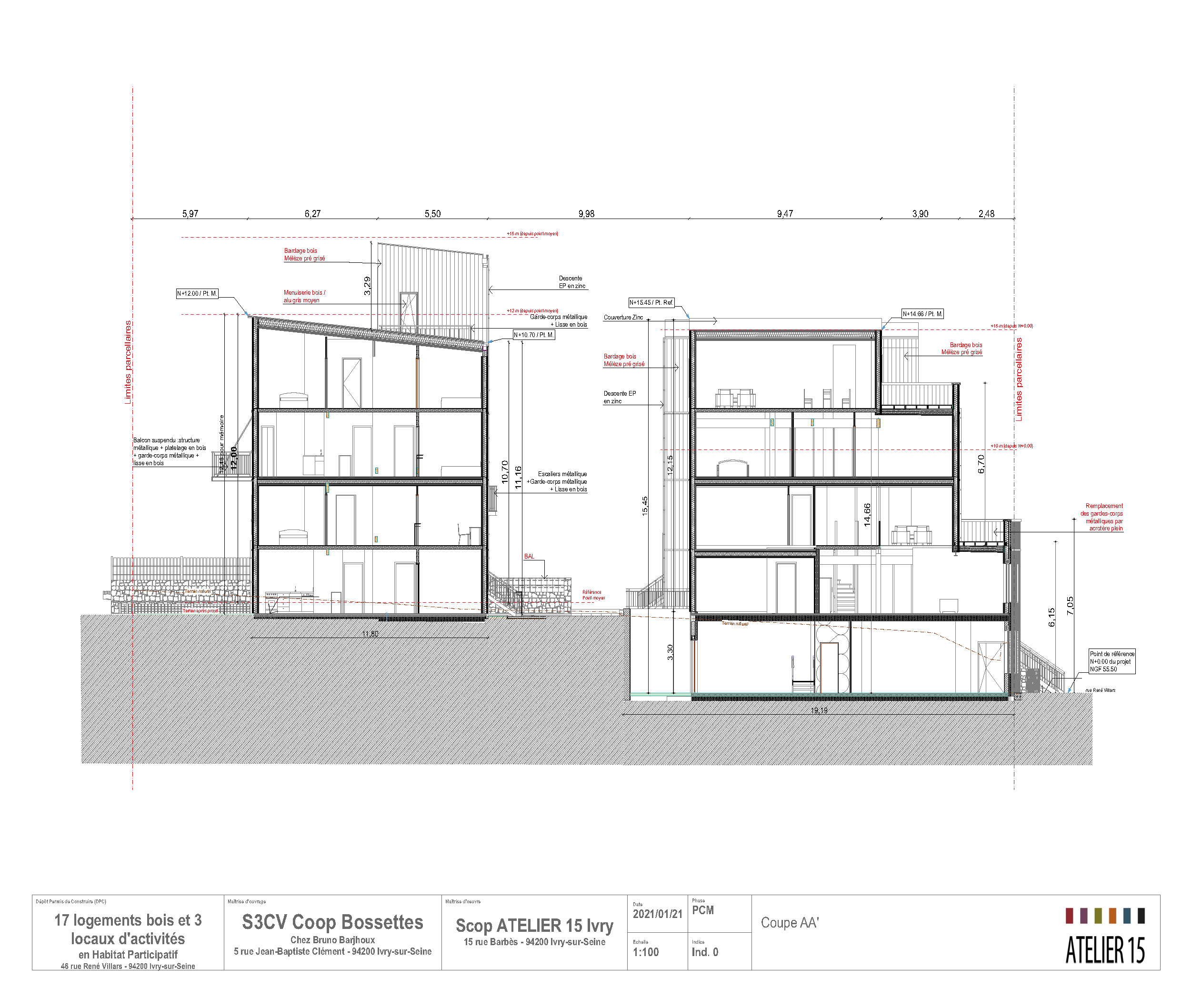 Descriptif technique : Le programme vise le passif sans labellisation Tout bois, la complexité a été de répondre avec un immeuble gradin à la singularité d'un programme en participatif, laquelle nous a amené à entremêler les systèmes constructifs issus des filières sèches : bois et acier. • En filière sèche bois : parois périphériques bois Sybois sous avis technique visant une intégration maximale - menuiserie, PV et PP ainsi que la vêture brique et le bardage bois, refend bois en CLT et portique bois LVL et massif • En filière sèche acier : portique et escalier ext. acier • EN CVC : VMC Double Flux Zenhder