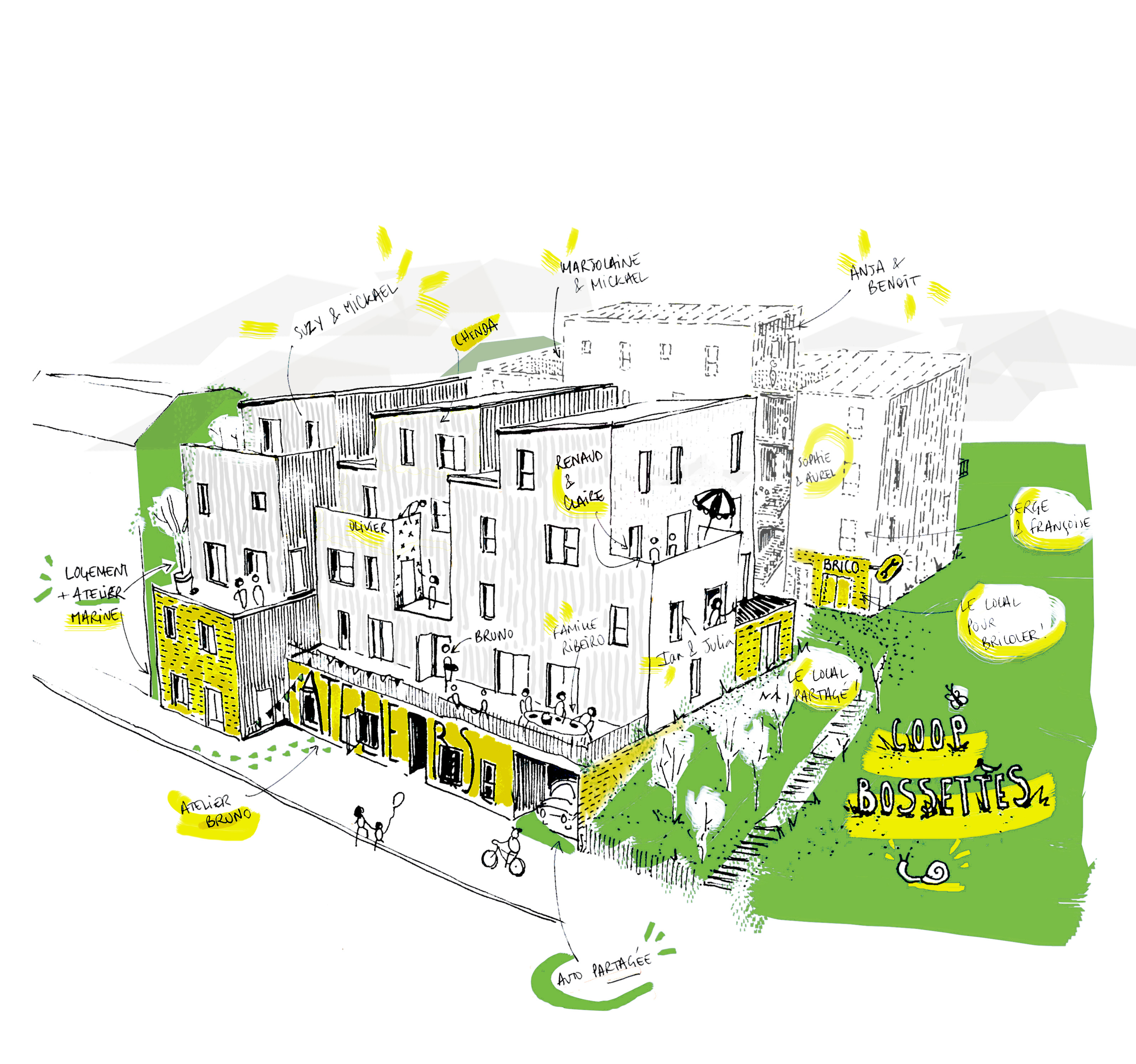 Dans le futur parc habité Villars, l’association Coop Bossettes a mené un programme mixte habitat-activité, favorisant les mixités programmatique et sociale Le programme, la construction, le chantier comme autant d’espaces, propices à mettre en œuvre une véritable démarche décarbonée autour du bois La mixité programmatique, habiter, travailler, échanger, réduisant les impacts carbones L’hybridation constructive, concilier système préfabriqué bois industrialisé et singularité de la co-conception des logements Le chantier, un moment d’intelligence collective et de négociations ouvertes