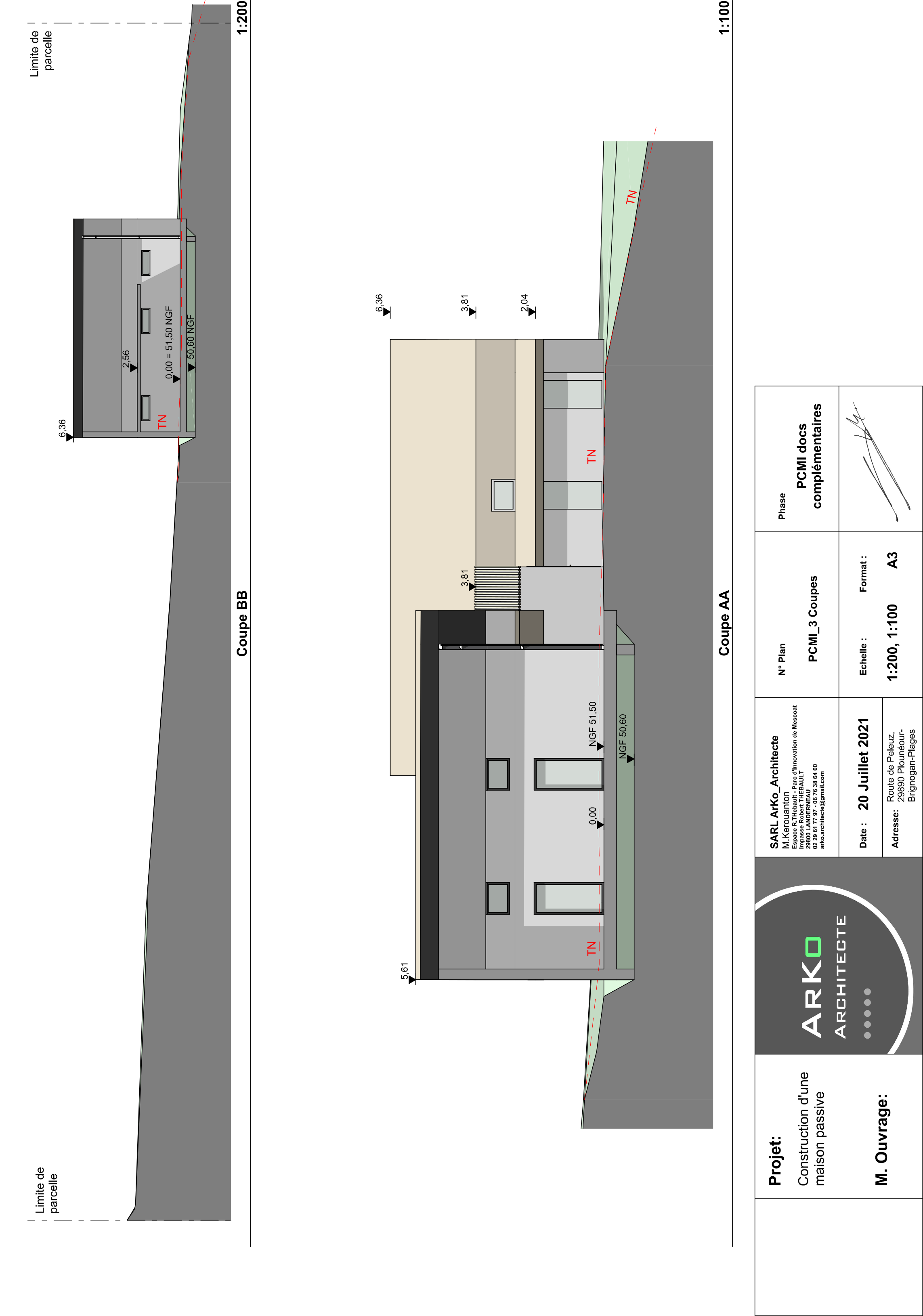 Approche environnementale : Compactes, passives et bio-sourcées, les deux maisons visent à limiter le recours aux matériaux traités et générateurs de déchets non réutilisables ou valorisables autres que par incinérations. La déconstruction est prise en compte dès la conception des modules pré-fabriqués. L'eau de pluie est captée sur l'ensemble des toitures et stockée sous le jardin d'hiver. Elle alimentera les toilettes des deux maisons et le jardin.
