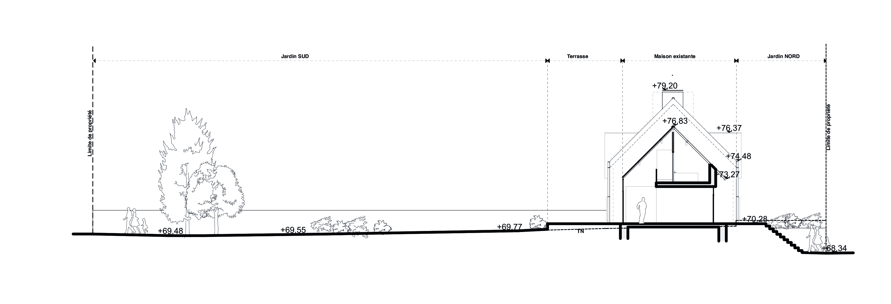 Une cloison technique servant de tampon acoustique et de rangement pour la cuisine (intégration vaisselier et frigo) est créée et sert de limite séparative entre les zones techniques positionnées au nord (sur la rue) et la pièce de vie en double hauteur (salle à manger et cuisine). Cette cloison est totalement habillée de panneaux bouleau et calepinée afin d'intégrer du mobilier de cuisine et une porte coulissante encastrée toute hauteur. Cet ensemble sert de décor à la cuisine et répond aussi à des besoins techniques.