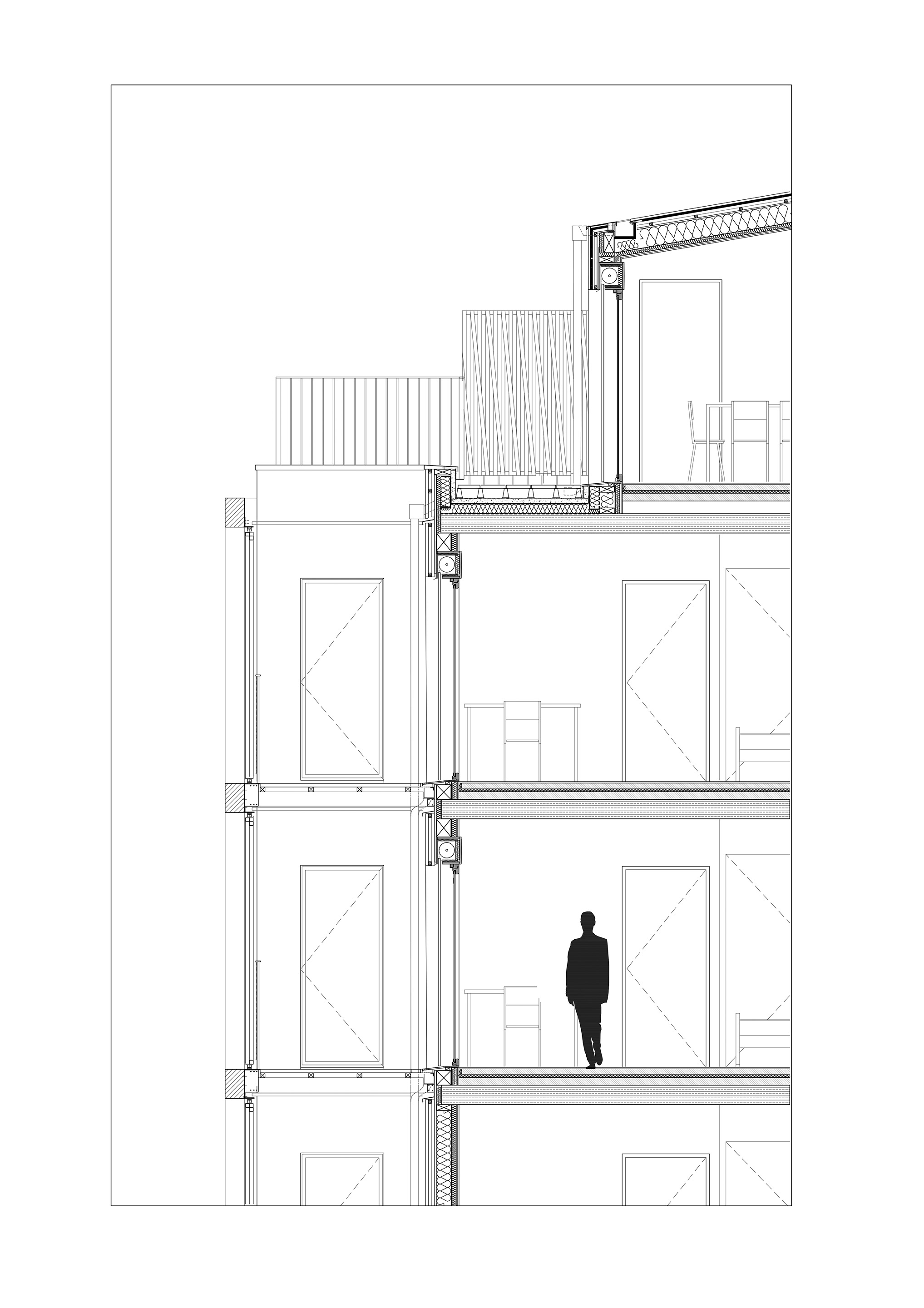 Descriptif technique : Avec une épaisseur de 13m et des trames de 6m, le bâtiment est conçu pour une construction en bois avec des noyaux béton pour les circulations verticales. Nous évitons au maximum les relevés d’étanchéité ou tout autre ouvrage susceptible de fuites. Les terrasses étanchées sont évitées au profit de balcons rapportés. Les toitures sont couvertes de zinc et les débords de bâti se superposent. La volonté de mettre en avant le matériau bois se retrouve également au cœur des logements dans lesquels nous avons fait le choix de laisser le CLT visible dans les pièces sèches, comme un manifeste. PEFC (Gestion forestière durable) NF Logement Démarche HQE