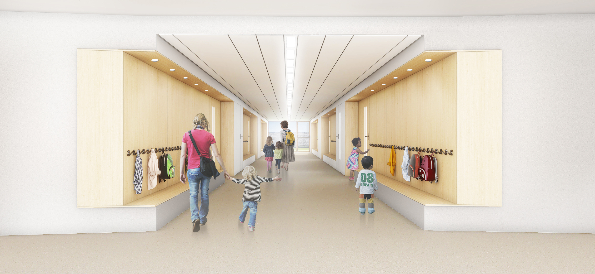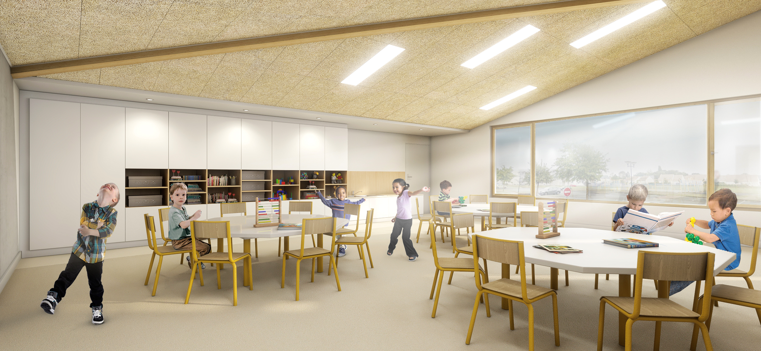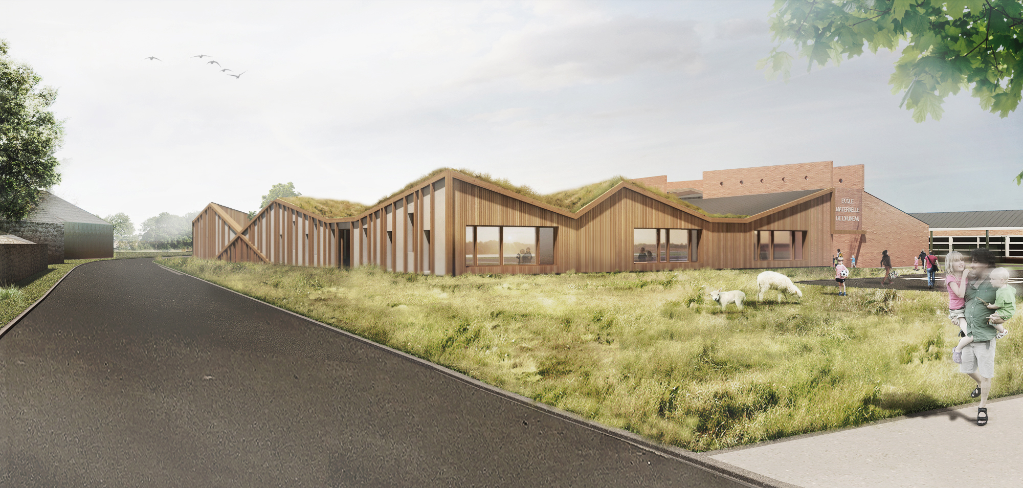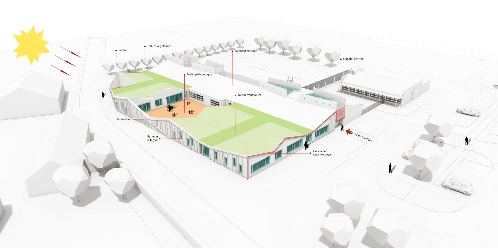 3 enjeux ont guidé le projet de l’école : -Développer un projet à performance passive avec un besoin de chauffage faible (14kwh/m².an) et une étanchéité à l’air performante (0,5vol/h en n50) -Concevoir une extension s’intégrant en subtilité avec le contexte existant et avec une progression dans les matériaux (de la brique au bois) et dans les formes architecturales (dynamique des pans de toiture) -Placer l’enfant au cœur du projet par l'architecture (hauteurs des fenêtres, vues vers l’extérieur, échelle du projet, assises pour s’habiller, acoustique, matériaux naturels, qualité sanitaires de l’air)