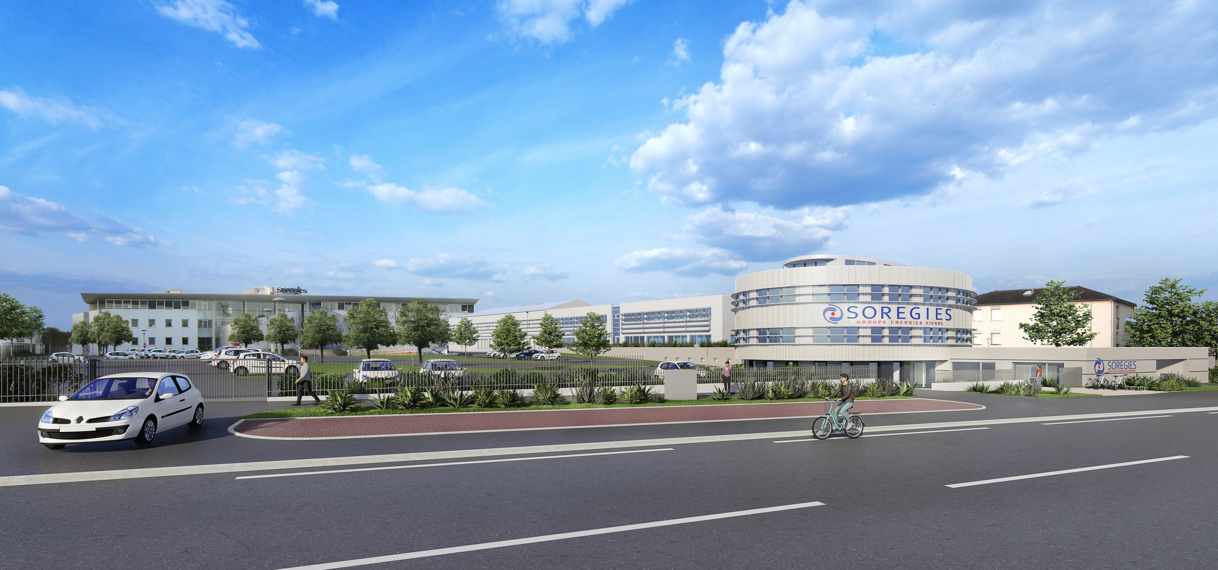 Le projet s’inscrit dans le prolongement d’un bâtiment existant, l’extension se déploie vers l’avenue afin de créer un «évènement» architectural dynamique et valorisant. Une partie des services est implantée dans un immeuble de forme ovale. Cette volumétrie permet de créer un «événement» urbain fort. Ainsi l’entrée du public et des visiteurs est en liaison directe avec l’avenue. Ces deux volumes reliés permettent à la fois une lecture homogène de l’ensemble des services, et une cohérence architecturale propice à la lisibilité du rôle prépondérant de SOREGIES dans le domaine de l’énergie.