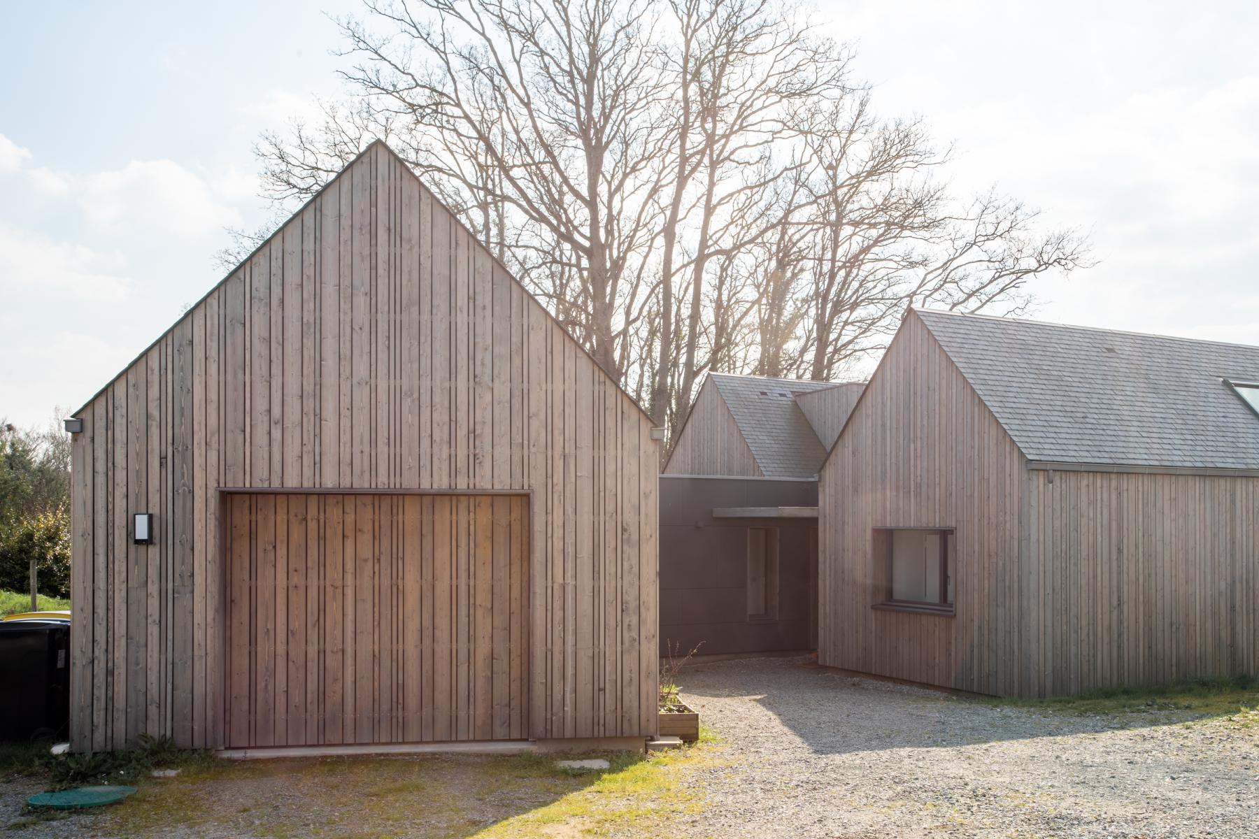 Pour la conception de cette maison familiale située dans la campagne pornicaise, la proximité d'un bois et d'un étang ont amené à retravailler l’imaginaire d’une cabane de pêcheur. Pour ne pas s’imposer massivement, le programme s’est donc décomposé en trois volumes dont l’articulation crée la singularité des espaces extérieurs. Enfin, le choix de la structure s’est naturellement porté sur une ossature bois et une toiture ardoise afin de coller aux tonalités du site et de préserver sa sérénité en toute saison.