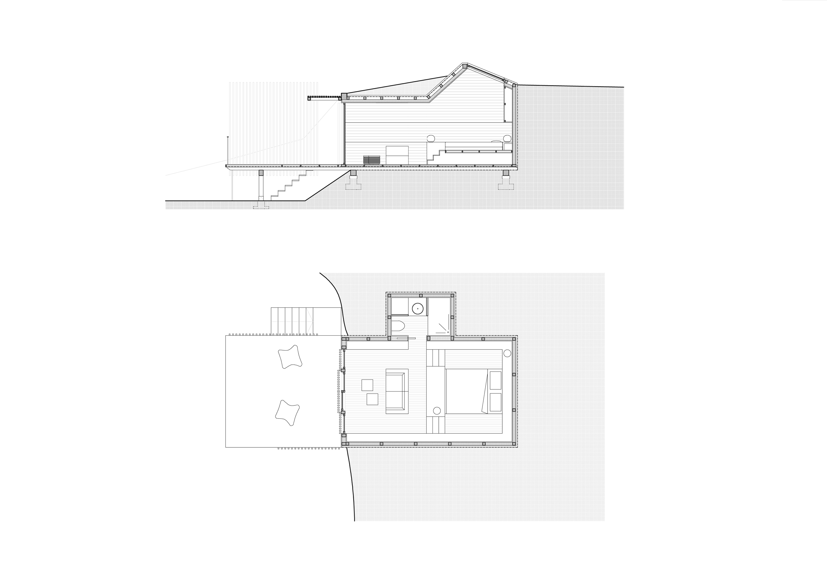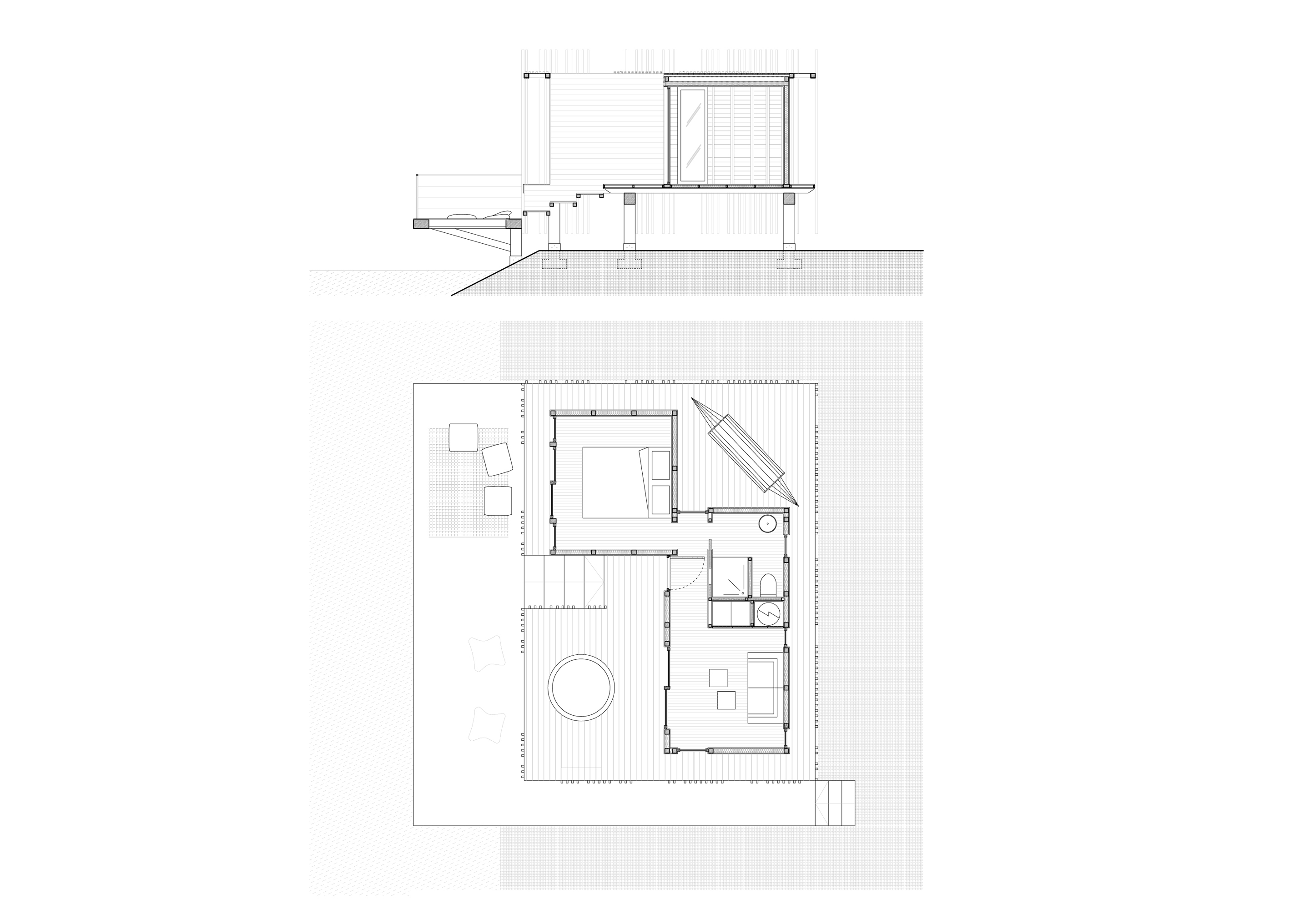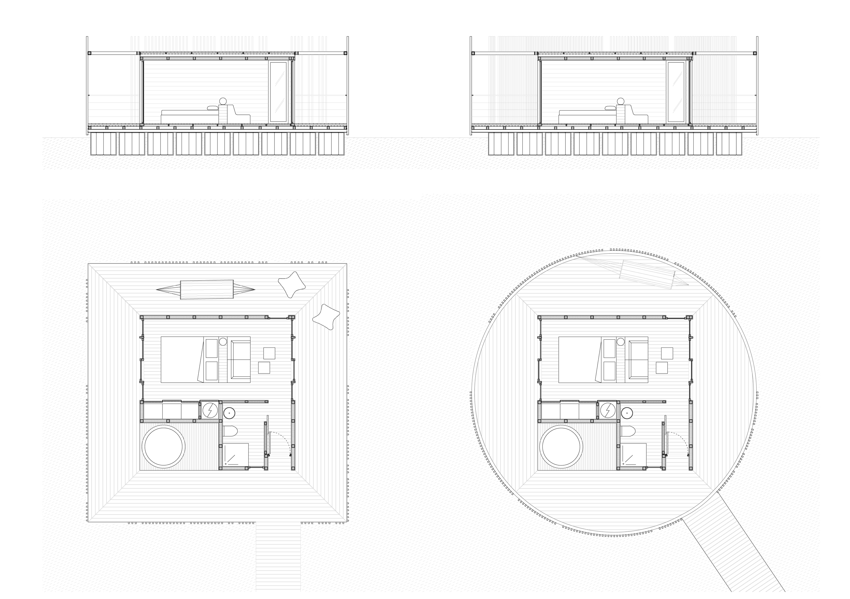 Descriptif technique de l'aménagement : L'ensemble des cabanes est constitué d'un volume centrale, isolé thermiquement en ossature bois et avec un revêtement en lamelle de bois ajourées. Pour éviter des aléas de chantier sur des sites éloignés, les projets sont largement préfabriqués. Les composants sont en partie numérotés, démontés et reconstruits sur place. La préfabrication réduit les coûts de production et de main-d'œuvre lors de l'installation avec très peu d’impact sur le paysage. Pour ses qualités techniques, telles que la légèreté, le bois devient l'une des ressources durables les plus intéressantes. Il est également très résistant, recyclable et biodégradable.