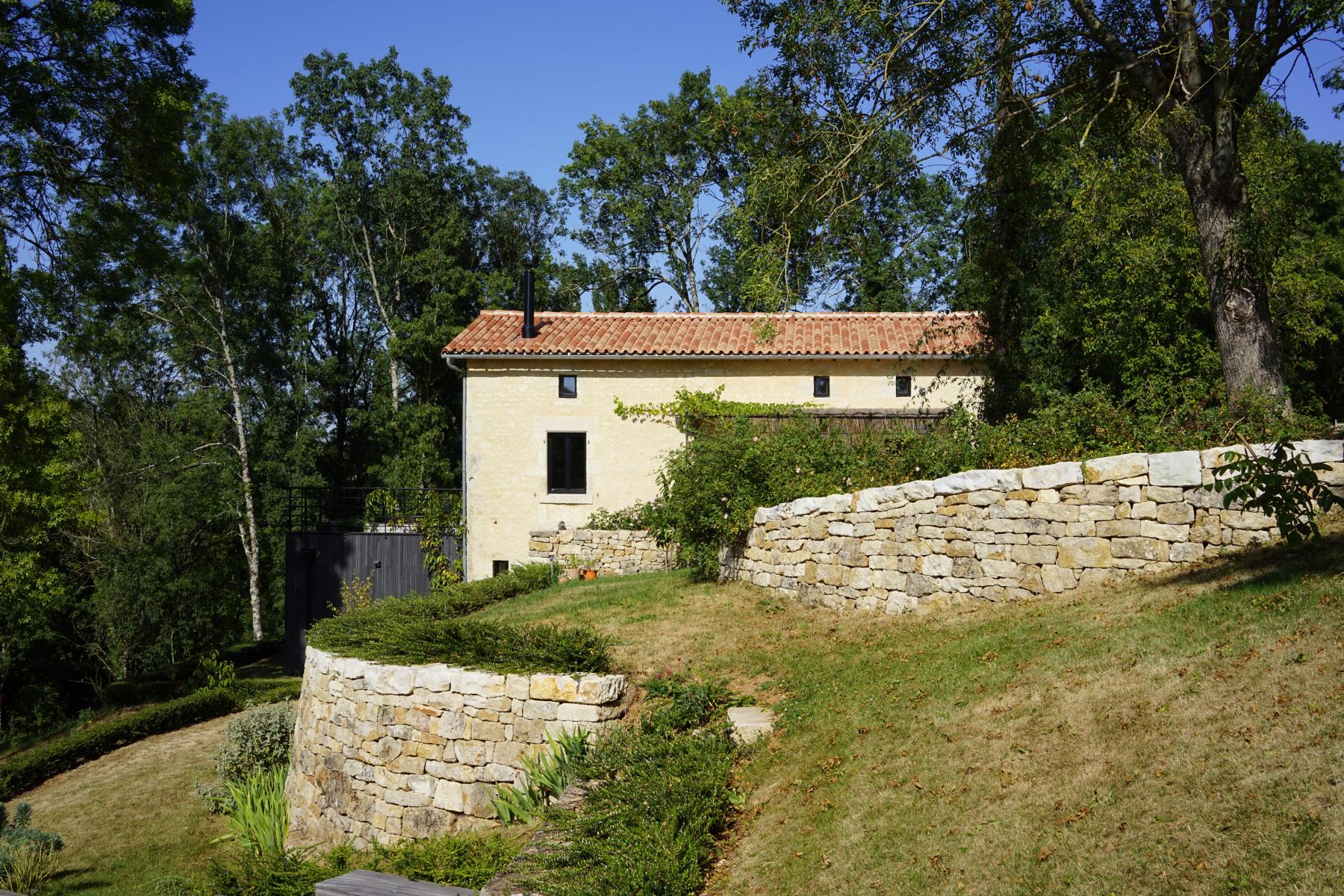 Descriptif technique : Seuls les murs extérieurs en pierre du volume existant sont conservés afin de libérer plan et volume. Une ferme traditionnelle en bois de récupération est installée. Elle reçoit une charpente en chevrons porteurs (ITI + sarking) et une couverture en tuiles canal. Les extensions sont en ossature bois (ITI+ITE) avec bardage en châtaignier huilé noir et acier polimiroir. La toiture terrasse accessible est en panneaux HBE avec lame bois sur plots afin de limiter la hauteur de toiture. Les pierres issues de la démolition sont réutilisées pour les aménagements extérieurs (murets et pavage).