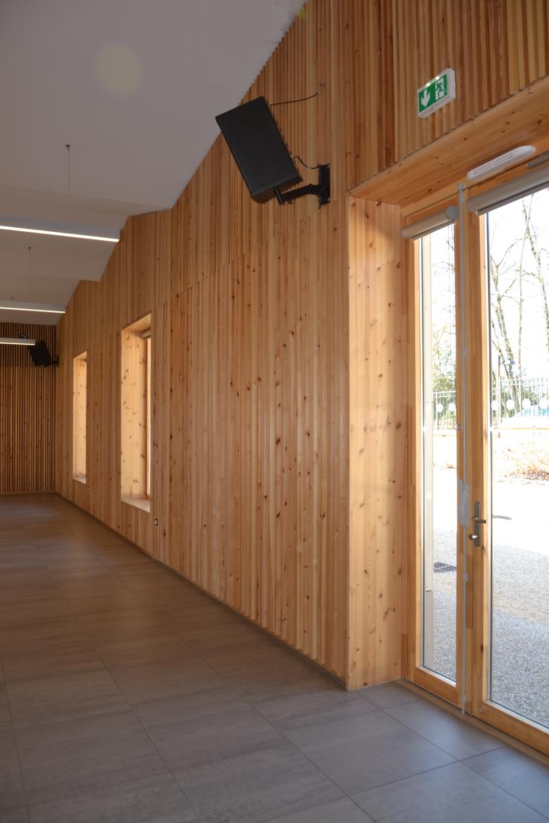 Descriptif technique de l'aménagement : Le parement acoustique de la salle d'activités est constitué de lames pin de section 28 x 45 posées verticalement sur les 4 faces de la salle afin d'assurer un maximum de confort acoustique. Pour créer un effet visuel les lames sont alternées chant - face jusqu'à 2,90m de hauteur, puis sur chant en partie haute. Le complexe se compose de tasseaux épicéa, d'un isolant acoustique + voile noir en feutrine. Les parements de tableaux ainsi que la structure du bar sont constitués de panneaux 3 plis pin