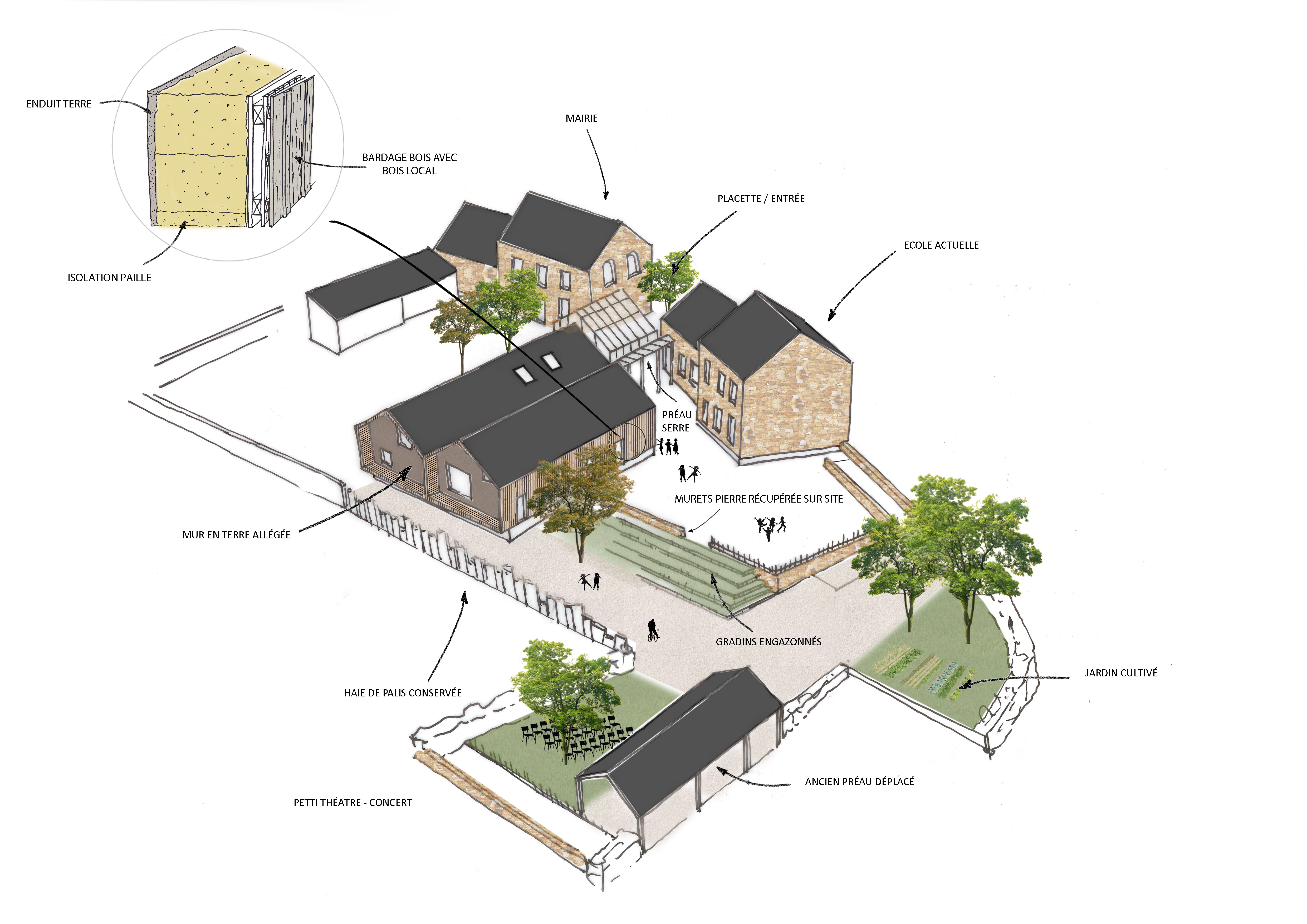 Approche environnementale : Le projet est mené autour dʼune démarche environnementale. Pour cela, le bâtiment est conçu avec le plus de matériaux biosourcés et locaux. La structure est en bois. Lʼisolation en paille est issue de la commune et le bardage en bois vient de la scierie voisine. De plus, un mur en terre allégée est construit en façade Sud pour profiter de lʼinertie de ce matériau. Le chantier a été réalisé sous forme dʼun chantier en insertion, ainsi quʼen chantier participatif.