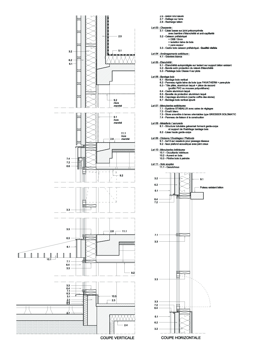 Descriptif technique : Le bâtiment réhabilité est habillé de caissons bois isolés en fibre de bois, les bâtiments d'extension sont quant à eux réalisés en caissons paille.