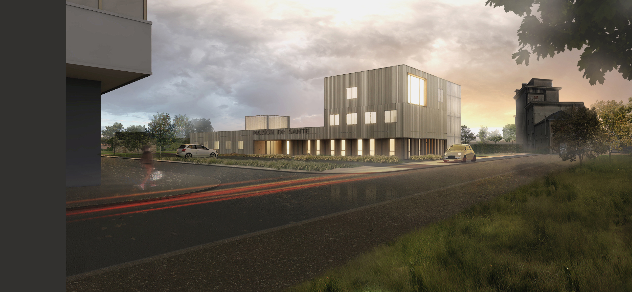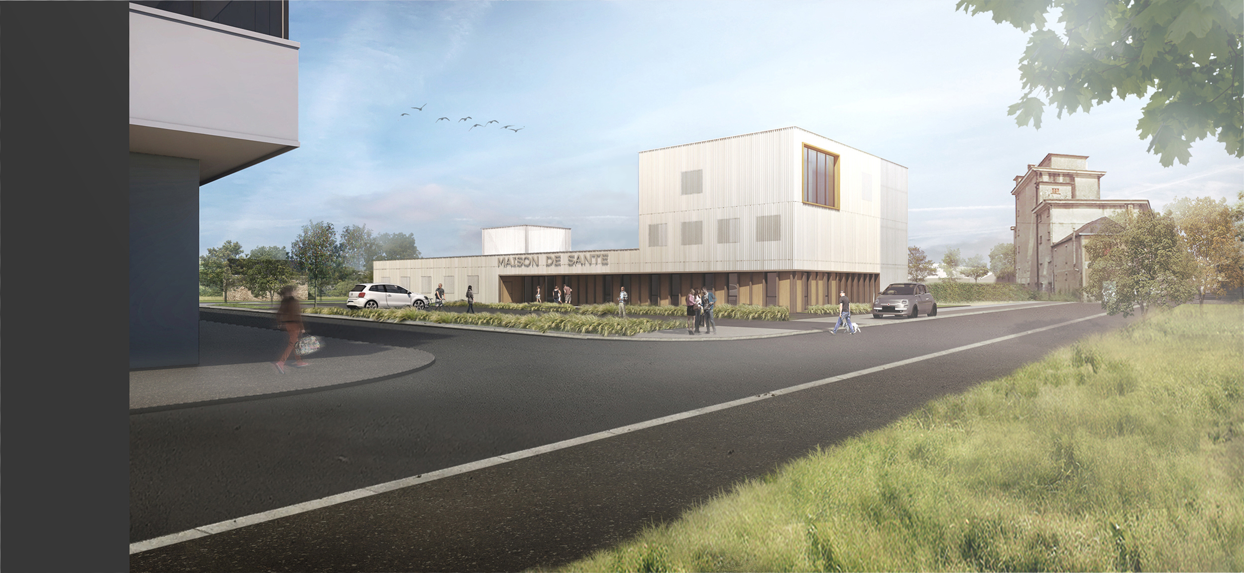 Située dans la friche urbaine du secteur gare de Vendôme, la Maison de Santé Pluridisciplinaire et Universitaire de Vendôme offre une image dynamique et participe à la nouvelle identité du futur quartier. Positionné entre l'ex-FMB et l'imposant silo, le bâtiment s'élève sur 3 niveaux afin de développer une skyline le long de l'infrastructure ferroviaire face à la gare. La structure est en bois sur les 3 niveaux et les matériaux de façades ont été choisis par rapport à leur contexte (bois devant le parvis d'entrée / bardage irisé blanc en réponse à la pierre locale).