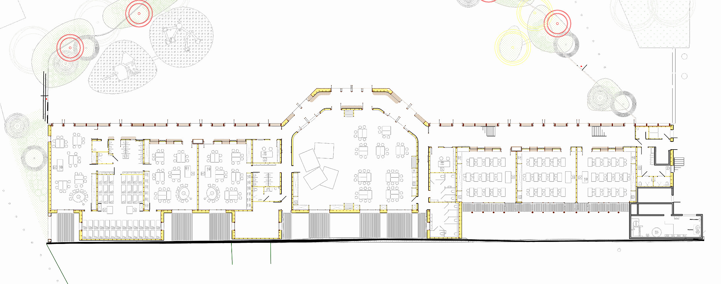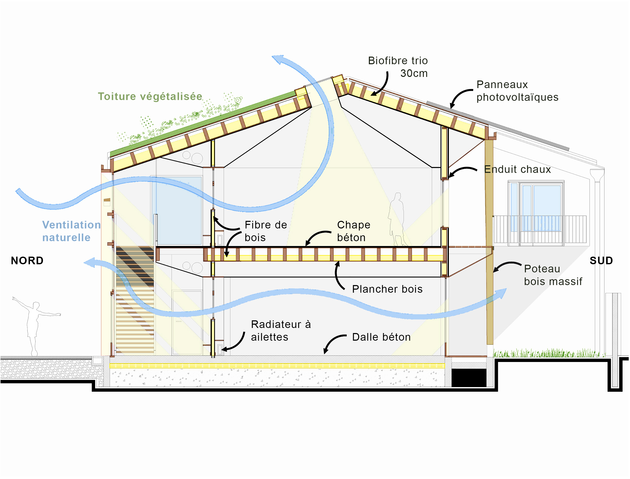 Approche environnementale : Mur à ossature bois avec isolant paille. La ventilation naturelle comme vecteur de rafraichissement. Chaque salle de classe et salle d’activités sont équipés de menuiseries ouvrantes pour un brassage de manière traversante ou de manière ascendante par des fenêtres de toit. Pour encourager les usagers à rafraichir et à ventiler naturellement, des voyants asservis à une gestion intelligente du bâtiment, comparant en temps réel la température intérieure et la température extérieure, permet d’indiquer les situations favorables et inverses réciproquement.