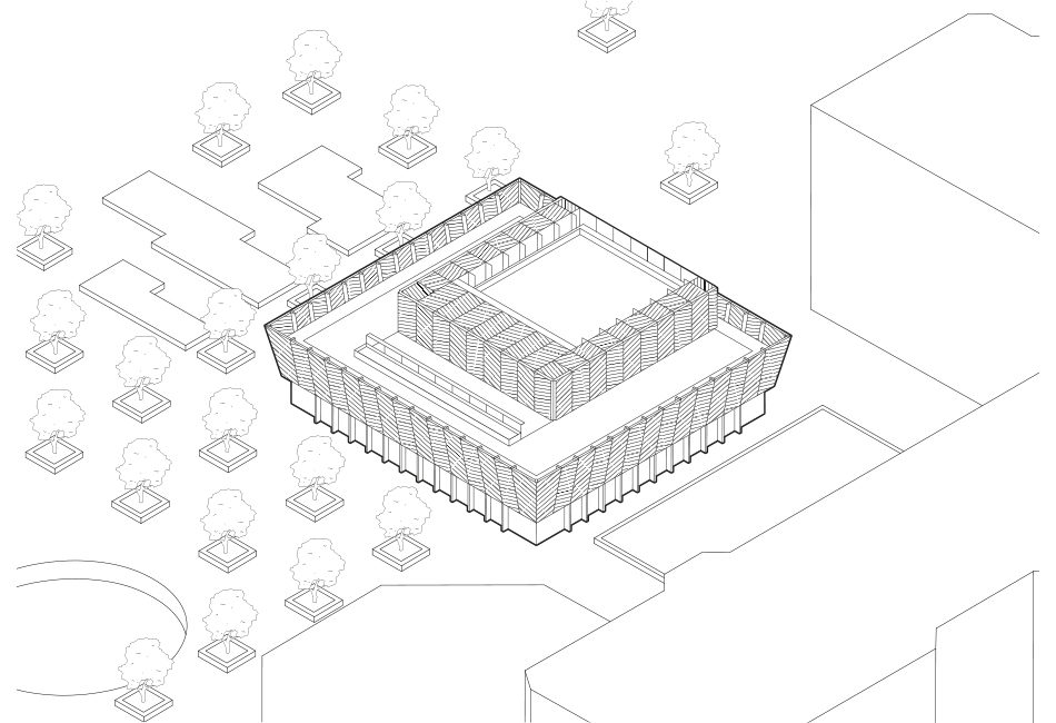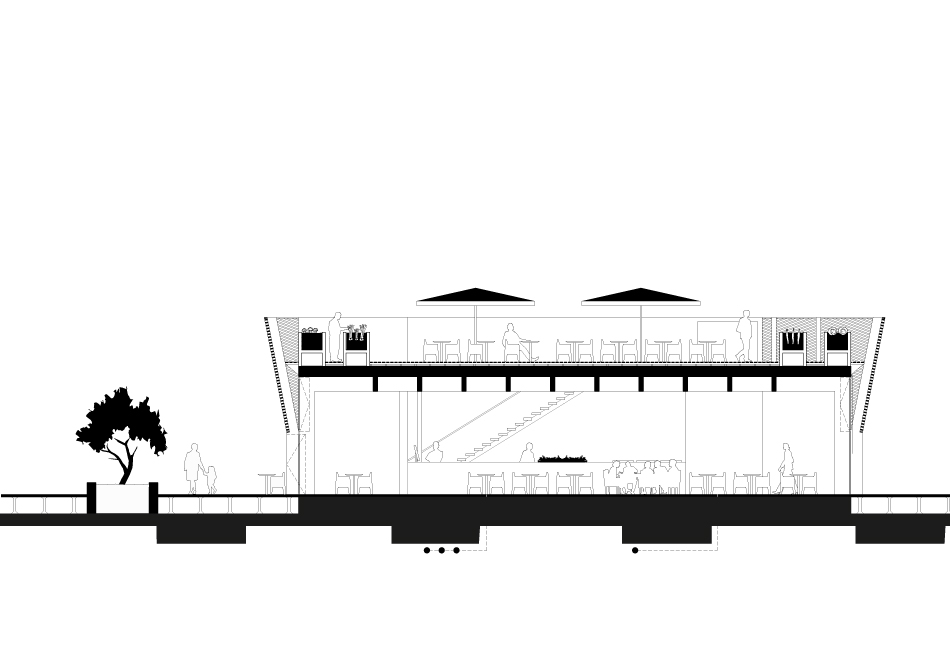L’architecture du Pavillon de la Défense résulte de la recherche de simplicité et de modularité d’usage : ossature entièrement en bois, large façade vitrée aux menuiseries bois, mutabilité de l’espace et des usages et intégration de la biodiversité. La structure en bois tridimensionnelle rythme les façades et le plafond. De larges brise-soleil inclinés protègent les grands vitrages, invitant à entrer dans les restaurants. La toiture-terrasse est plantée et accessible au public. Un volume d’auvent en lattes de bois vient flotter à la hauteur des cerisiers existants.