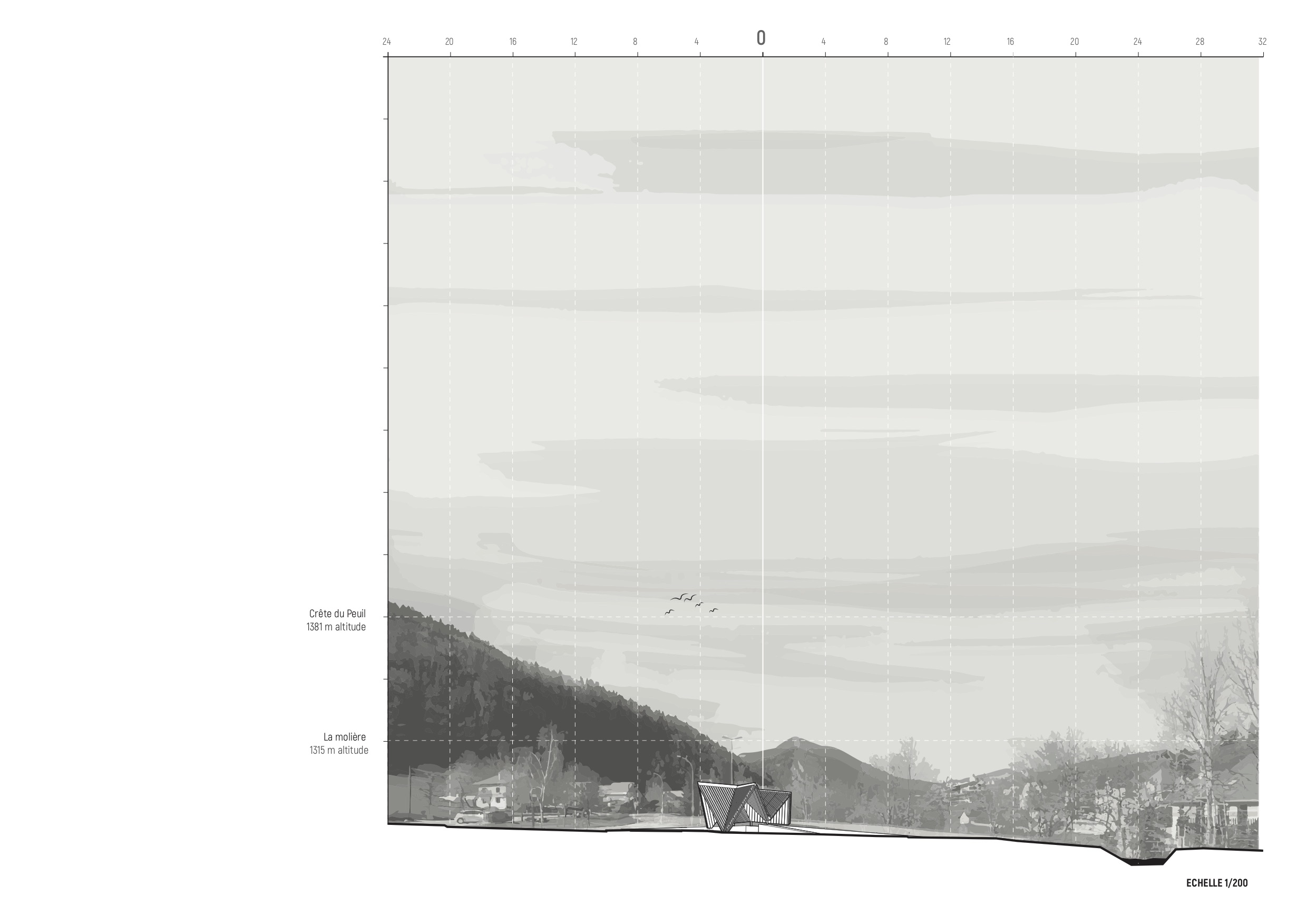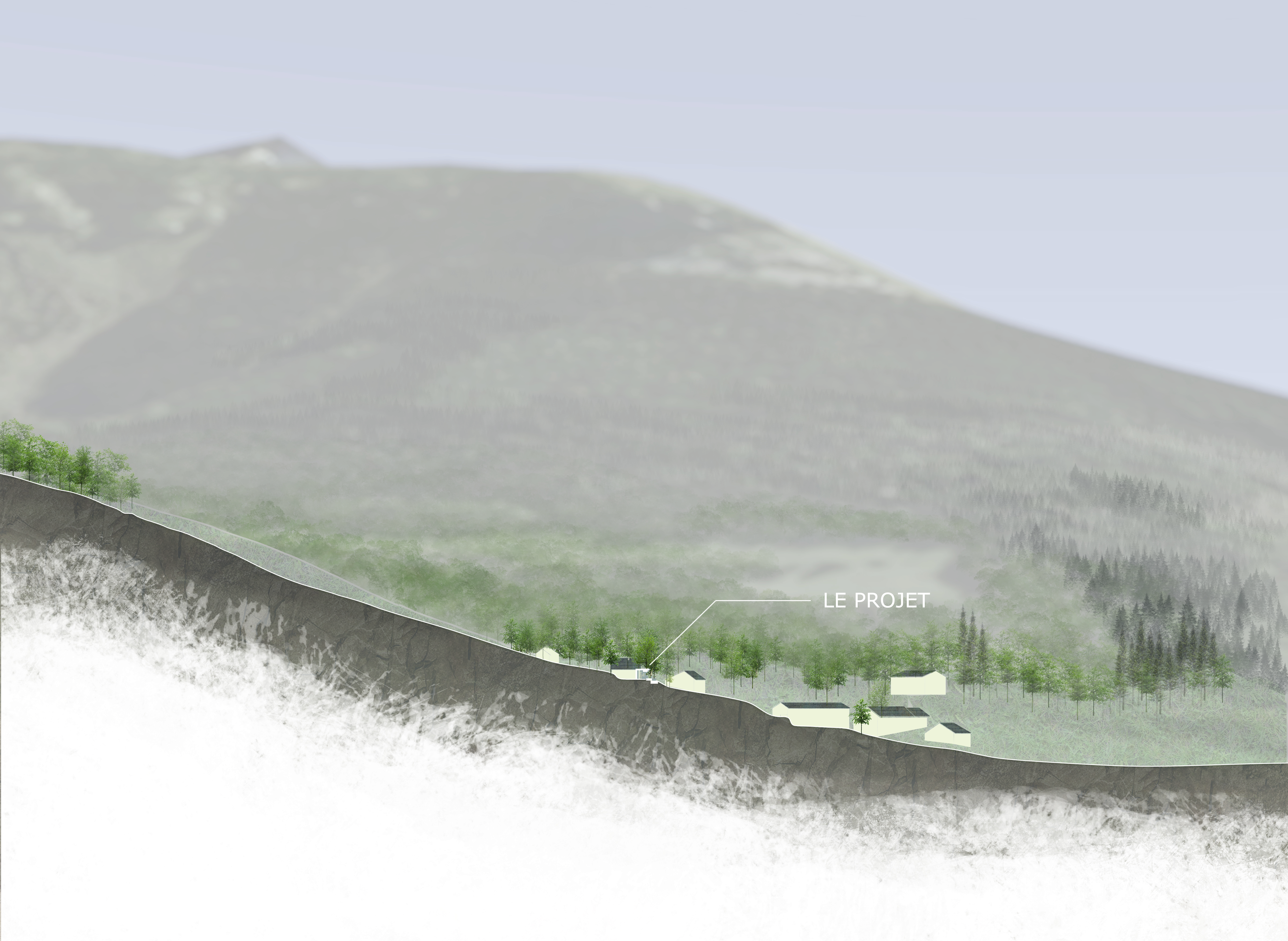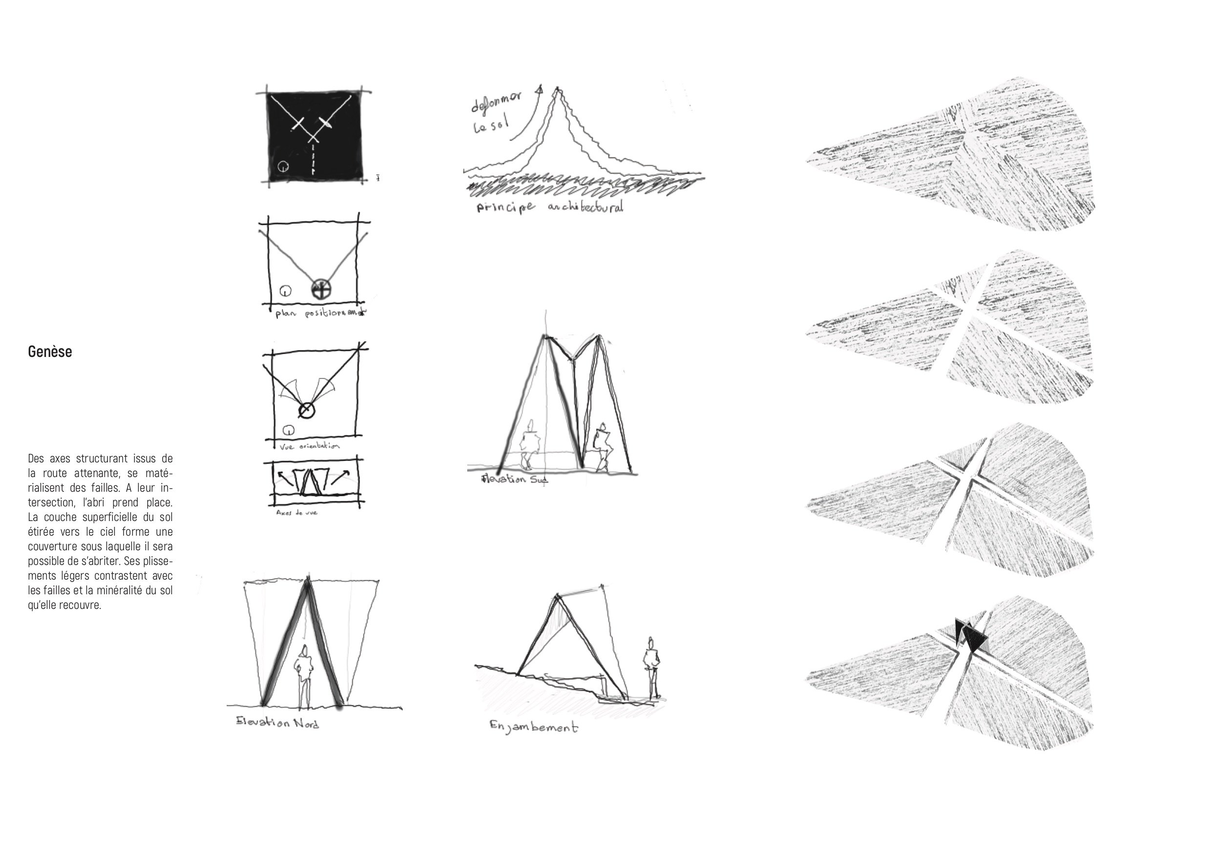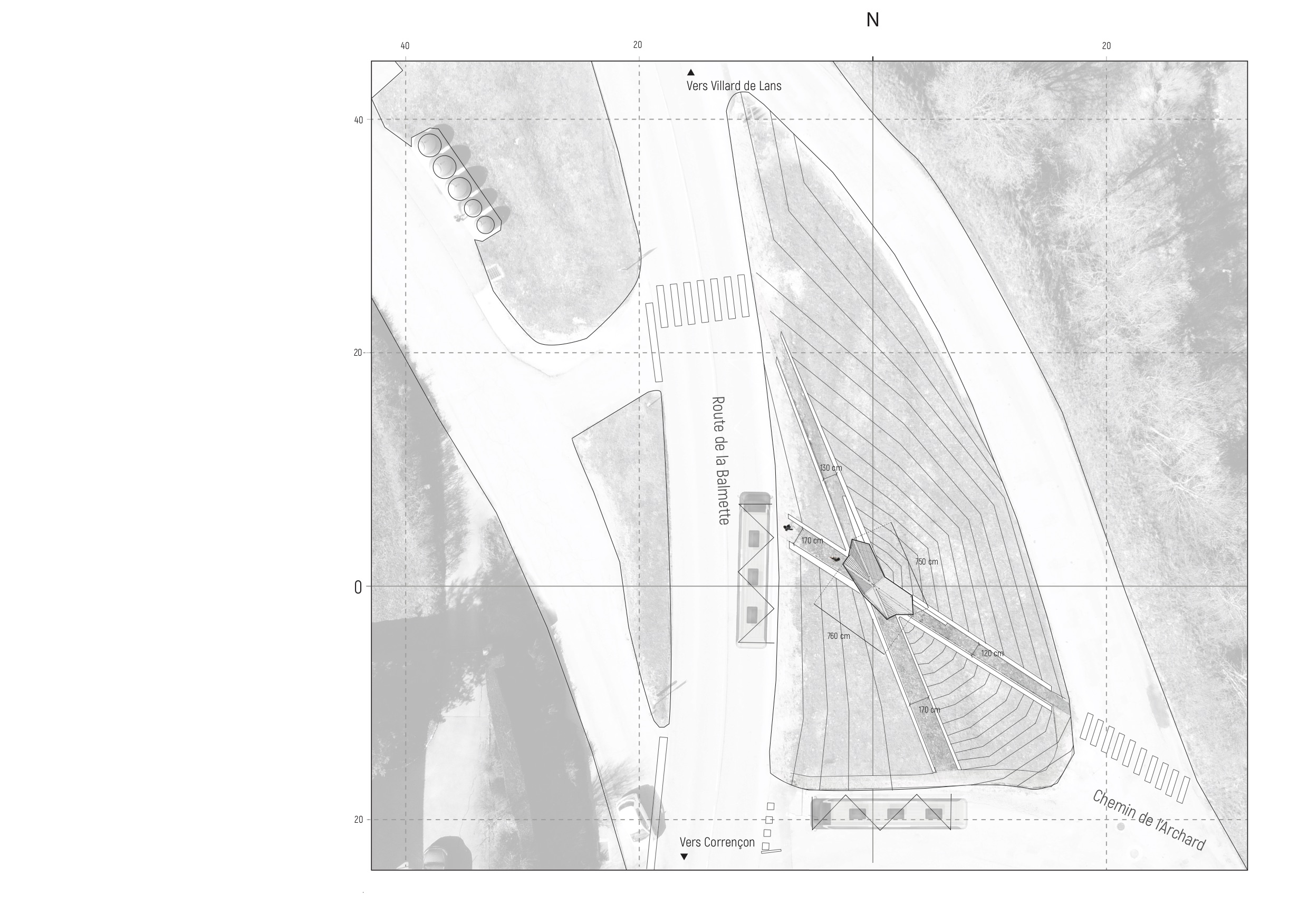 A Villard de Lans, 2 abris pour voyageurs proposent une attente confortable et contemplative. Si les formes sont propres aux sites, la posture d’implantation est commune : une assise minérale prolongeant le sol, une couverture boisée cadrant les vues. Les abris sont à la fois repères, cadres et éléments du paysage. Au hameau des Mourets, on se glisse de la route à la pente entre des masses de pierre et bois bruts. À la Balmette, on emprunte des failles, prolongements des chemins attenants, jusque sous un pliage de bois qui couvre le corps et élance le regard vers les massifs environnants.