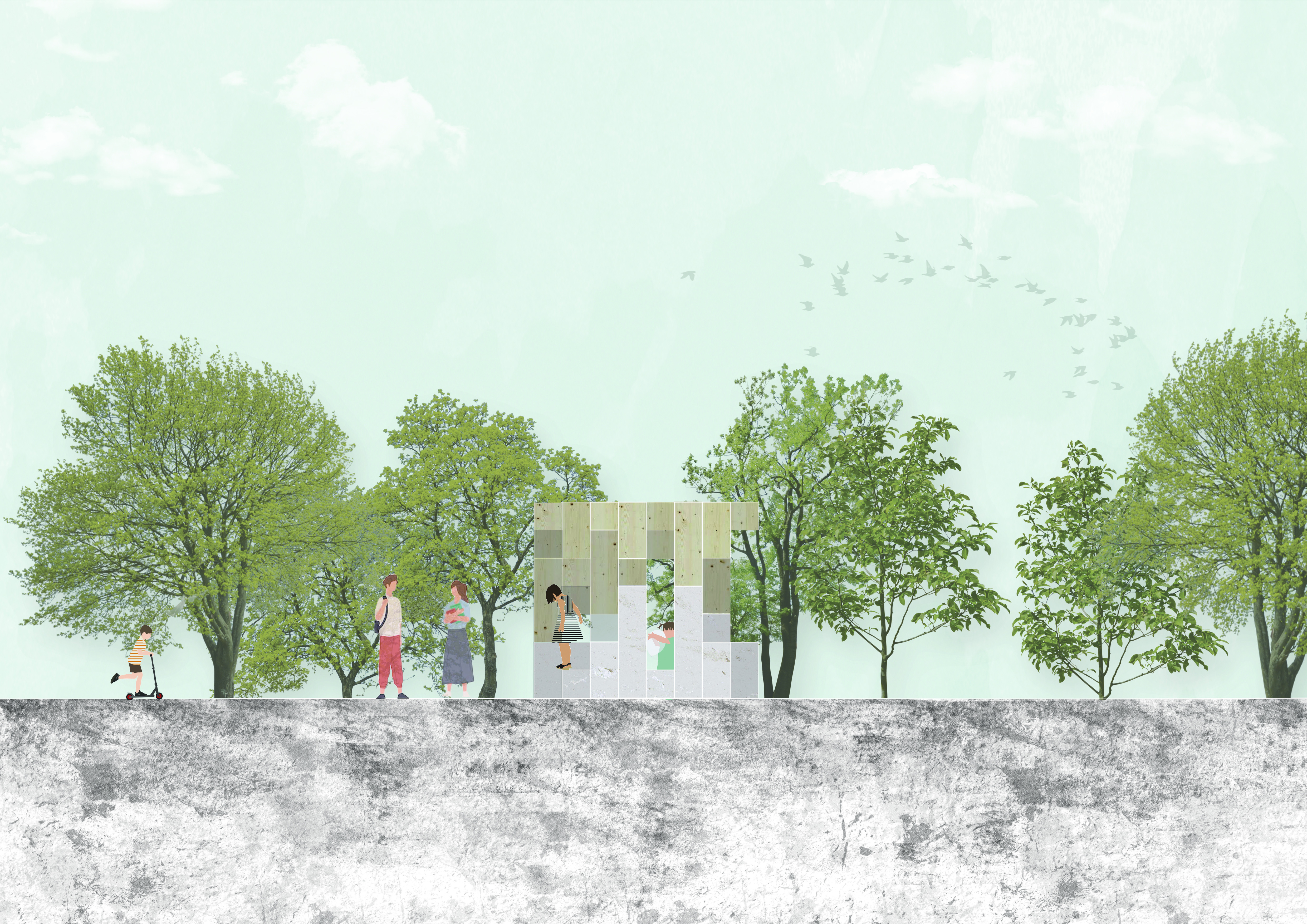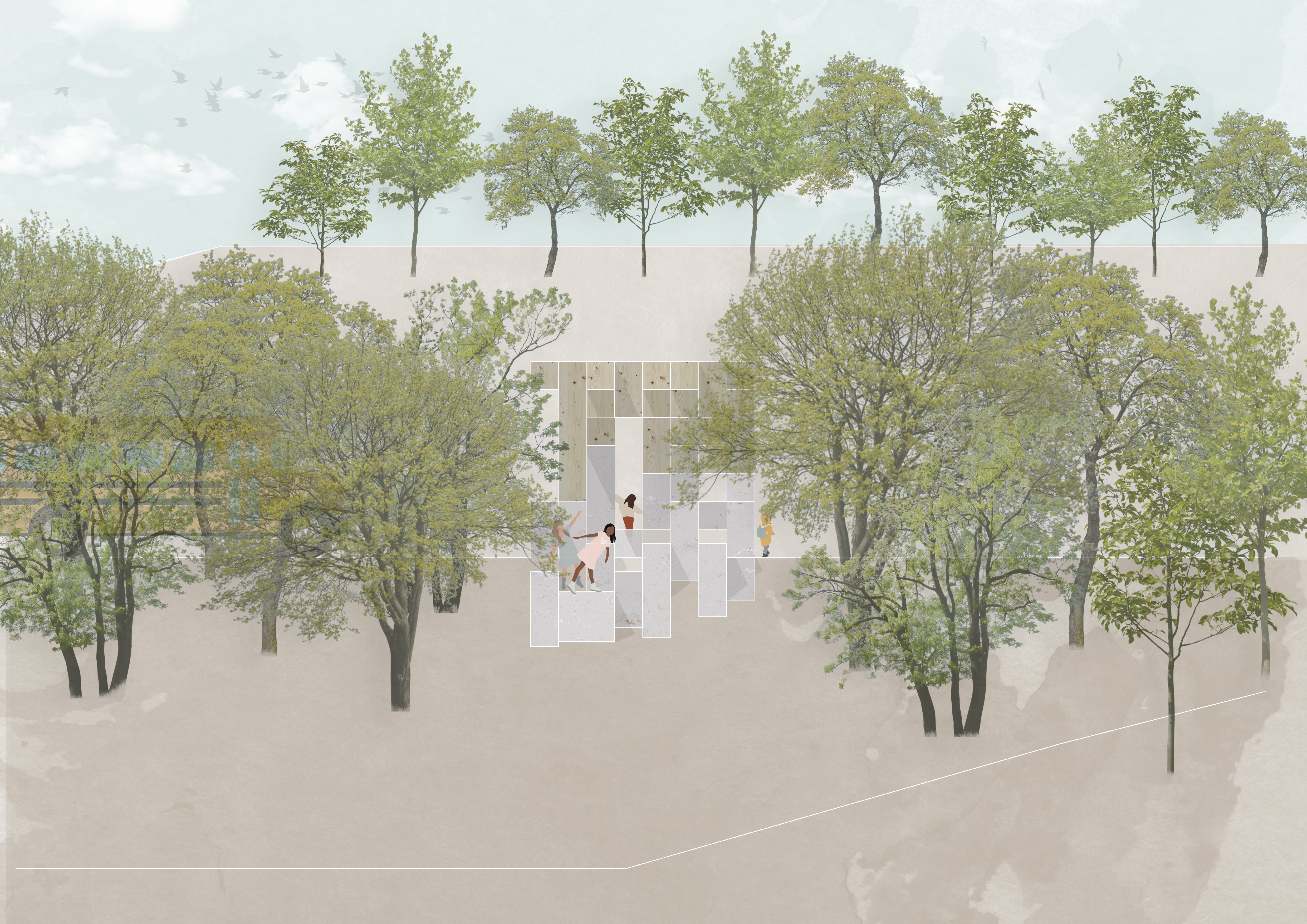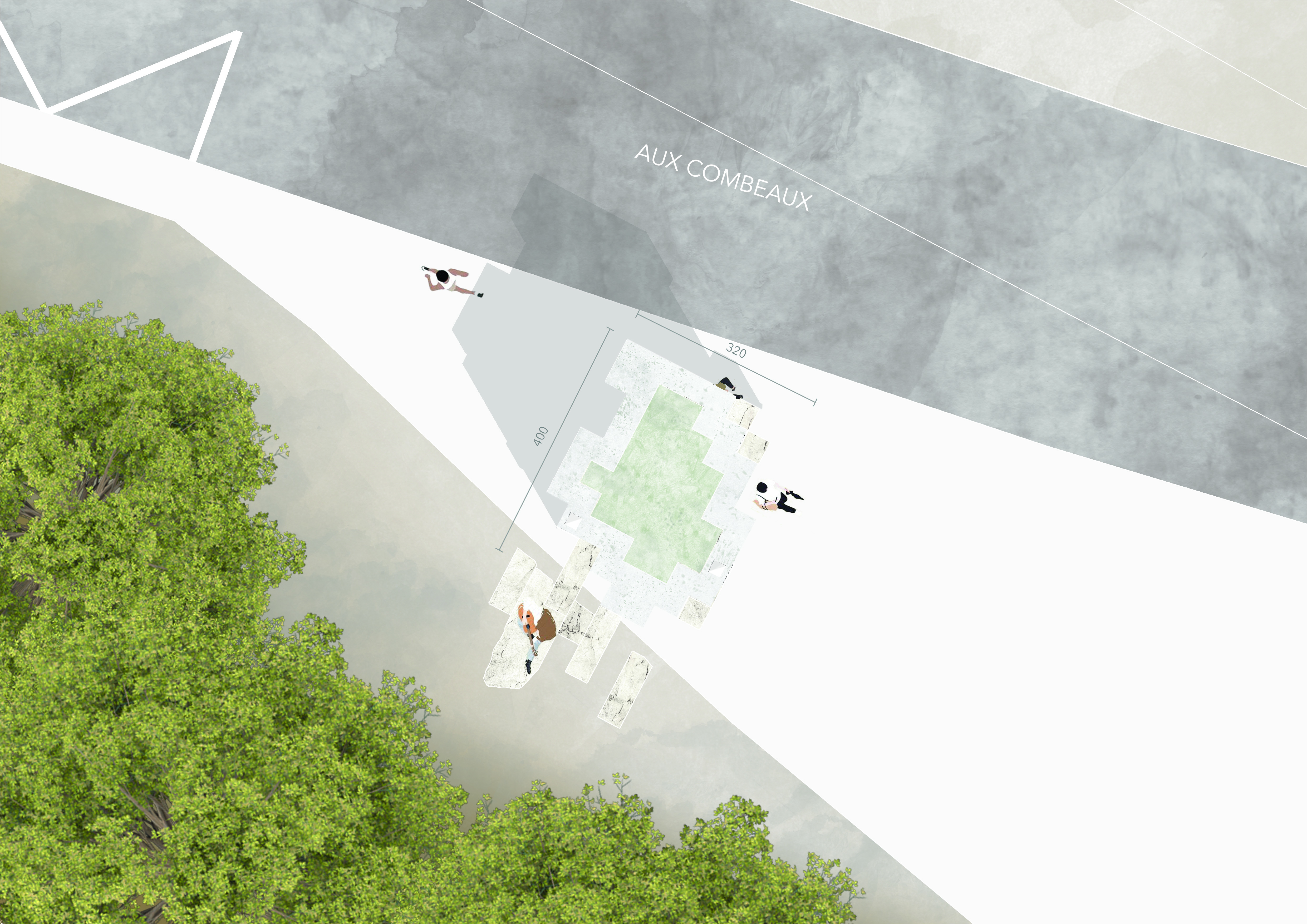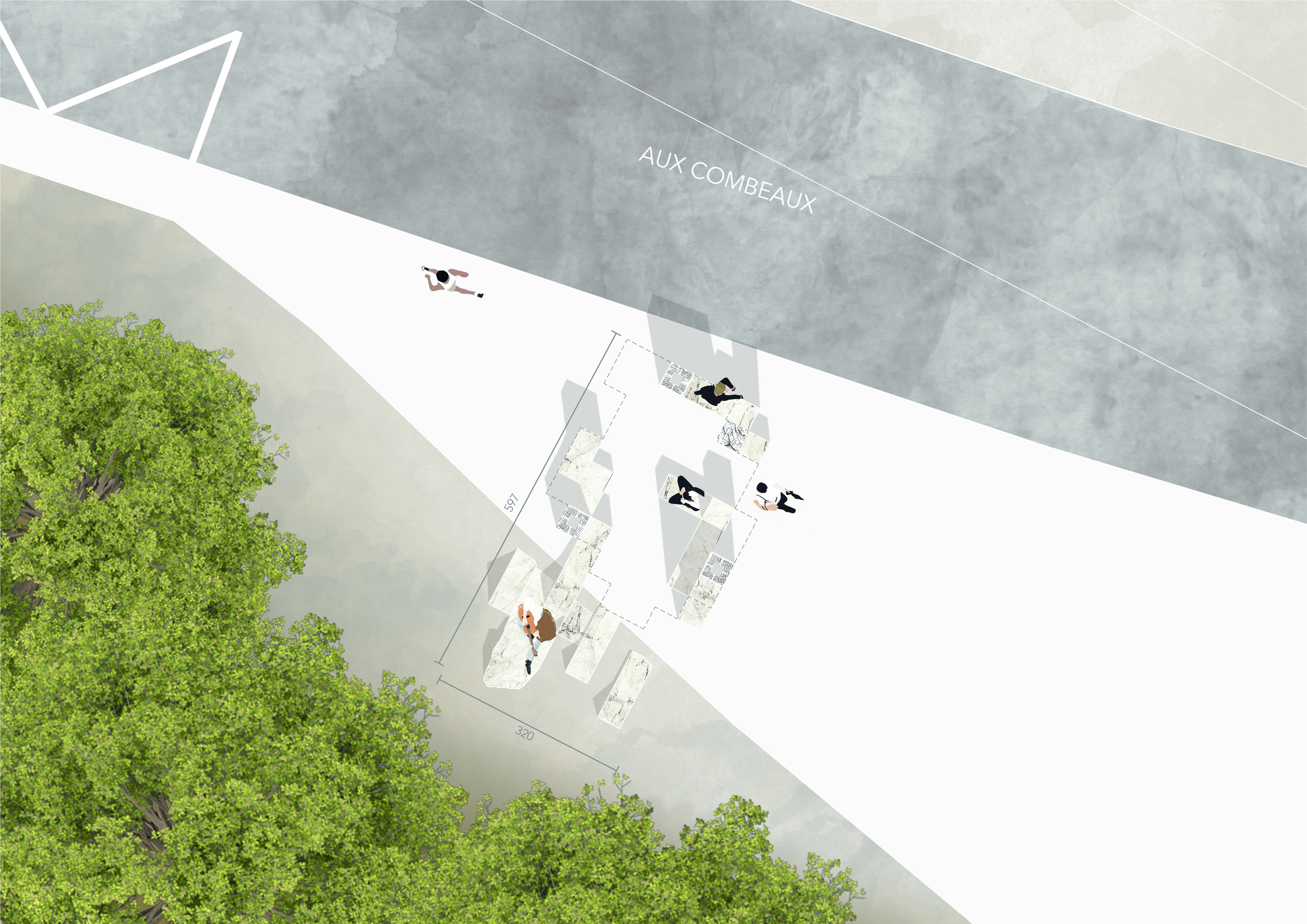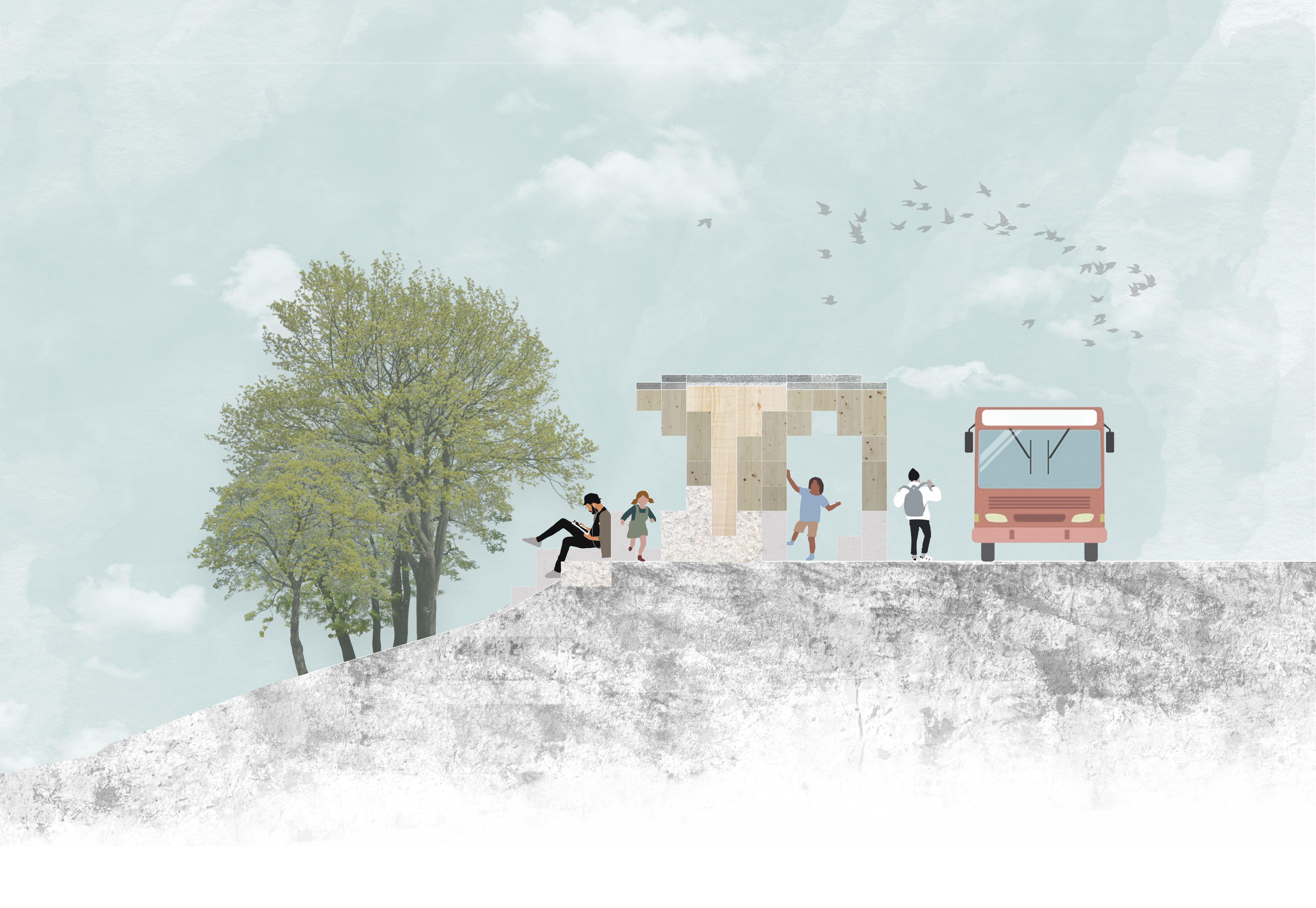 A Villard de Lans, 2 abris pour voyageurs proposent une attente confortable et contemplative. Si les formes sont propres aux sites, la posture d’implantation est commune : une assise minérale prolongeant le sol, une couverture boisée cadrant les vues. Les abris sont à la fois repères, cadres et éléments du paysage. Au hameau des Mourets, on se glisse de la route à la pente entre des masses de pierre et bois bruts. À la Balmette, on emprunte des failles, prolongements des chemins attenants, jusque sous un pliage de bois qui couvre le corps et élance le regard vers les massifs environnants.