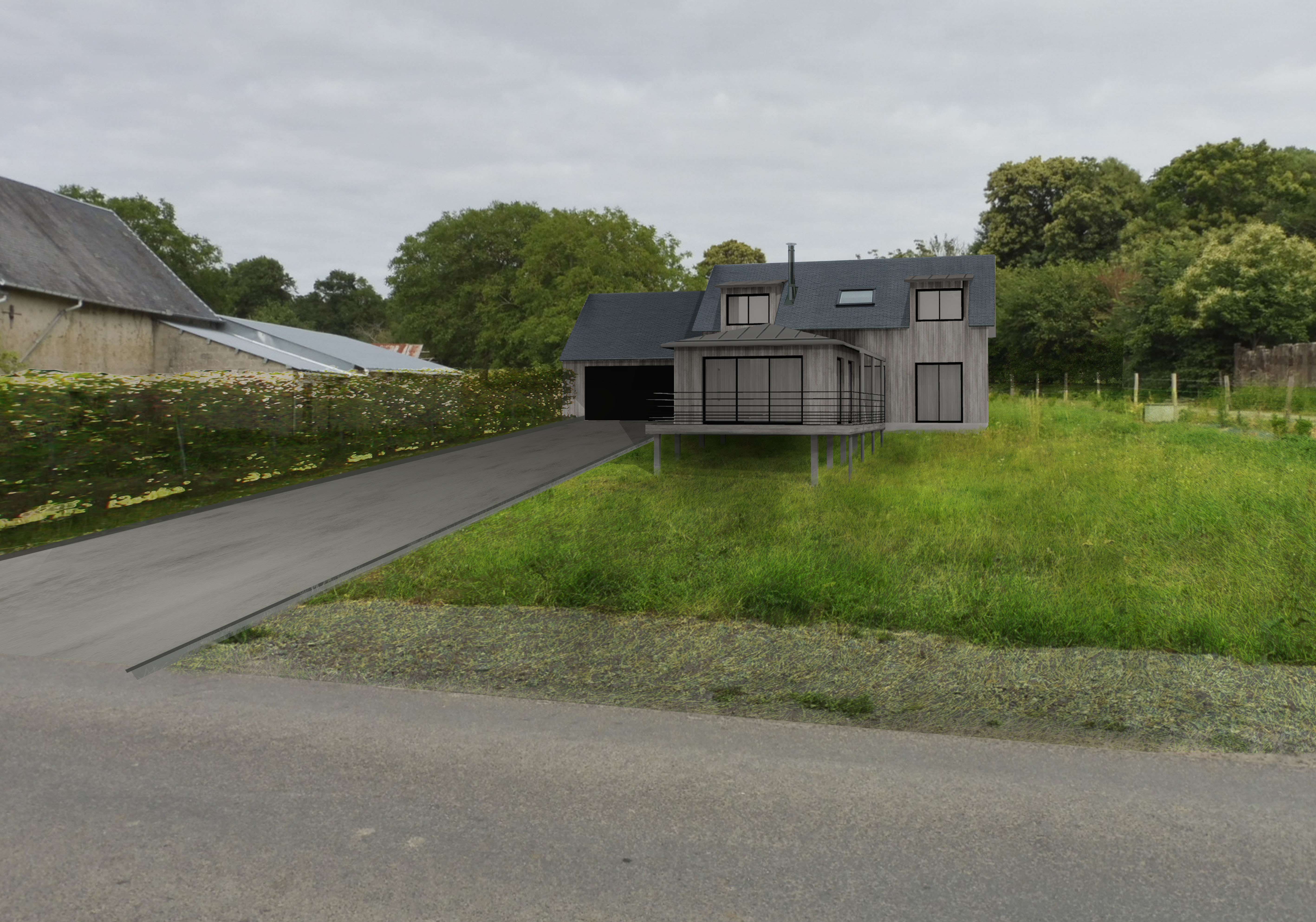 Approche environnementale : Située dans un hameau à flan de coteau, cette maison s’installe sur pilotis laissant ainsi son terrain vallonné filer naturellement et apporte une impression de légèreté à l’ensemble. (Notice Archi) • Des façades prégrisées qui s’intègrent parfaitement dans cette ambiance bocagère. • Façades orientées pour un apport solaire passif et éviter le vis-à-vis au sud d’une autre maison en surplomb. • Vivre dans une maison bien isolée et très lumineuse. • Toutes les pièces principales orientées au sud et à l’ouest vers la vue • Un mur béton banché en RDC devant l’insert apportant de l’inertie