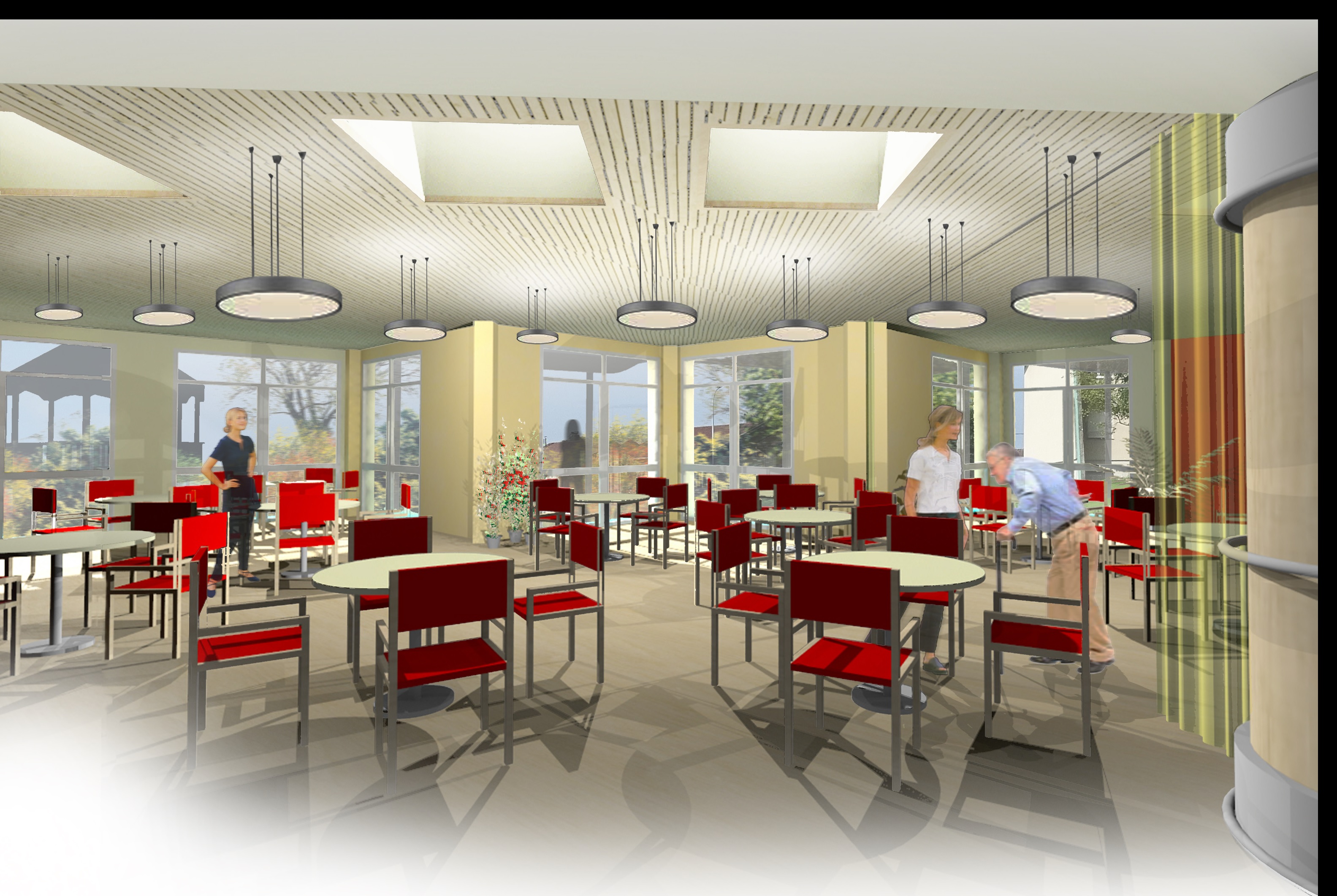 L’EHPAD se présente sous la forme d’une étoile à 4 branches, composée de bâtiments à toiture 2 pans et toitures plates végétalisées pour une meilleure intégration urbaine. •Adaptation à la topographie par un parking couvert dans la partie basse du terrain •Accès principal par un parvis vert avec absence de clôture pour créer un environnement accueillant et éviter l’effet carcéral •Partie logistique à l’arrière pour dissocier les flux livraisons/résidents- personnel et s'éloigner des espaces de chambres •Implantation de la salle commune plein sud donnant sur un vaste parc ensoleillé