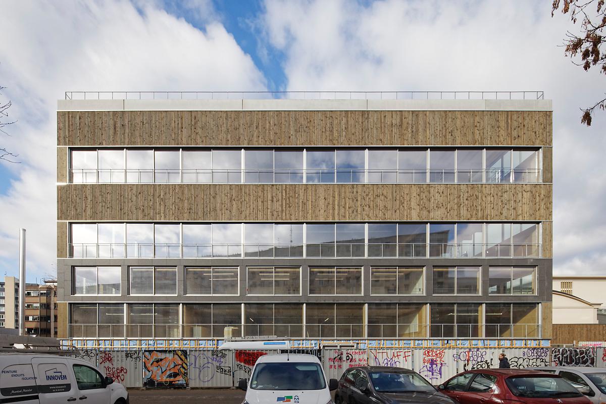 Le projet d’extension et restructuration de l’INSA Strasbourg dédie un nouveau bâtiment à la formation en architecture. Il est relié par une rue intérieure à l’Institut. En mezzanine l’espace de convivialité s’ouvre visuellement sur le hall. Le premier étage accueille la pédagogie, distinguée par un habillage de pierre. Six grands ateliers, libérés de toute contrainte structurelle et sujétion technique pour être modulables, en double hauteur pour permettre l’expérimentation ech1:1, sont agencés autour d’un noyau béton qui accueille les espaces servants autour d’un escalier à double révolution.