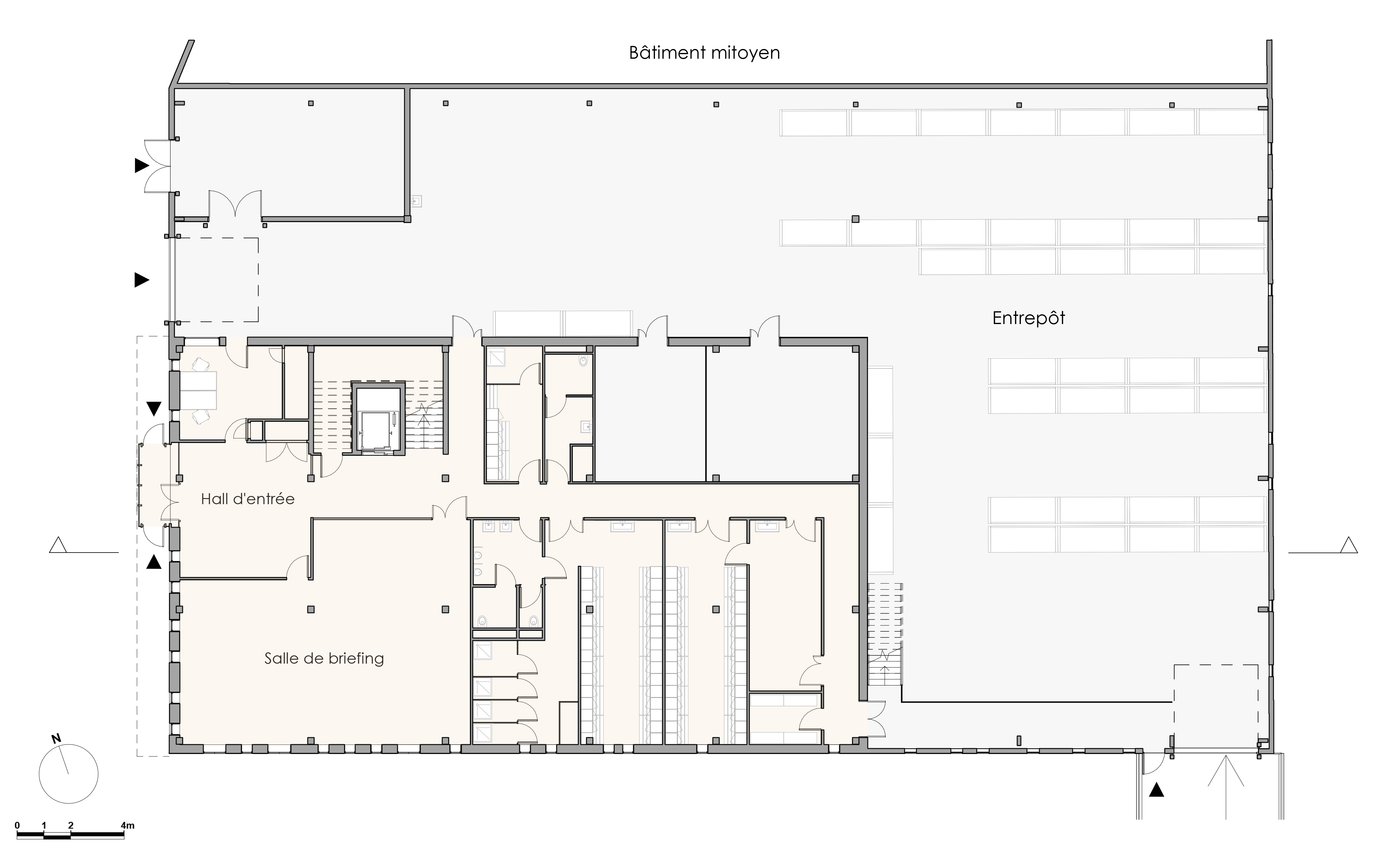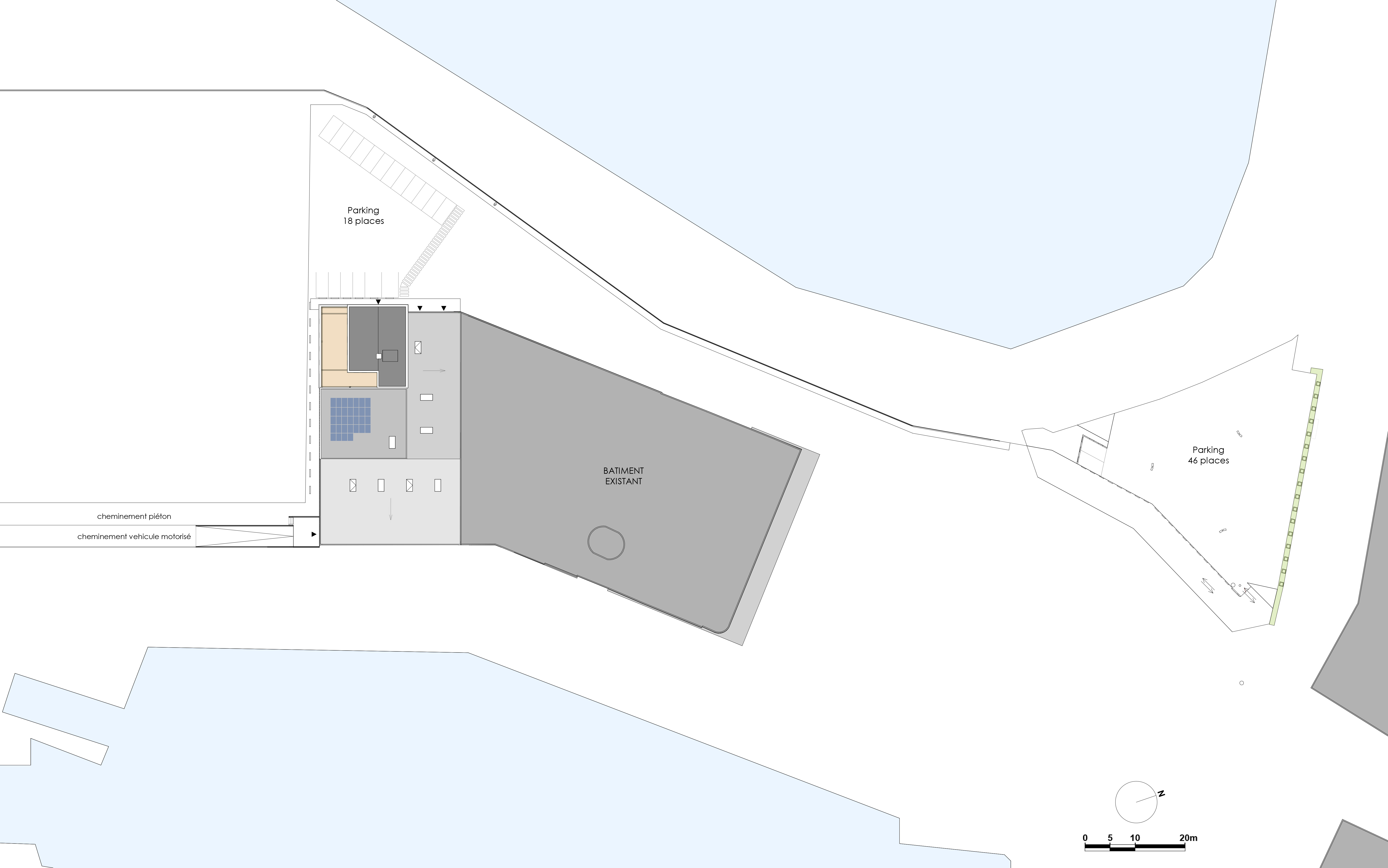 Descriptif technique : La parcelle est située sur l’embouchure du port de La Turballe et présente la particularité d'avoir des fondations préexistantes sur lesquelles le bâtiment devrait s'implanter. La logique du projet est de respecter les implantations des fondations existantes, constituées par des pieux. La structure bois a été choisie pour sa légèreté. Sur la partie bureaux, la structure est contreventée par un système de planchers CLT, une cage d’escalier en CLT et un ensemble de murs à ossatures bois reprennent les efforts. Sur la partie atelier, le contreventement est réalisé par des diagonales en bois.