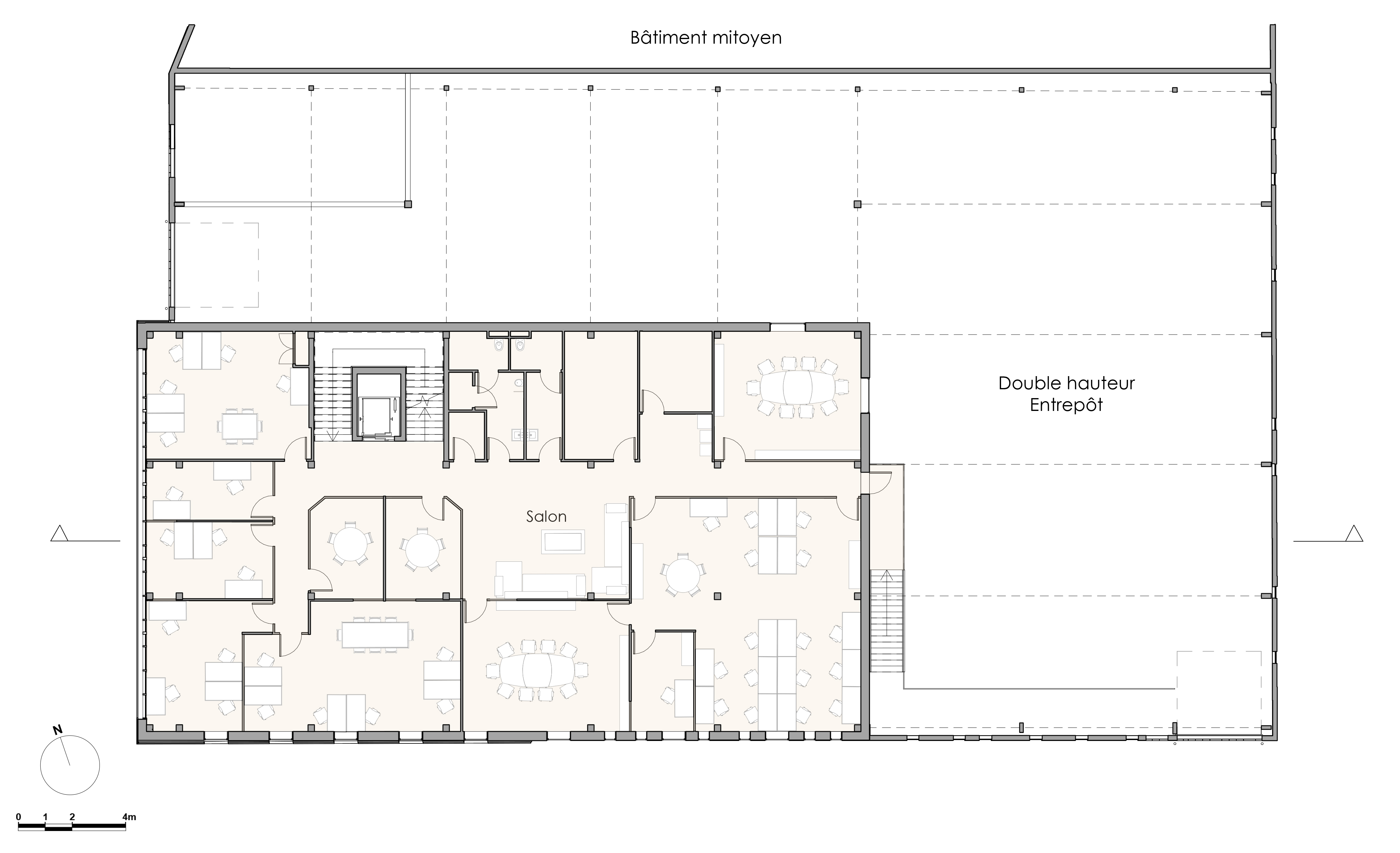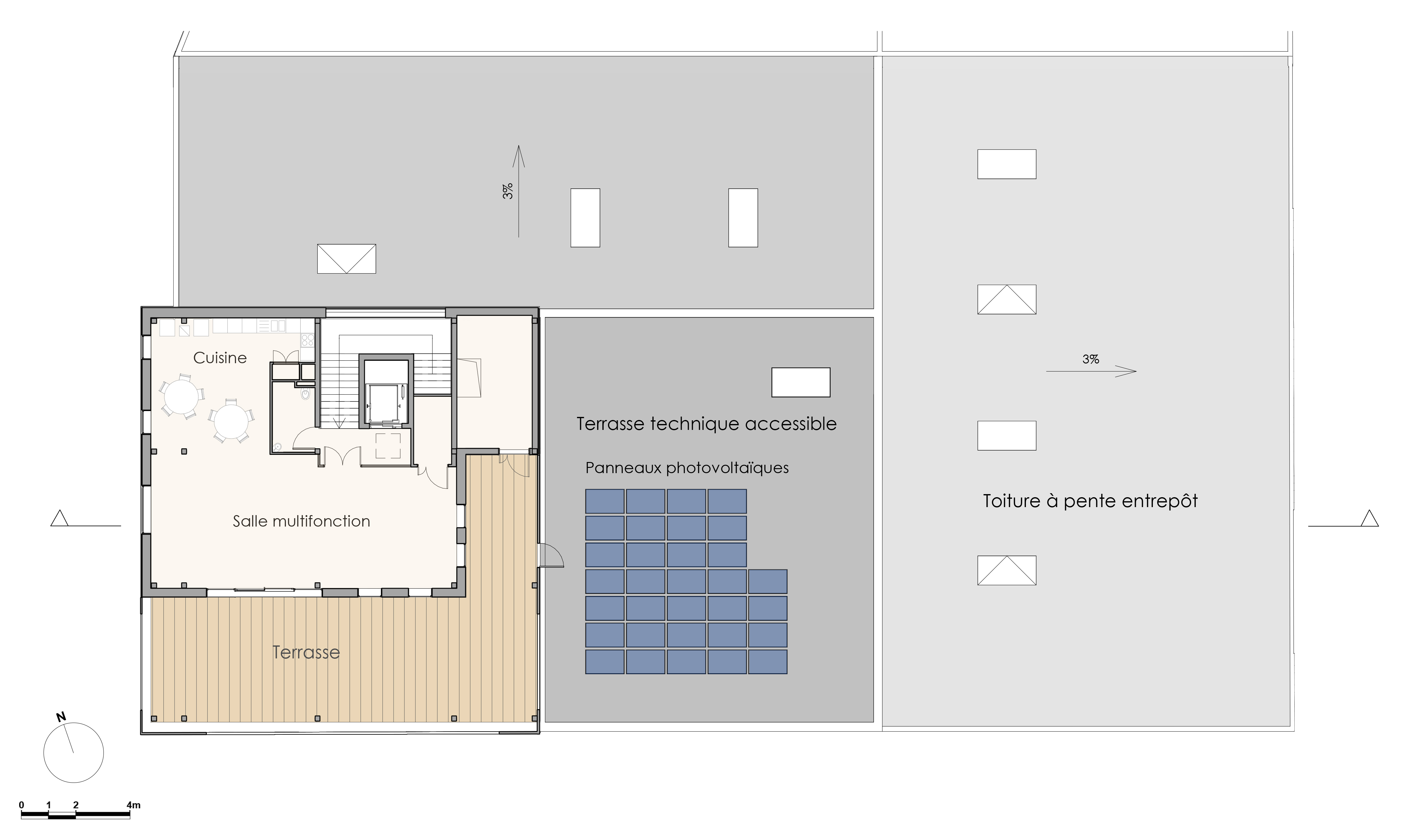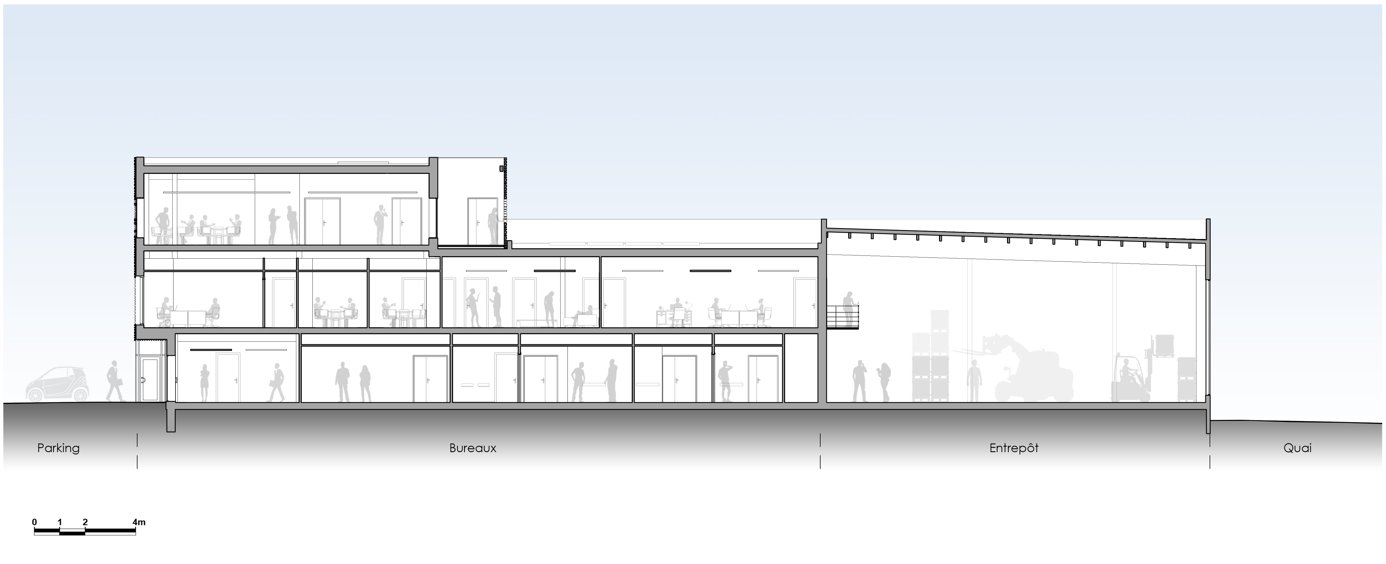 Approche environnementale : Le projet suit la RT2012, avec une anticipation de la RT2020. Le bâtiment a été réalisé avec le plus de matériaux biosourcés possible. L’enveloppe de bureaux est isolée différemment selon les localisations. Celle-ci est performante pour assurer un confort d’été et d’hivers pour les utilisateurs. La partie bureaux est orientée Sud-Ouest pour profiter des apports solaires et les exploiter pour un apport thermique naturel. Les bureaux sont alimentés en énergie renouvelable par un champ de panneaux photovoltaïques sur une partie de la toiture. Le bâtiment est labélisé Cradle to Cradle (C2C).