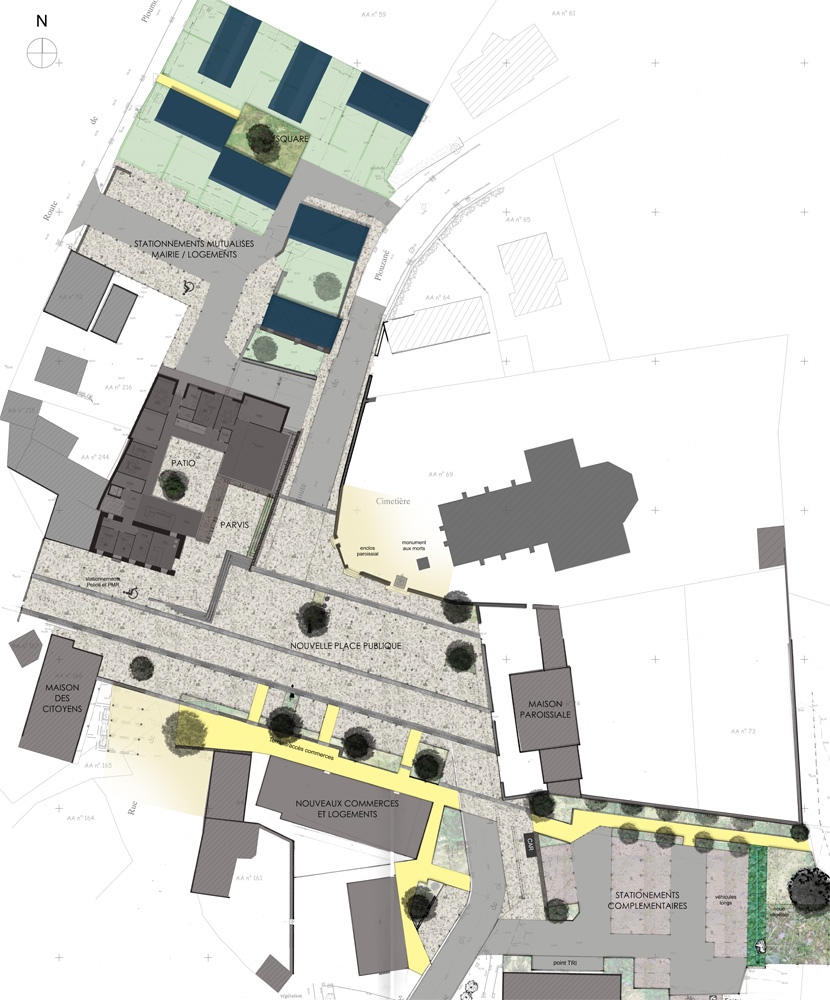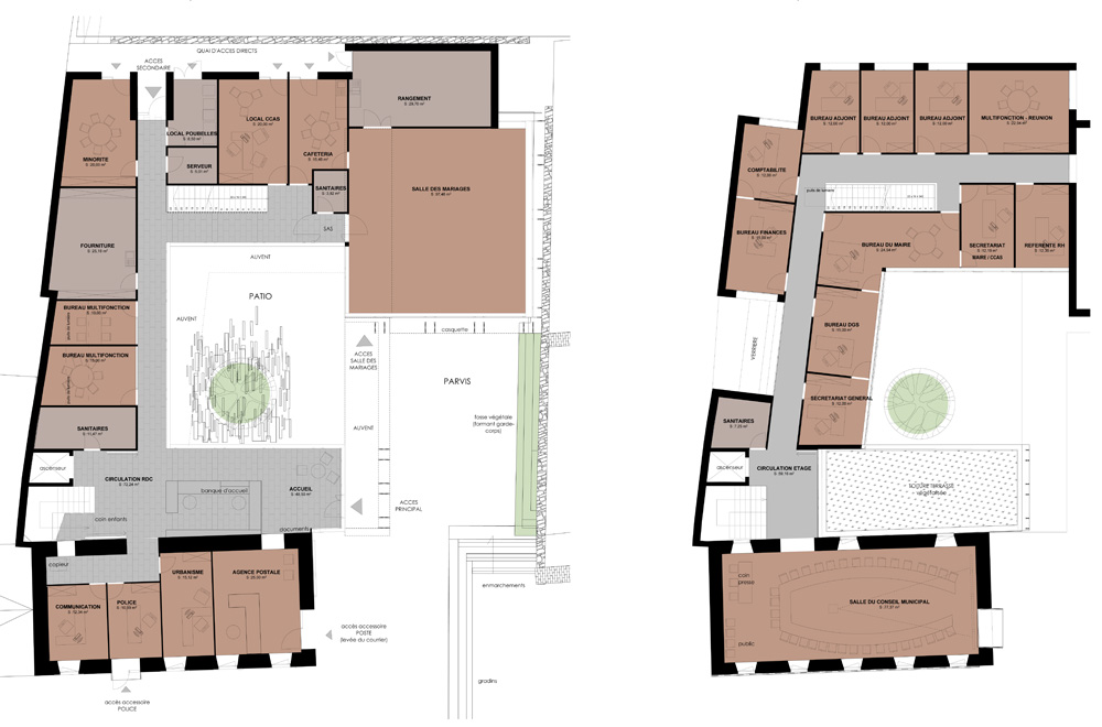 Le projet de restructuration de la mairie existante de Locmaria-Plouzané nait du déficit fonctionnel et thermique du bâtiment existant. Le bâtiment principal en pierre participe à la constitution du bourg. C'est pourquoi le projet s'en éloigne pour le mettre en valeur et créer un nouvel espace public autour d'un patio. La salle des mariages de l'extension en façade de pierre vient contrebalancer la salle du conseil installée dans l'étage de l'existant. L'ensemble du projet se développe sur un socle de granit, formant le nouveau parvis de la mairie, devant le futur aménagement du bourg.