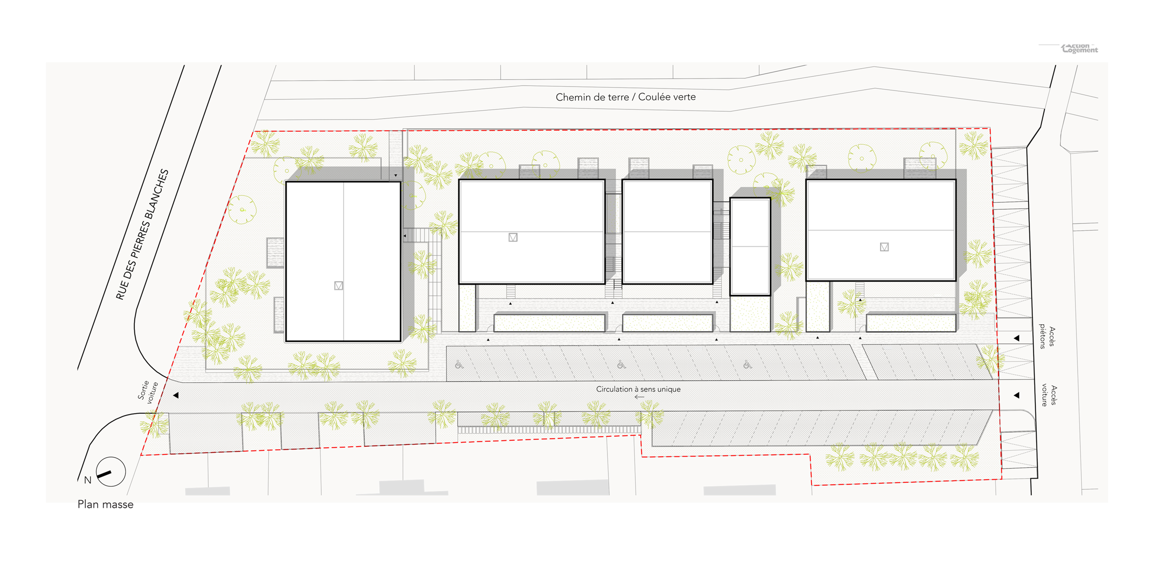 Approche environnementale : La terre végétale a été conservée pour créer des jardins surélevés accueillant une biodiversité augmentée. Les logements traversant et le système structurel offrent un confort hygrothermique important. Les bâtiments en R+2 sans ascenseur, favorisent l’inscription dans l’environnement, limitent les masques solaires et réduisent les charges. Les toitures végétalisées contribuent à l’hydraulique douce. Pour minimiser la maintenance, aucun équipement technique n’est en toiture. La peau extérieure du bâtiment en lattis de hêtre thermo-chauffé contribue à inscrire le projet en classe bas carbone.