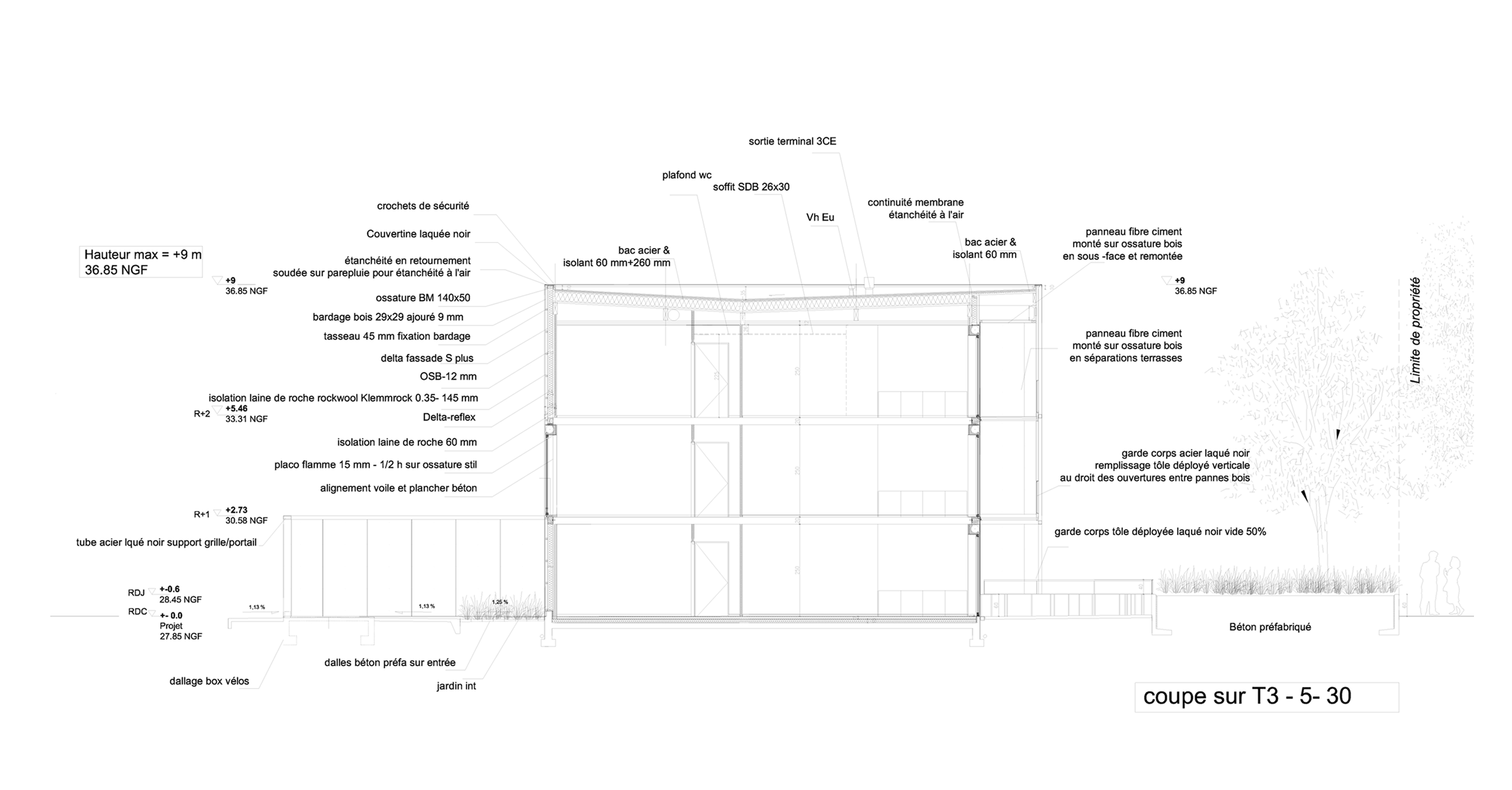 Descriptif technique : Le système structurel est constitué de voile béton en refends et planchers, de murs à ossature bois en façades, d'une charpente bois, d'un bac acier, d'une isolation rapportée et d'une membrane d'étanchéité avec sédum sur RDC. Trois matériaux extérieurs caractérisent le projet dans son rapport au sol. Le béton brut en sous bassement, les plaques minérales teintées dans la masse sur les RDC, le lattis bois vertical en R+1 & R+2. Le bardage en Hêtre abouté de petite section 29x29 est thermo-chauffé à haute température. Constitué de panneaux assemblés sur chantier, aucune fixation n’est visible. NF Logement Démarche HQE