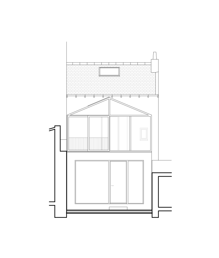 Approche environnementale : Pour des raisons d'économies, le système de chauffage au gaz a été conservé. La maison existante, très mal isolée, sur sa façade sud-ouest, se voit avec cette extension serre complètement remodelée et améliorée. La maison très sombre devient très lumineuse par l'agrandissement des murs maçonnés existants et l'ajout d'une grande fenêtre de toit dans le puit de lumière central. Ces ouvertures et la nouvelle serre créées tourne radicalement la maison vers son jardin.