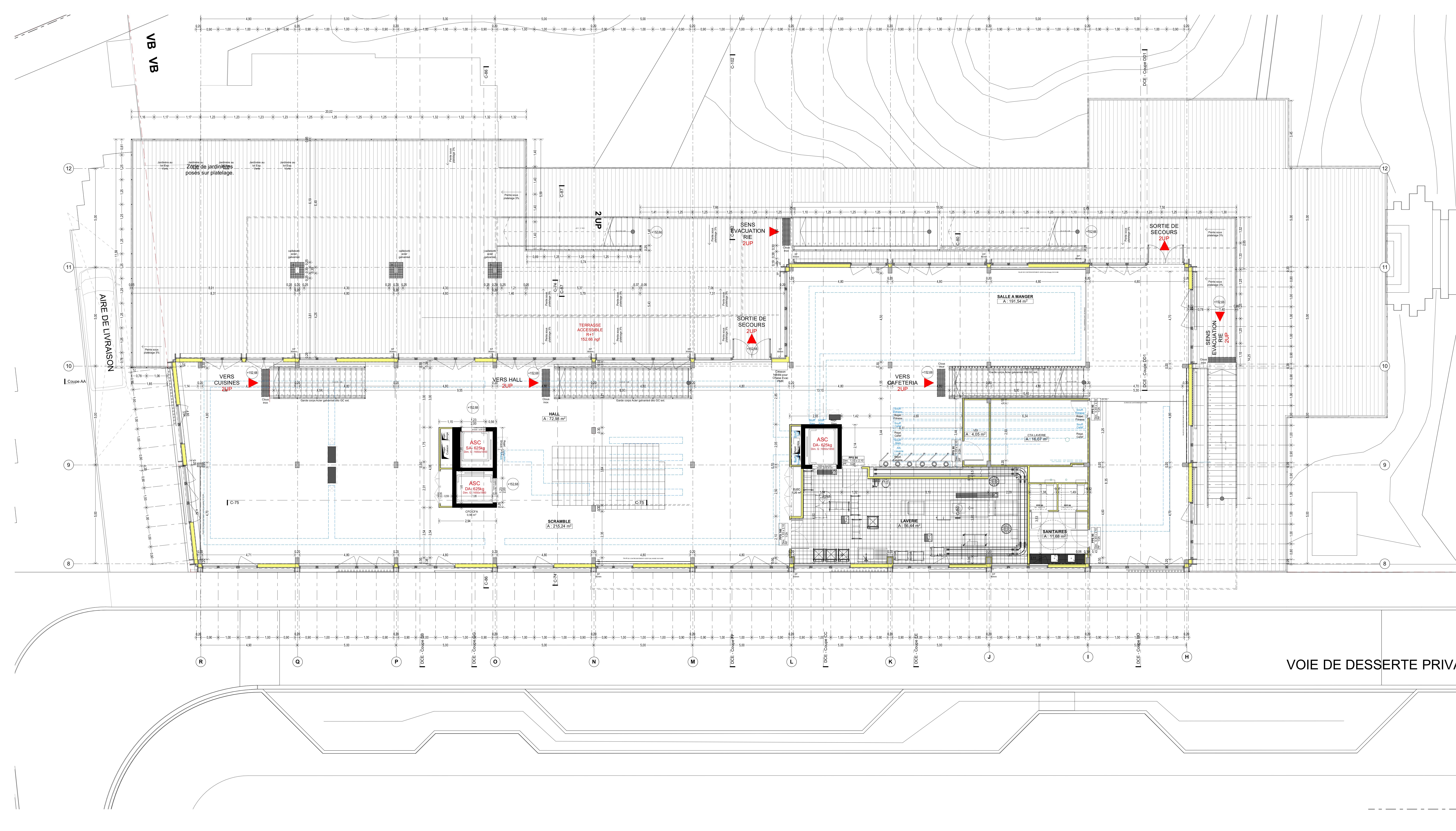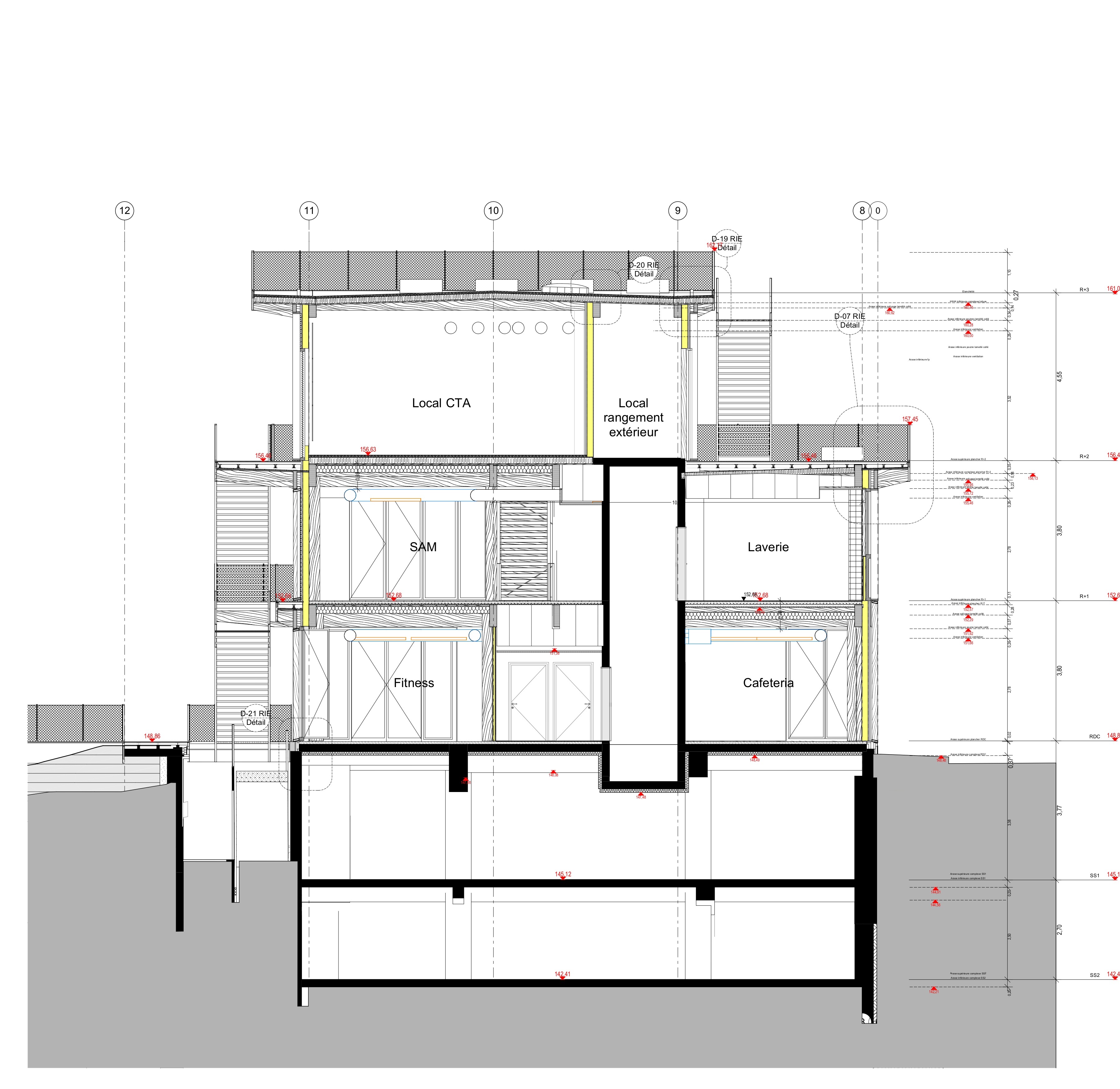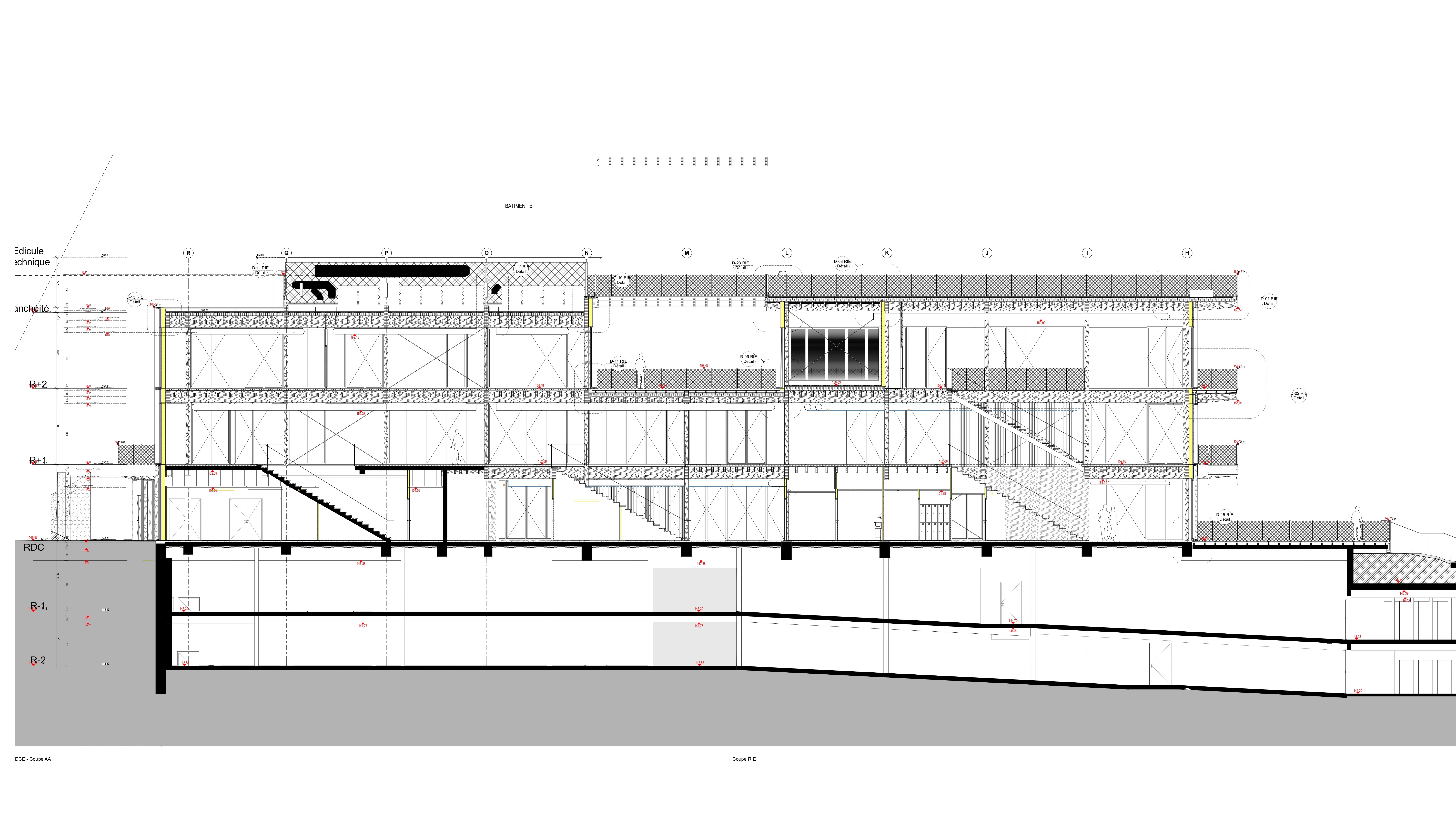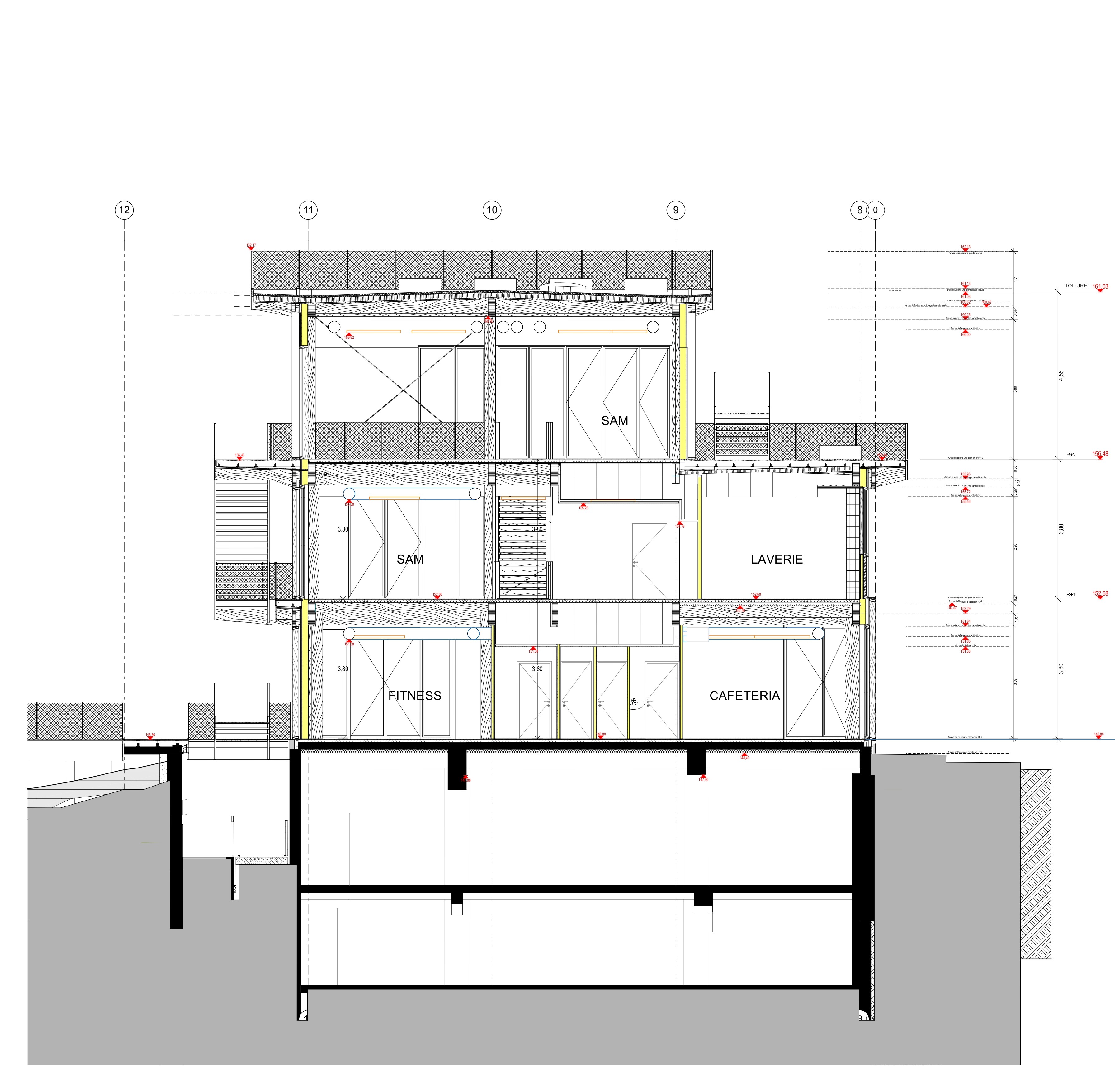 Descriptif technique : L’idée : éviter l’utilisation du CLT. Les planchers sont constitués de panneaux LVL (+ chape) posés sur des solives en épicéa. Entre ces solives sont apposés des baffles acoustiques. Poutres et poteaux sont en lamellé collés d’épicéa. Les poutres se prolongent de l’intérieur vers l’extérieur, accueillant les terrasses (étanchées et couvertes d’un platelage bois) et balcons. Les façades sont constituées d’éléments en ossature bois non porteurs bardés de clins en faux claire voie autoclave. Châssis bois et éléments brises soleil fixes sont un défi technique : élancement de plus de 3m de haut.