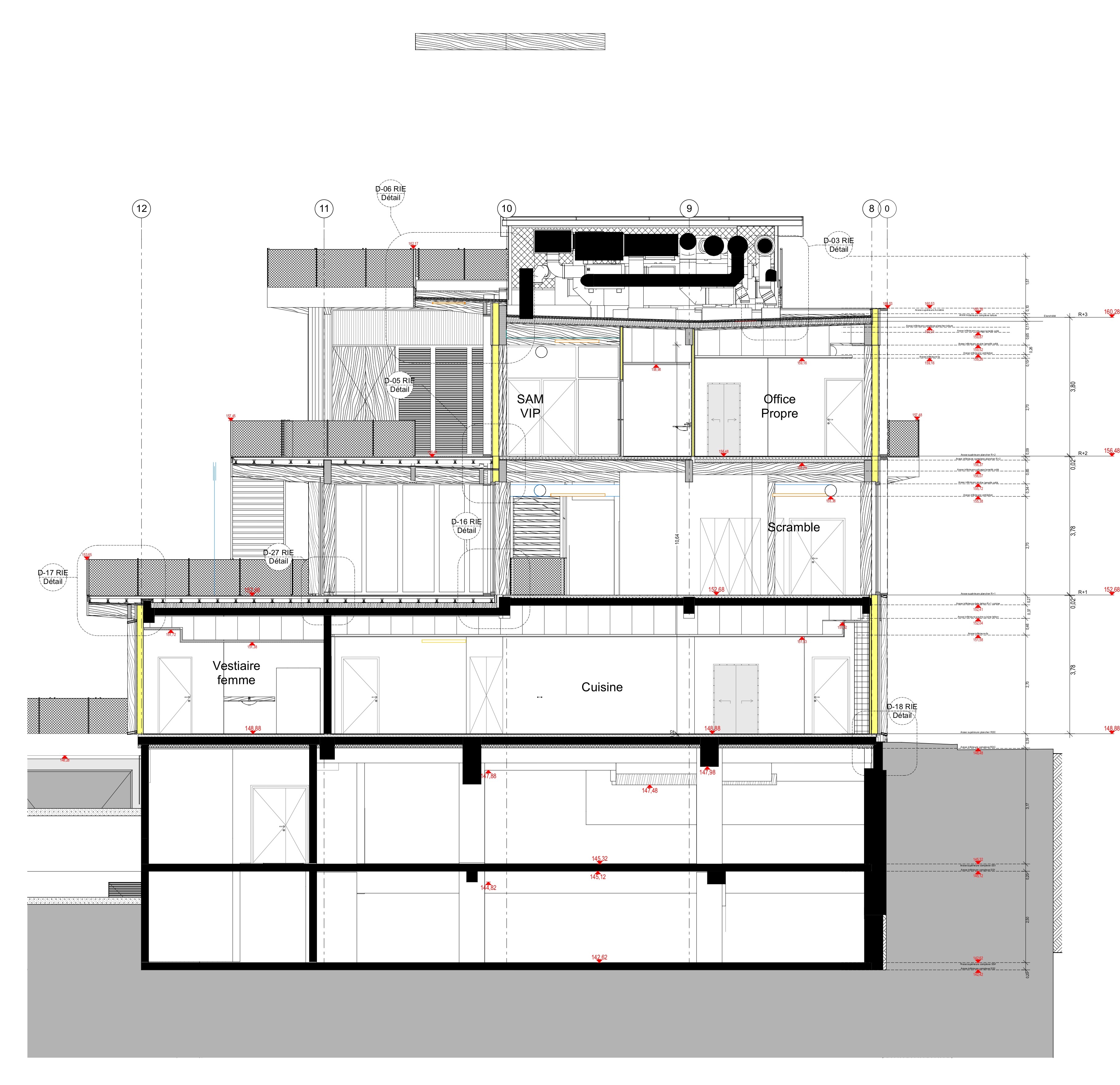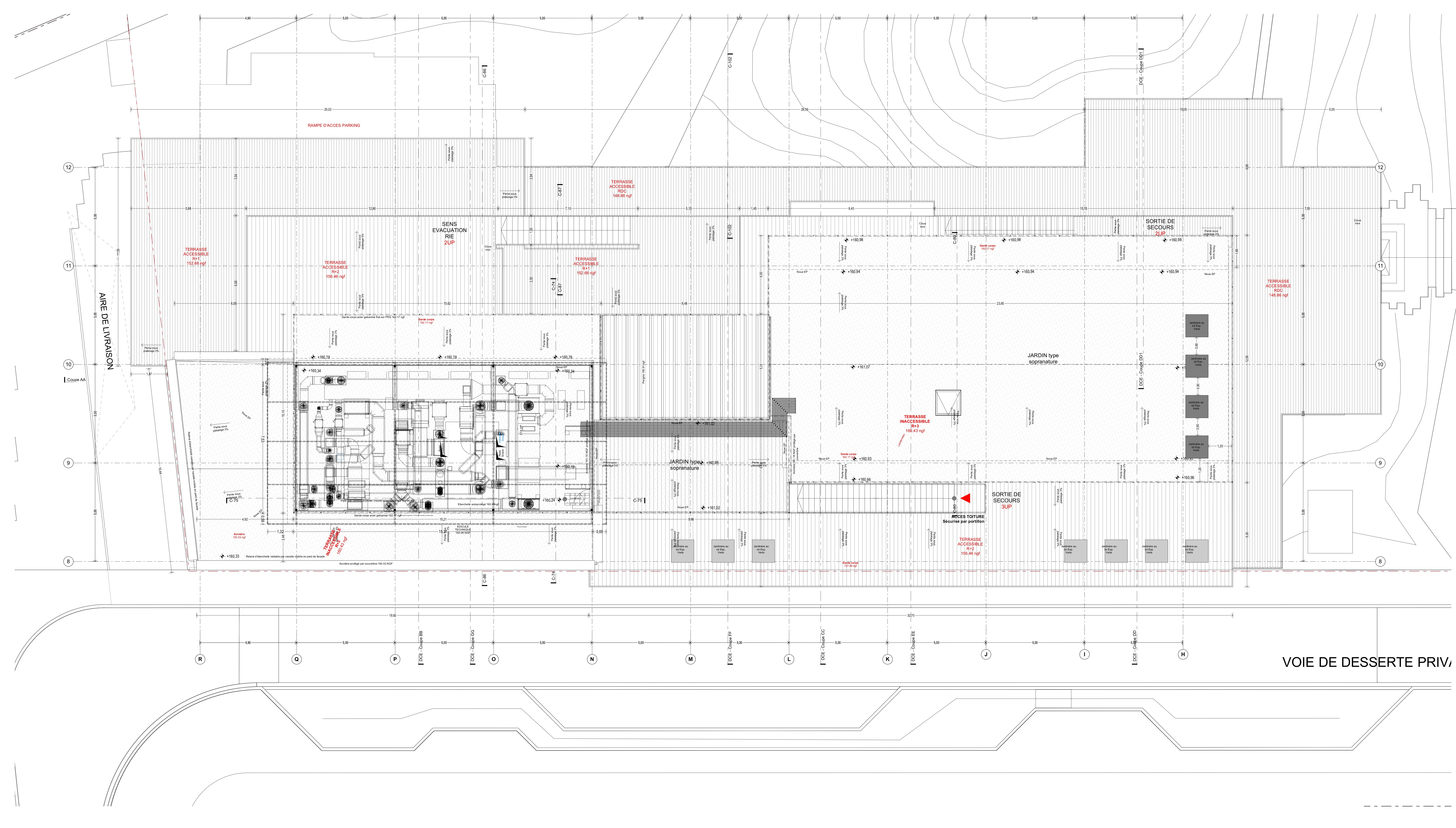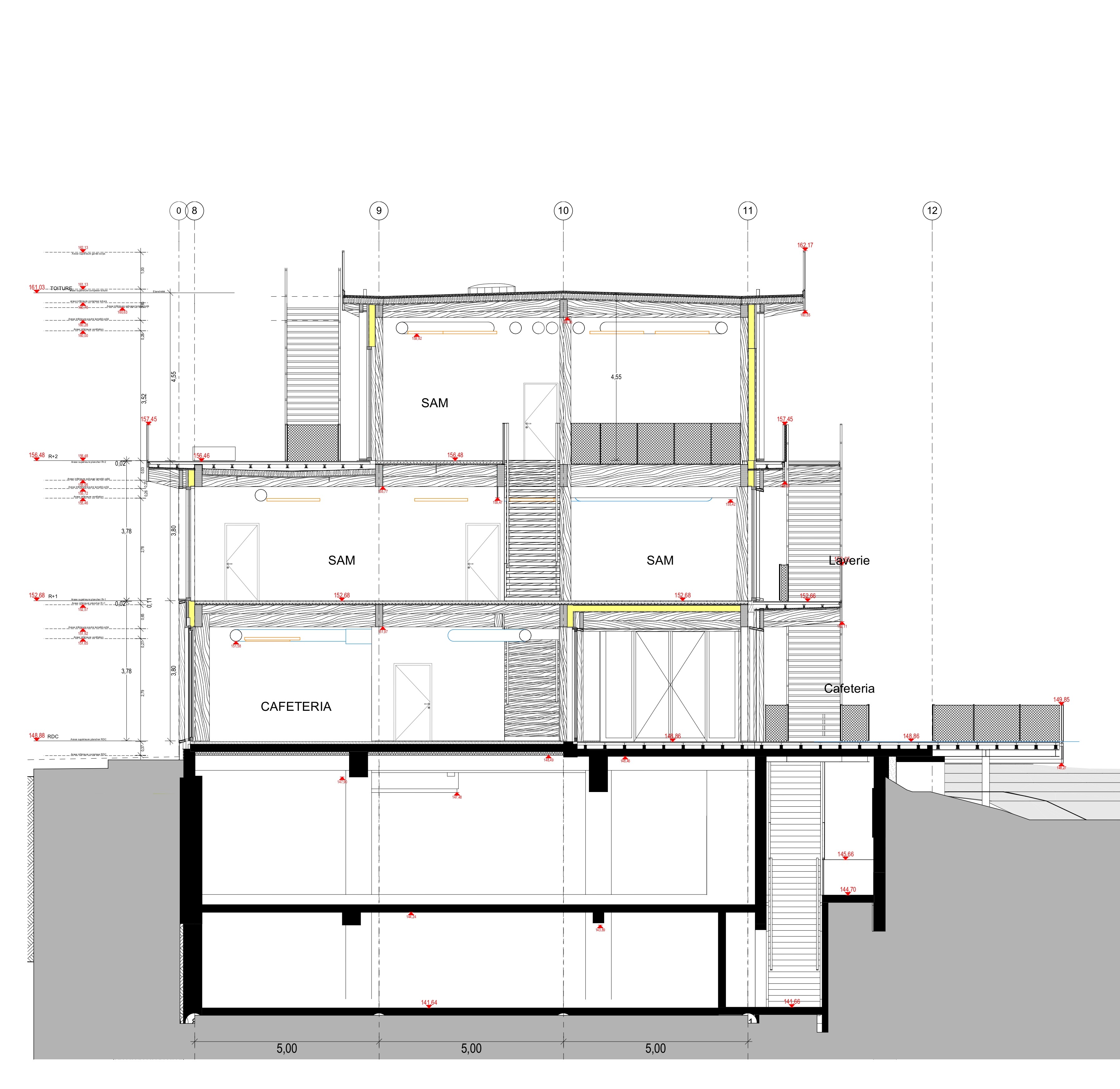 Approche environnementale : Hymne à la plasticité du bois mélèze+épicéa, dans une démarche bas carbone, ce projet est frugal, low tech. Application simple de la RT2012, il a été conçu comme un pavillon japonais dans un jardin, en écho au parc avoisinant. Et dans cet esprit, le choix affirmé du bois comme matériau constructif a conduit à prendre en compte, dès le départ, les contraintes inhérentes au bois, sans subterfuge technologique. Chaque élément structurel, technique et fonctionnel a sa place et tout est en bois: poutres poteaux, planchers, solivage, terrasses, couverture, façade, menuiseries, brises soleil.
