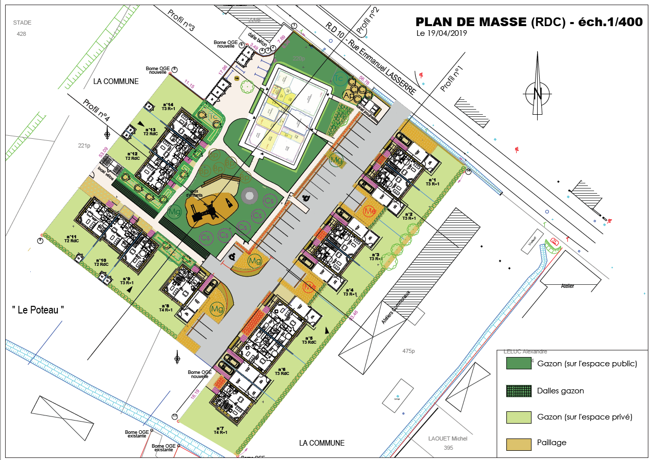 Le programme correspond à la construction de 14 logements individuels de typologie T2 à T4 de volumétrie R0 à R+1. Les façades sont différenciées de manière à individualiser au mieux les logements (ouvertures, couleurs de tuiles, et traitement d'enduits). L'implantation des bâtiments est inspirée de l'ordre urbain des bastides, avec un espace commun central composé d'espaces verts largement arborés, d'un espace de rencontre et de convivialité (table de pique-nique, bancs, table de ping-pong), et d'un parc de stationnement.